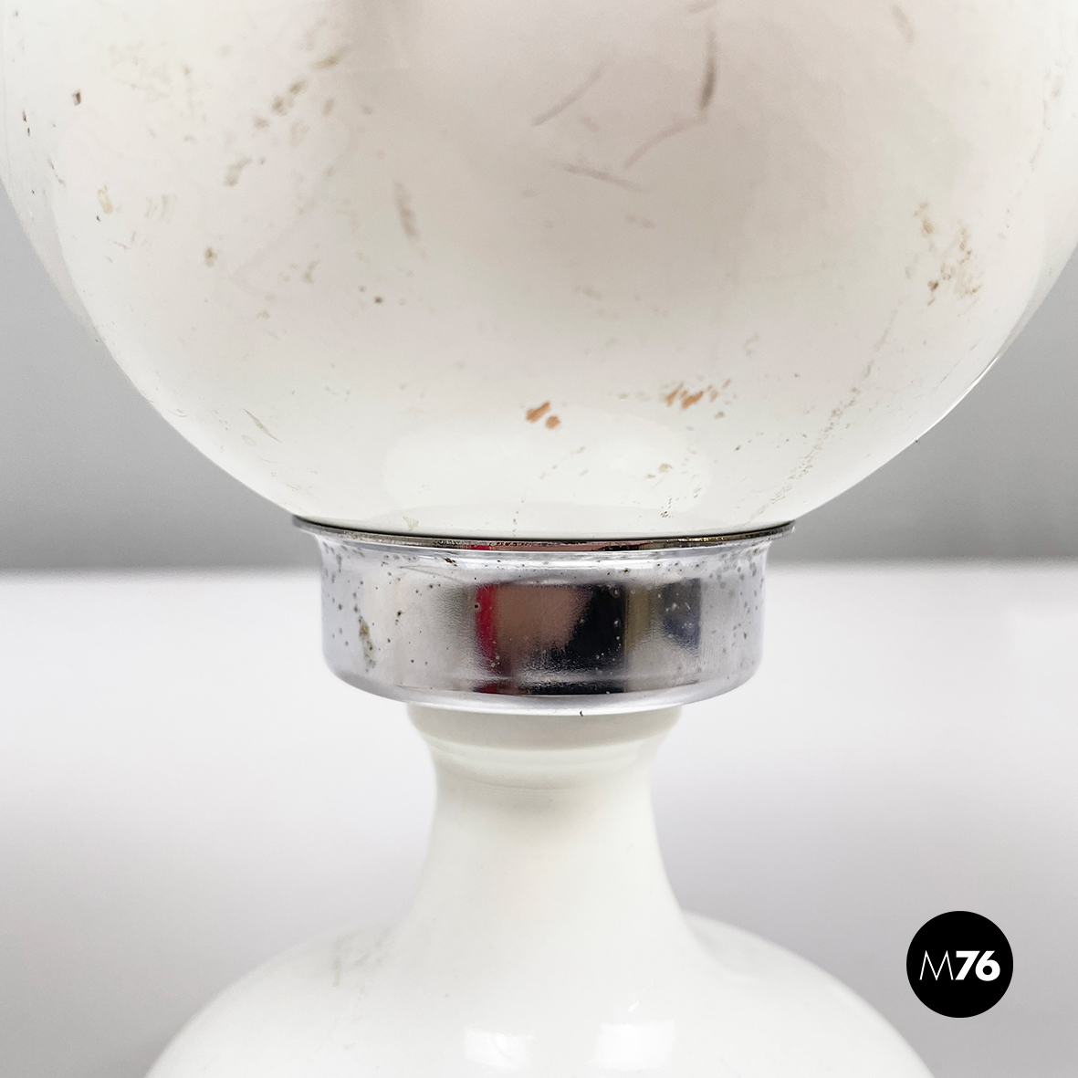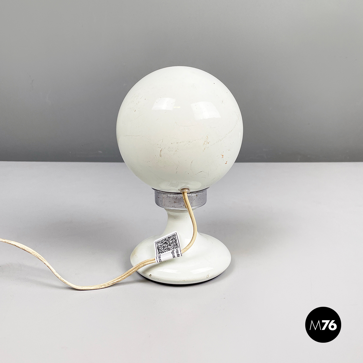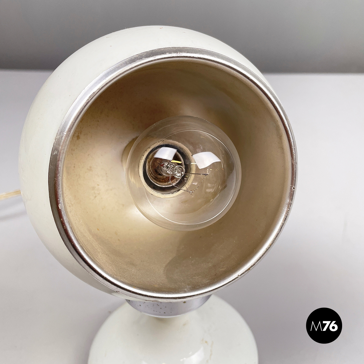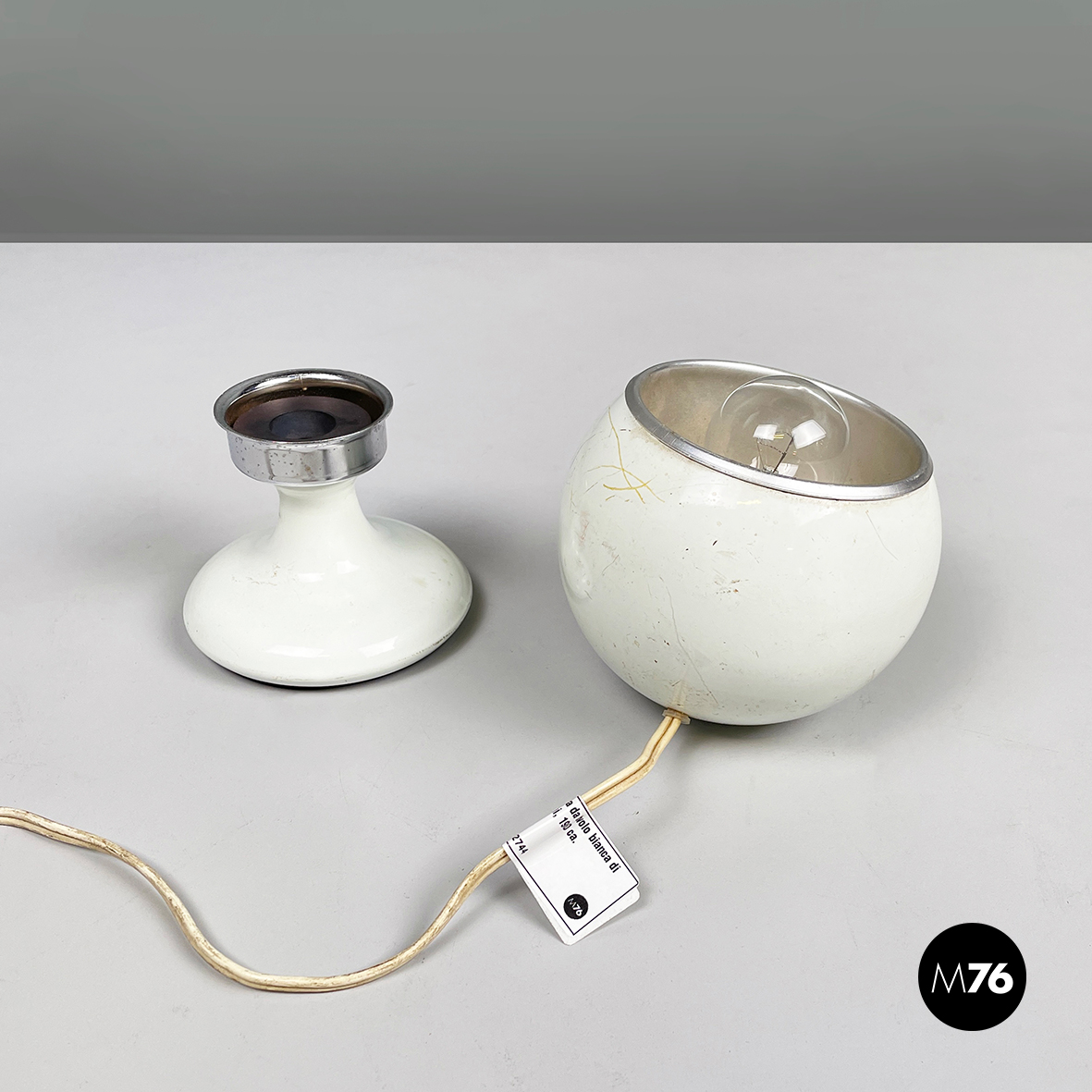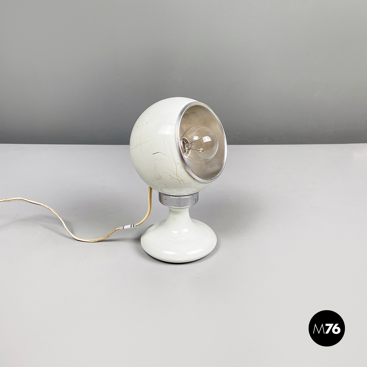Lampada da tavolo orientabile a base tonda in acciaio e metallo verniciato bianco. Il diffusori semi-sferico è unito alla struttura attraverso un attacco magnetico, il quale gli permette di essere posizionate come si preferisce. La struttura si assottiglia al centro e si allarga verso la base.