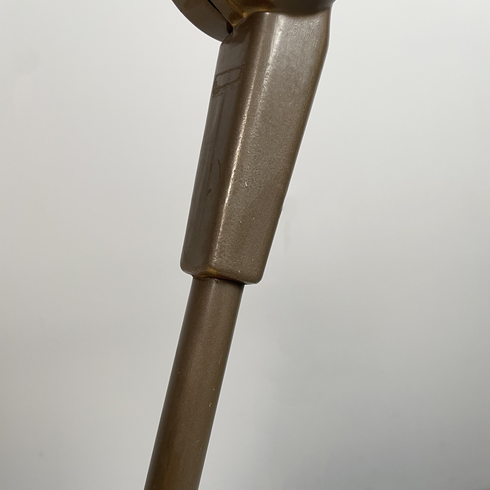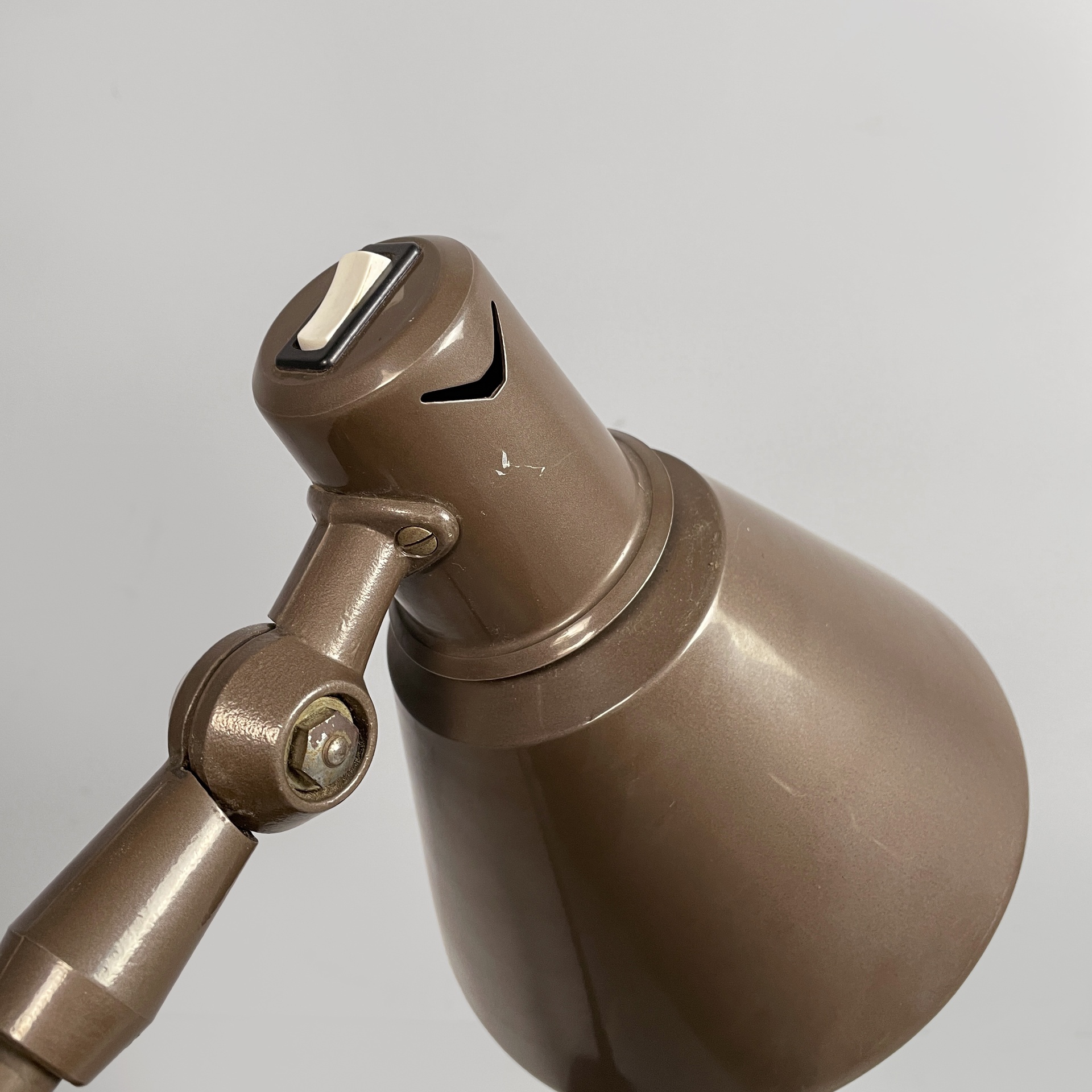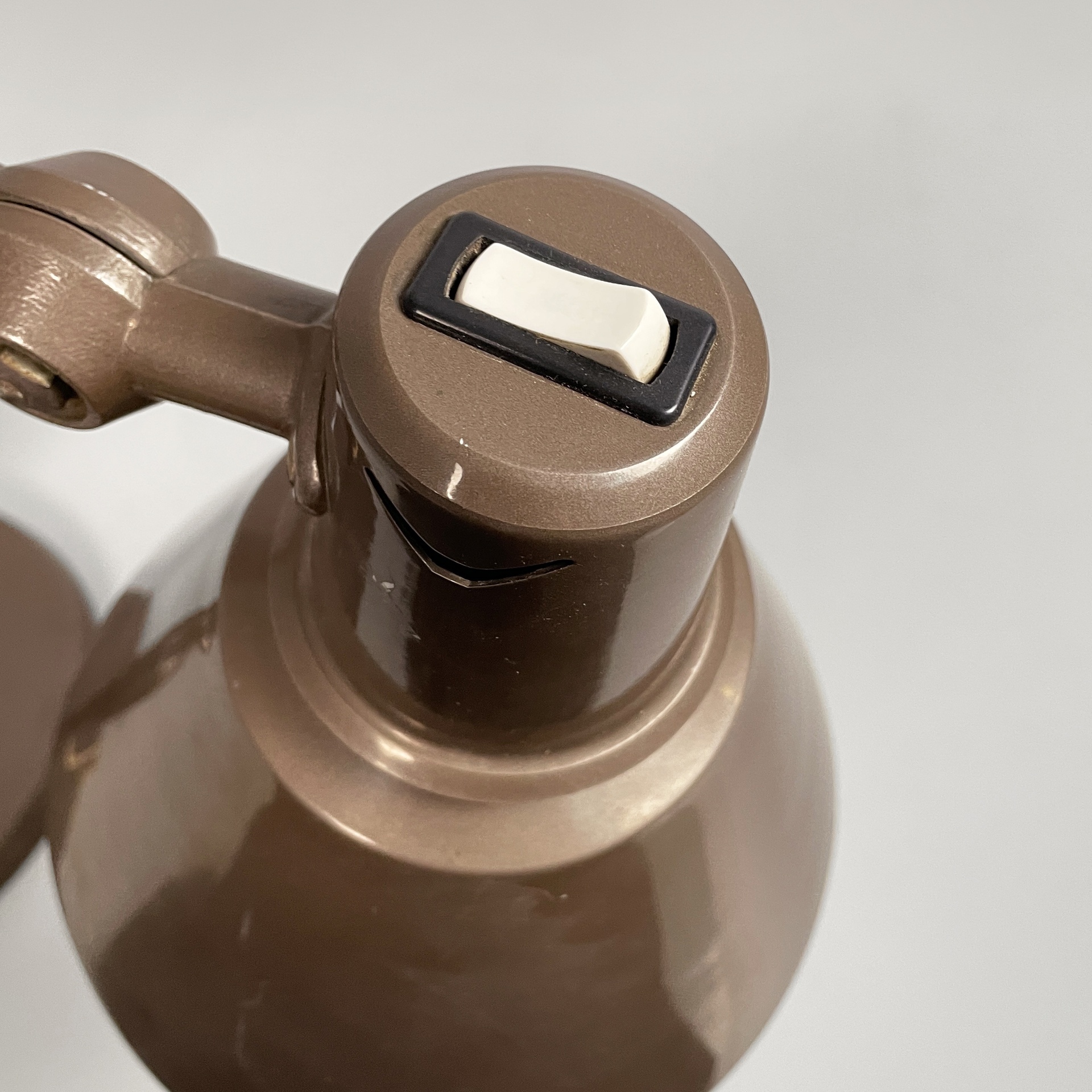 Lampada da tavolo orientabile con paralume a base tonda in metallo bianco internamente e marrone esternamente. Interruttore presente sopra il diffusore. La struttura è composta da due bracci mobili. Base tonda in metallo marrone.