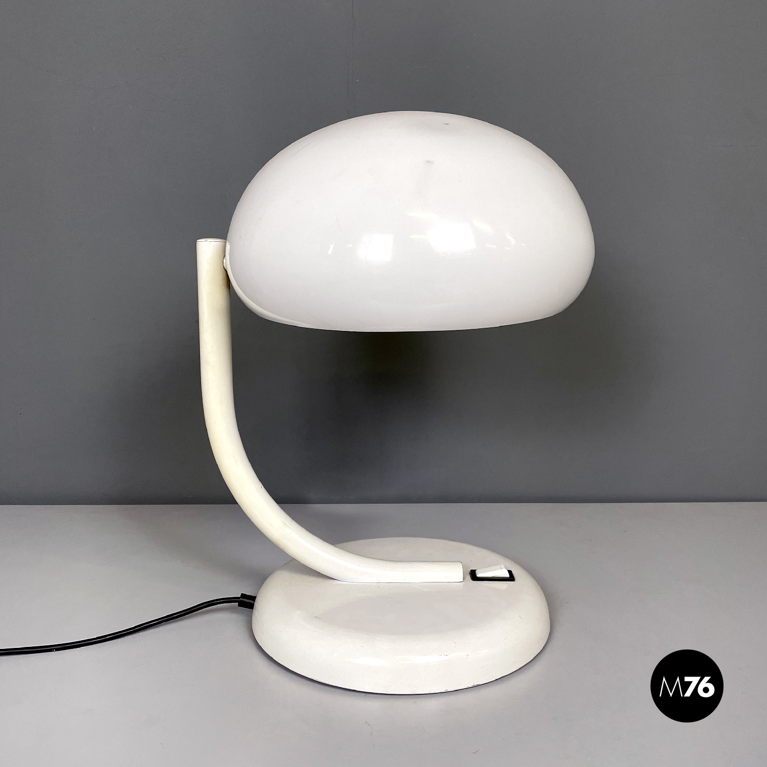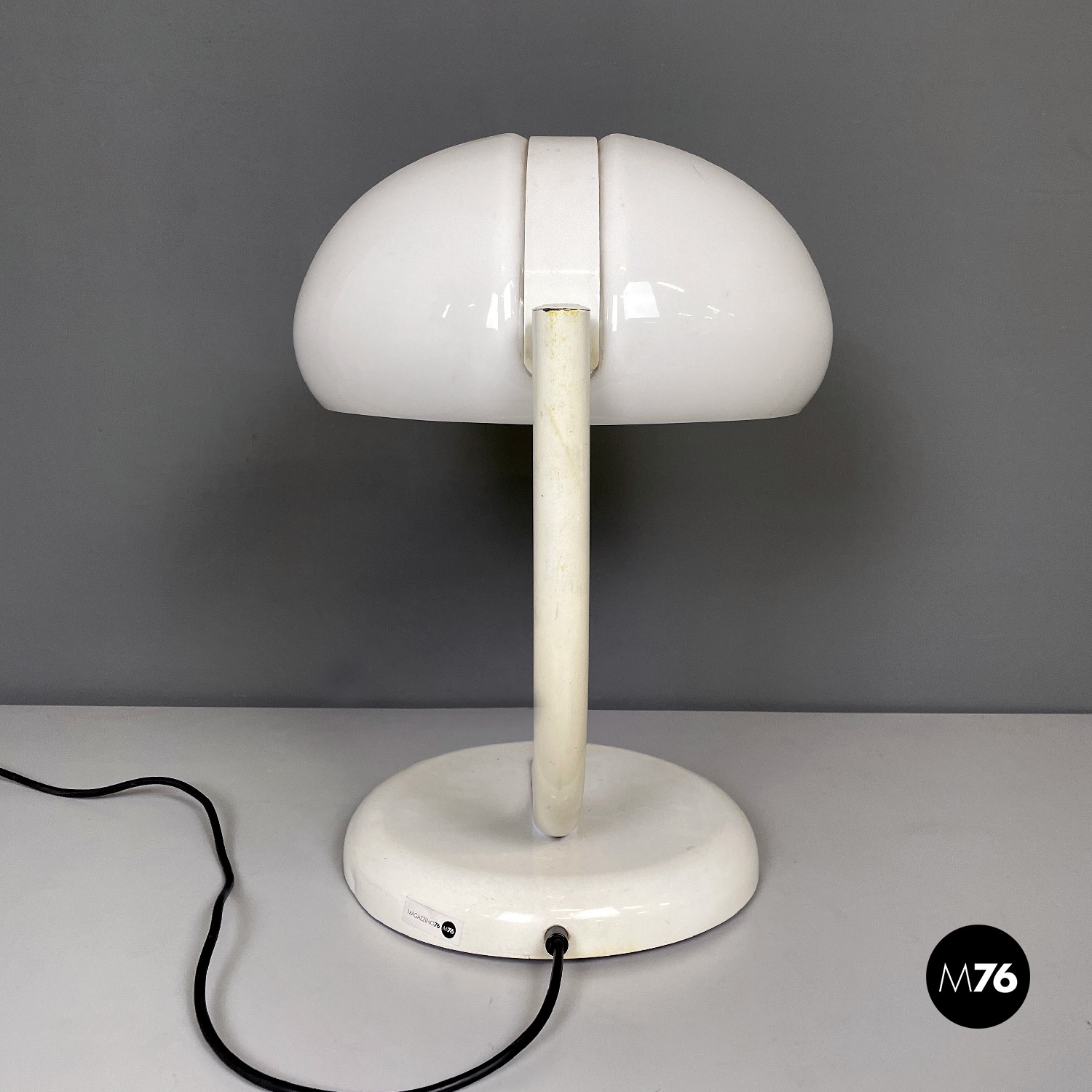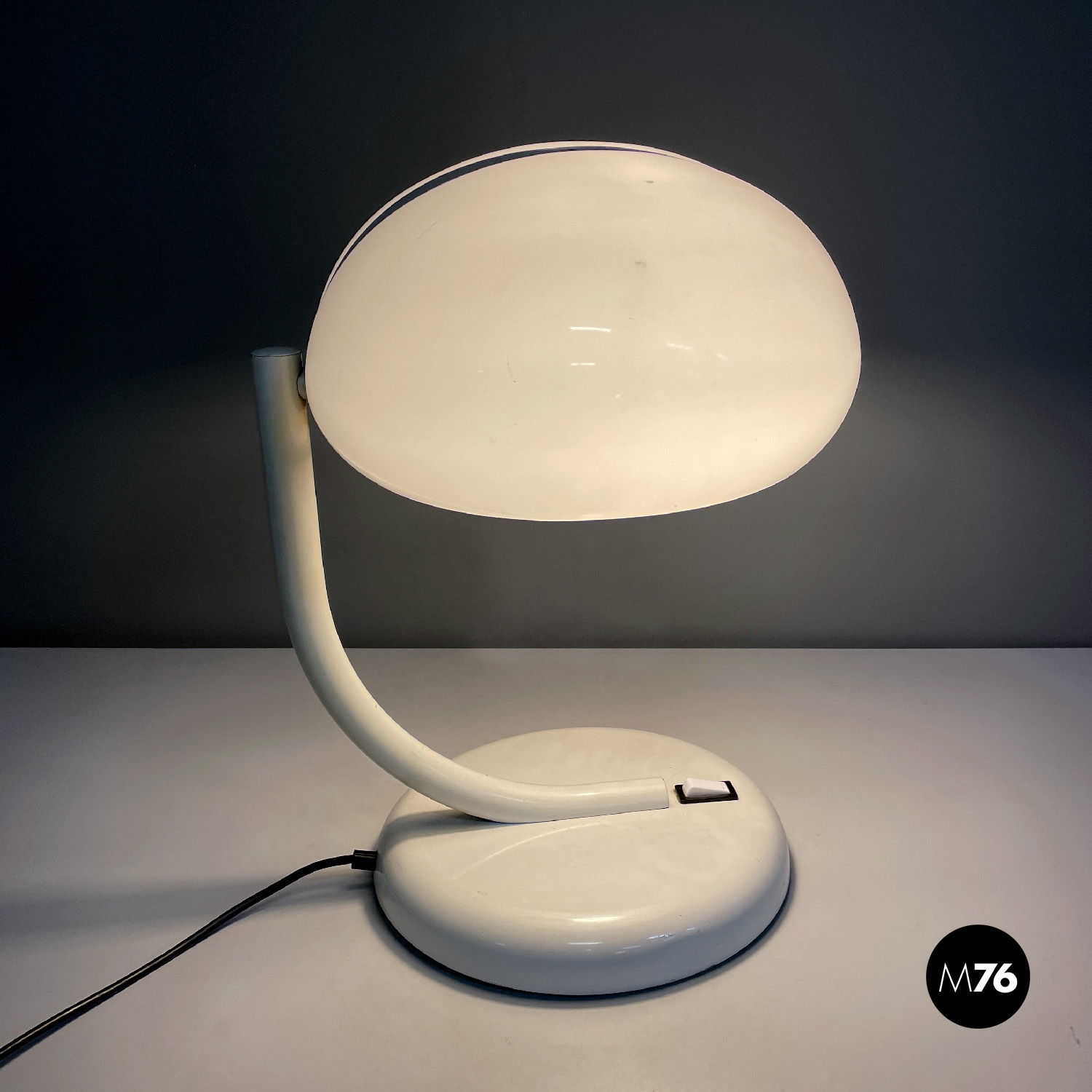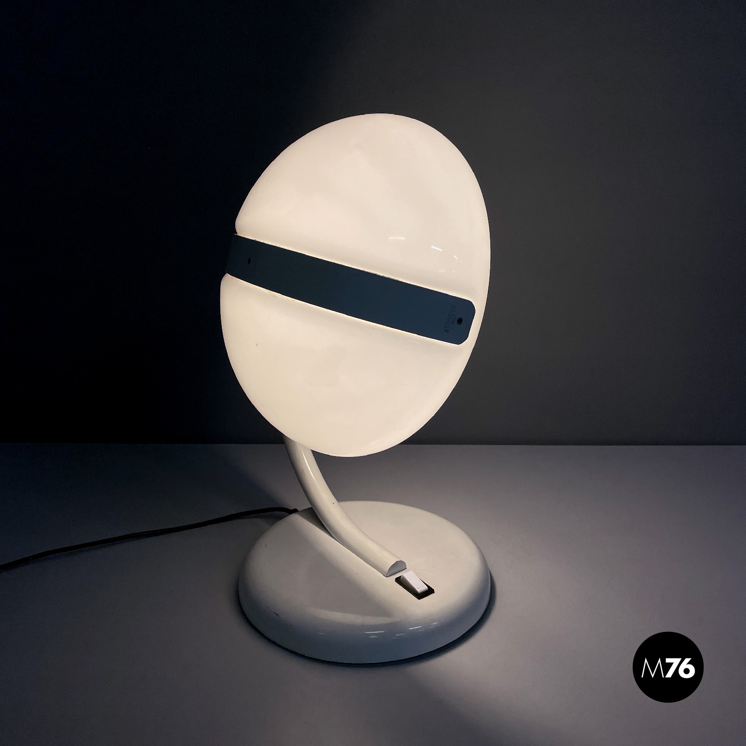 Lampada da tavolo a base tonda. Il paralume in plexiglass bianco è a forma di cupola, nella parte superiore è abbracciato da un listello in metallo laccato bianco che si unisce al braccio tubolare curvo della lampada, anch’esso laccato bianco. Il diffusore è orientabile.
