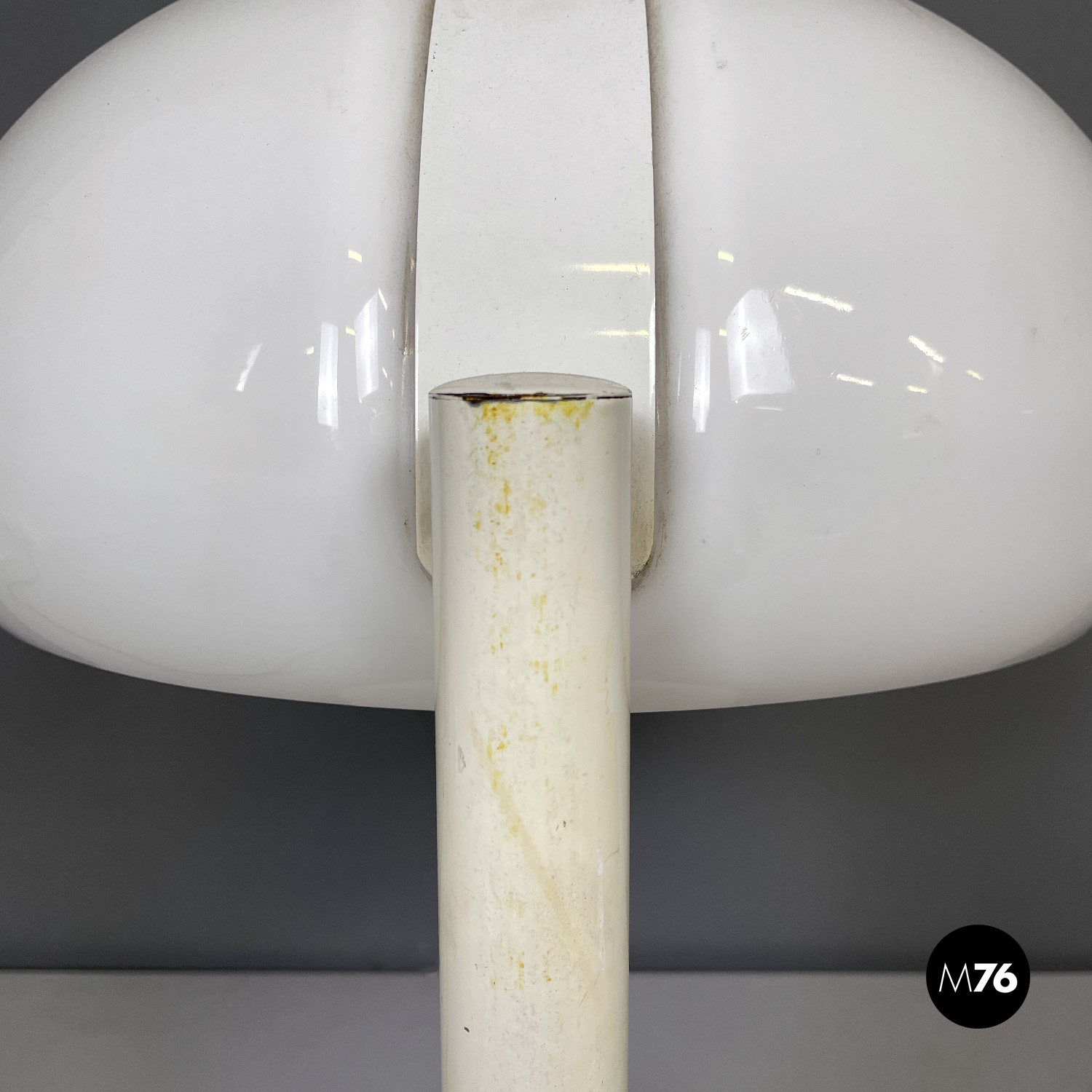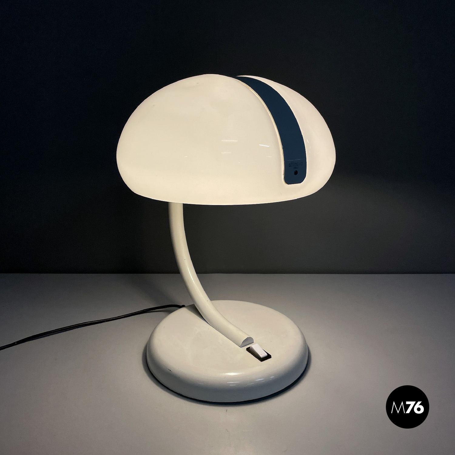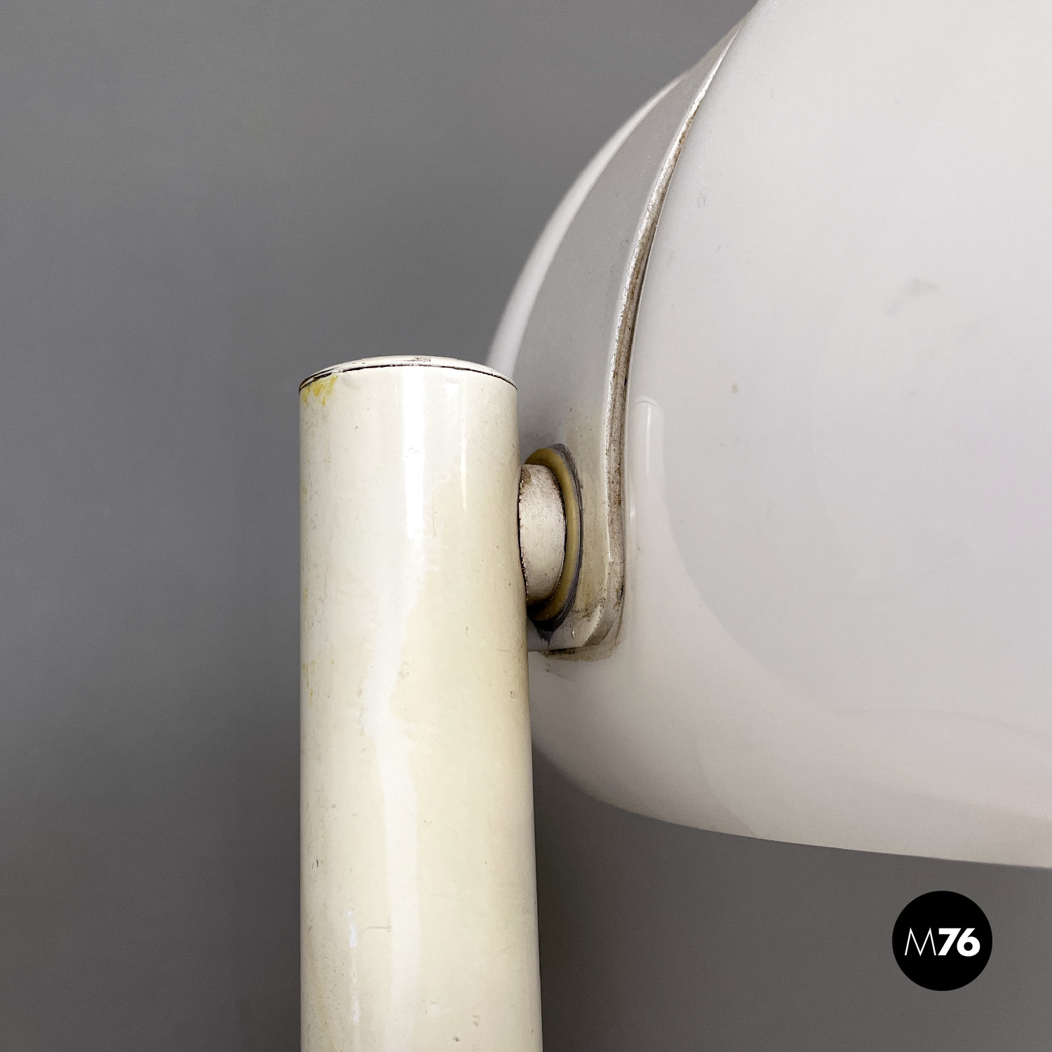 Lampada da tavolo a base tonda. Il paralume in plexiglass bianco è a forma di cupola, nella parte superiore è abbracciato da un listello in metallo laccato bianco che si unisce al braccio tubolare curvo della lampada, anch’esso laccato bianco. Il diffusore è orientabile.