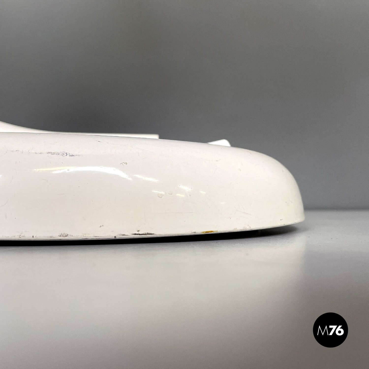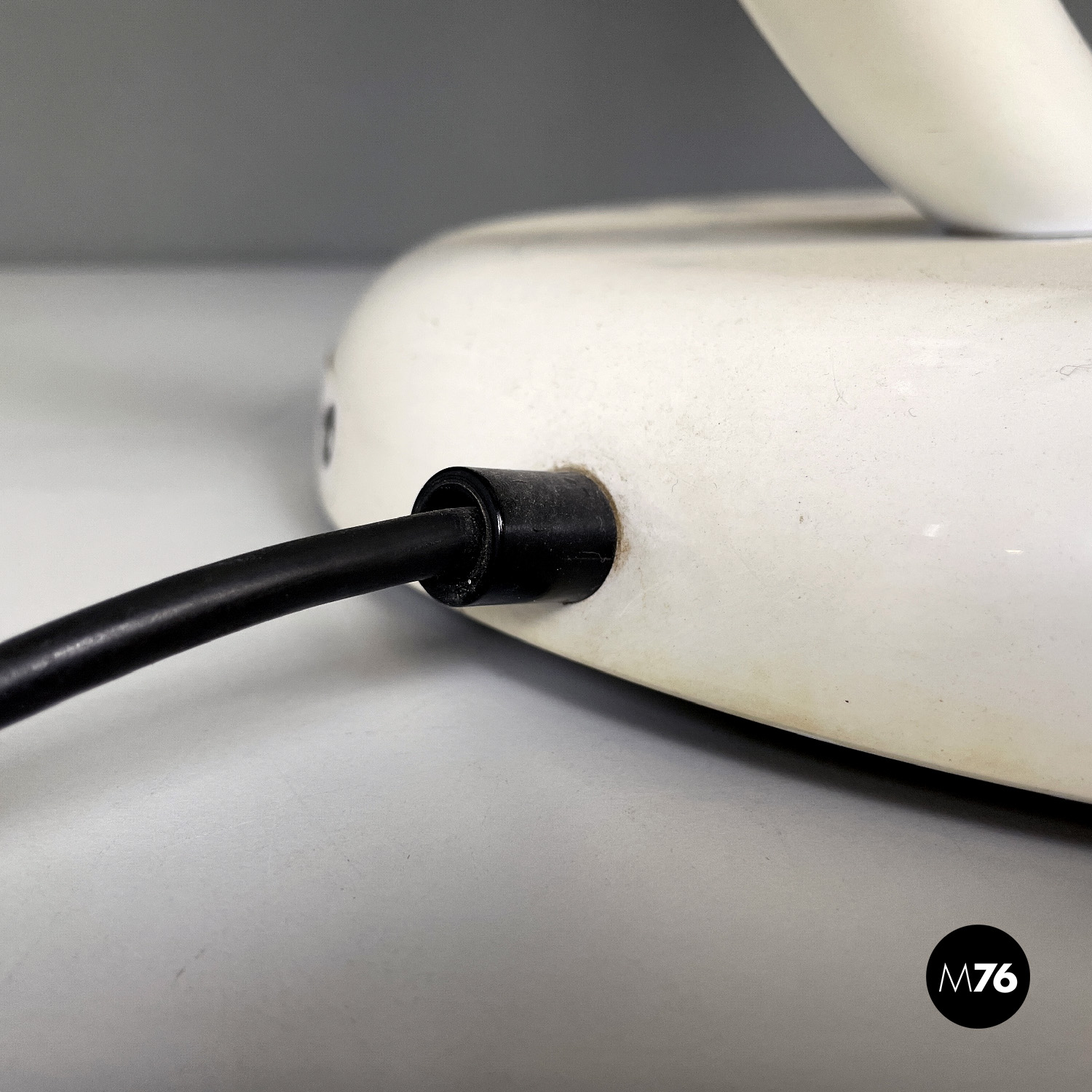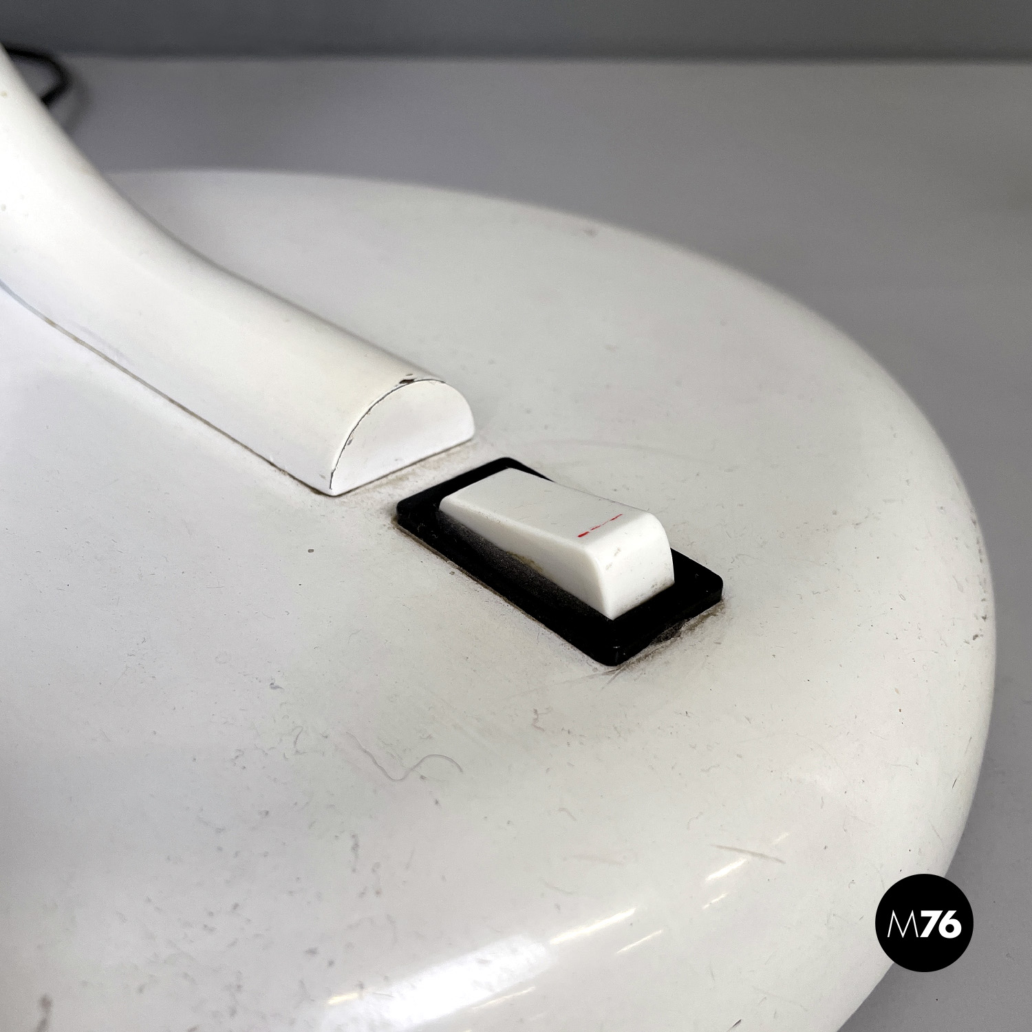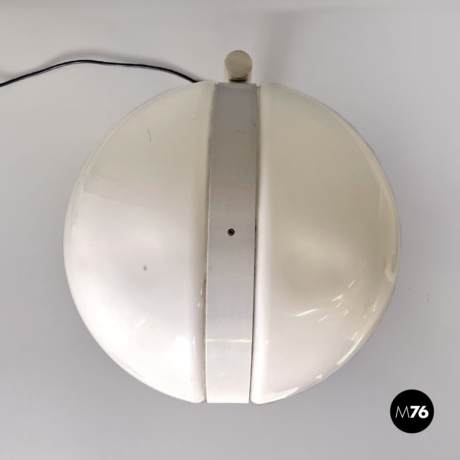 Lampada da tavolo a base tonda. Il paralume in plexiglass bianco è a forma di cupola, nella parte superiore è abbracciato da un listello in metallo laccato bianco che si unisce al braccio tubolare curvo della lampada, anch’esso laccato bianco. Il diffusore è orientabile.