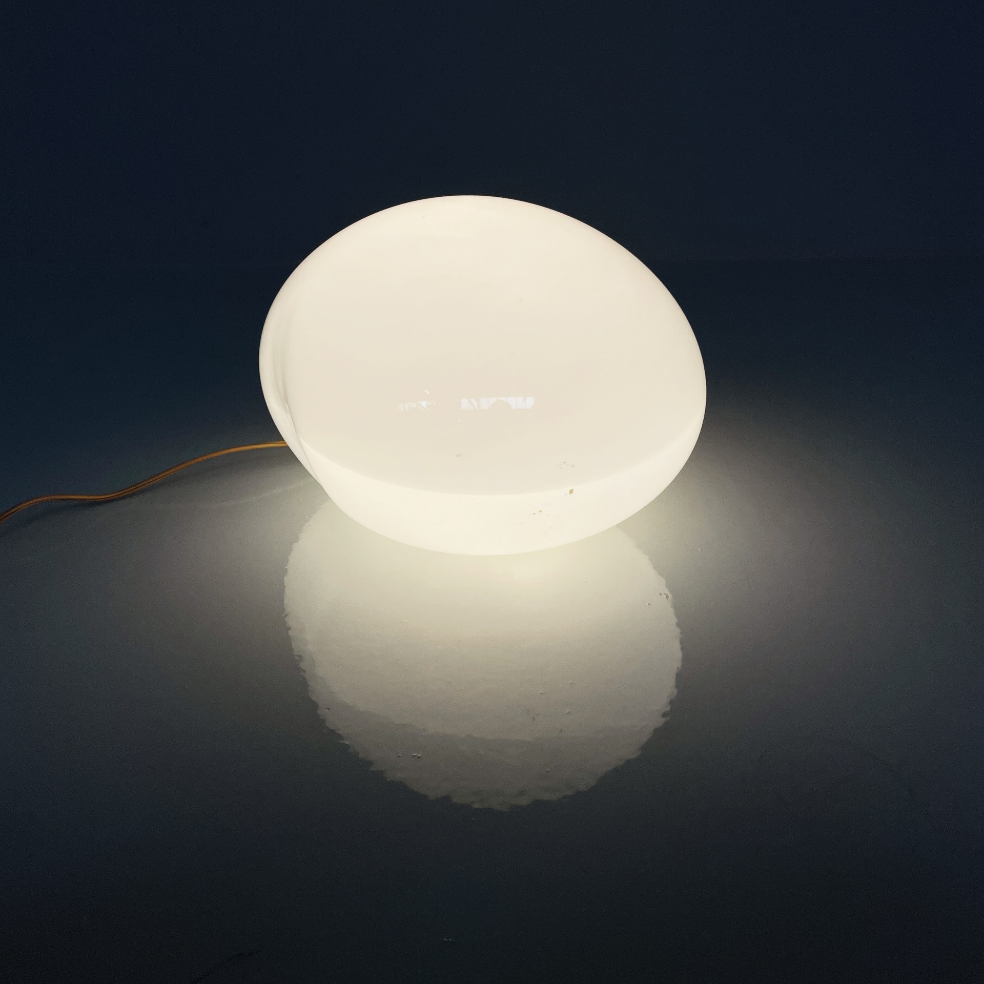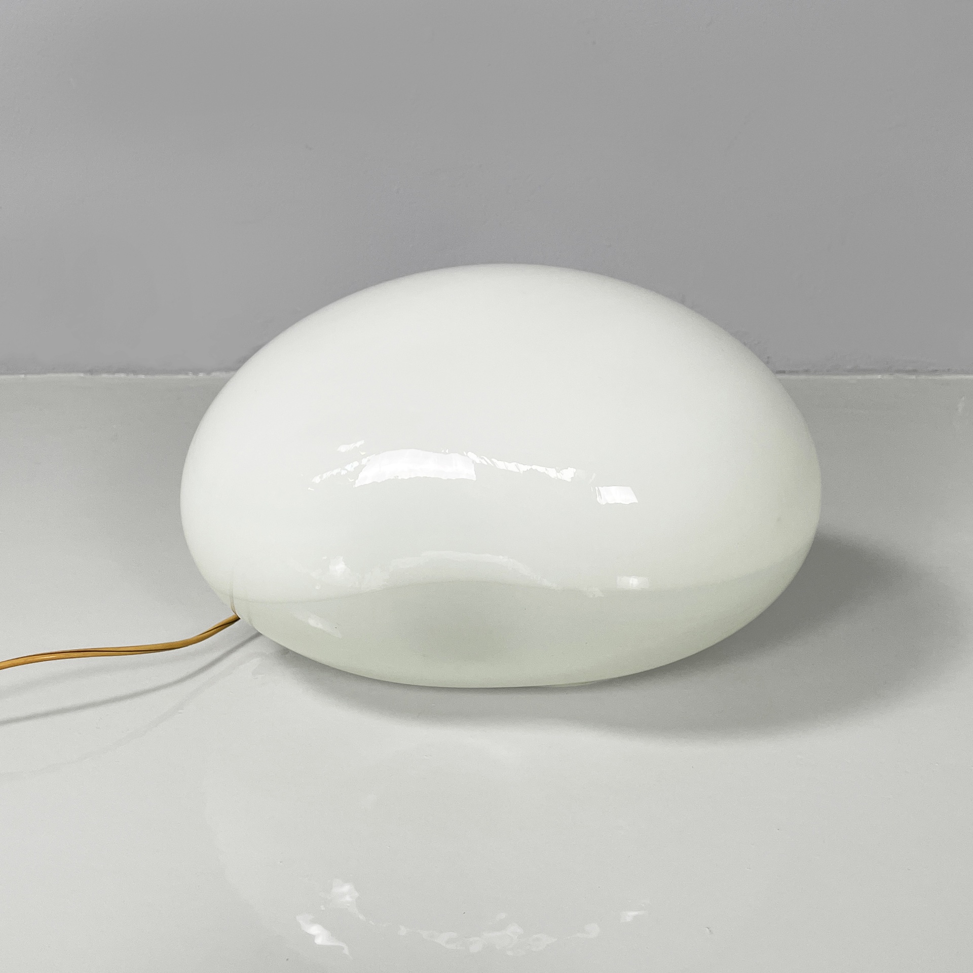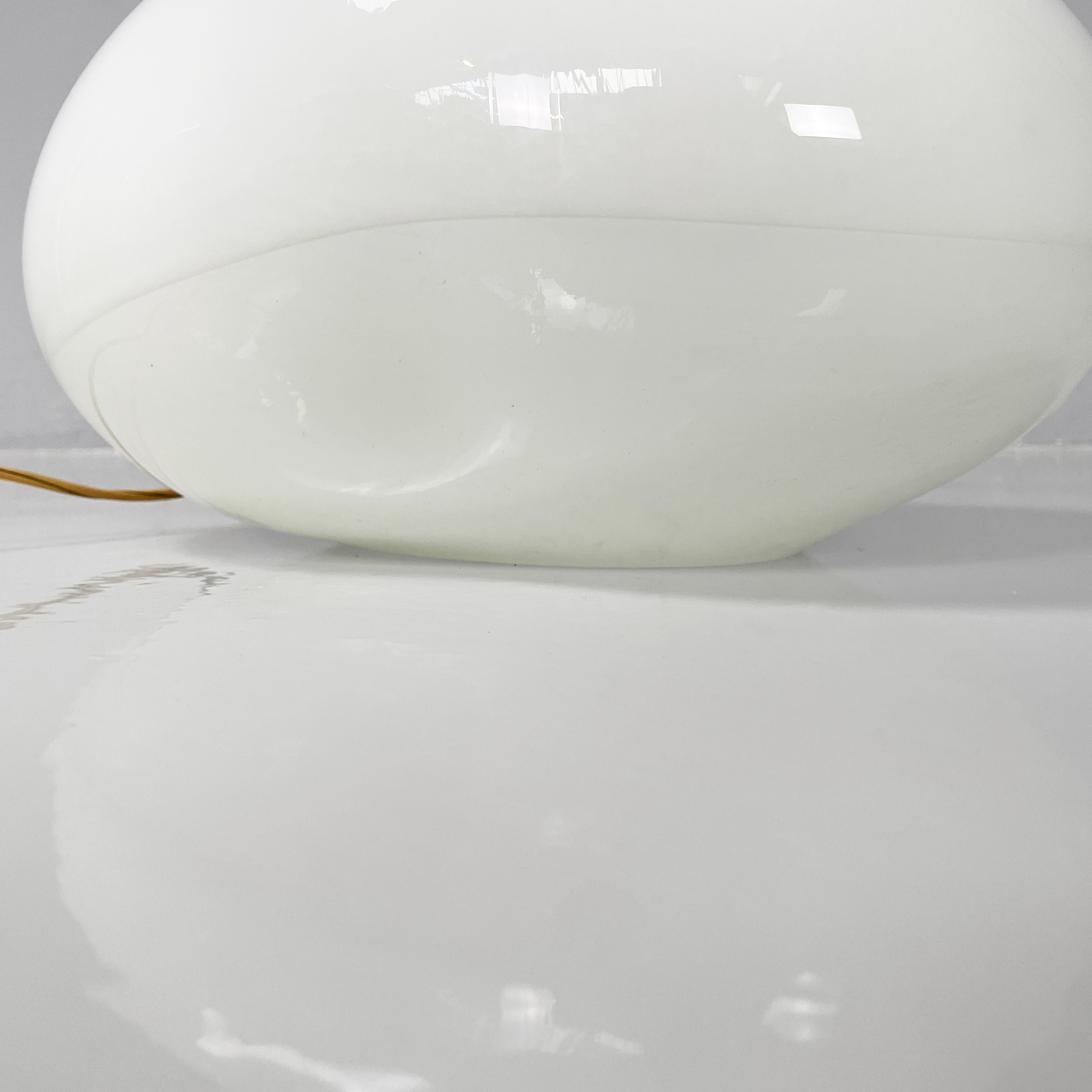 Lampada da tavolo a base ovale in vetro opalino. La forma tondeggiante presenta una leggera curvatura su un lato. Alla base è presente una fascia in vetro opalino decorativa. Appartenente al period Space Age.