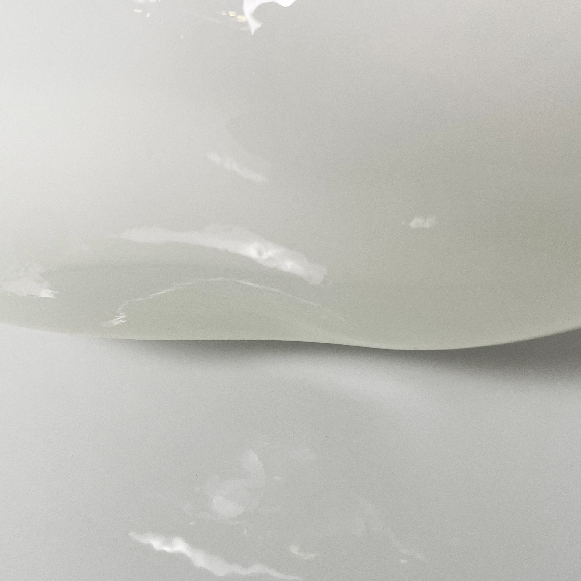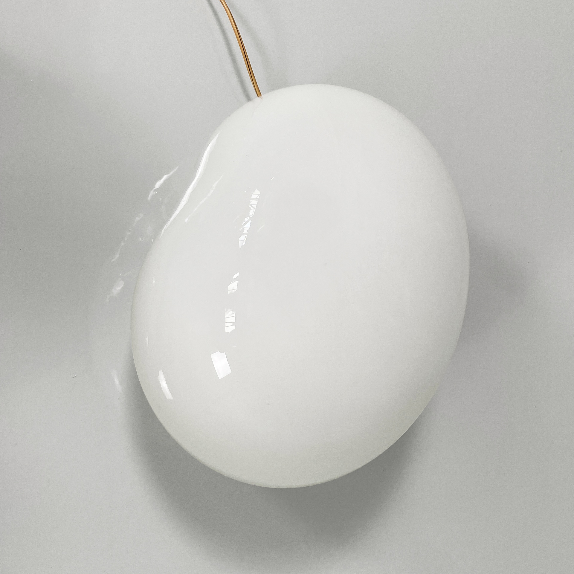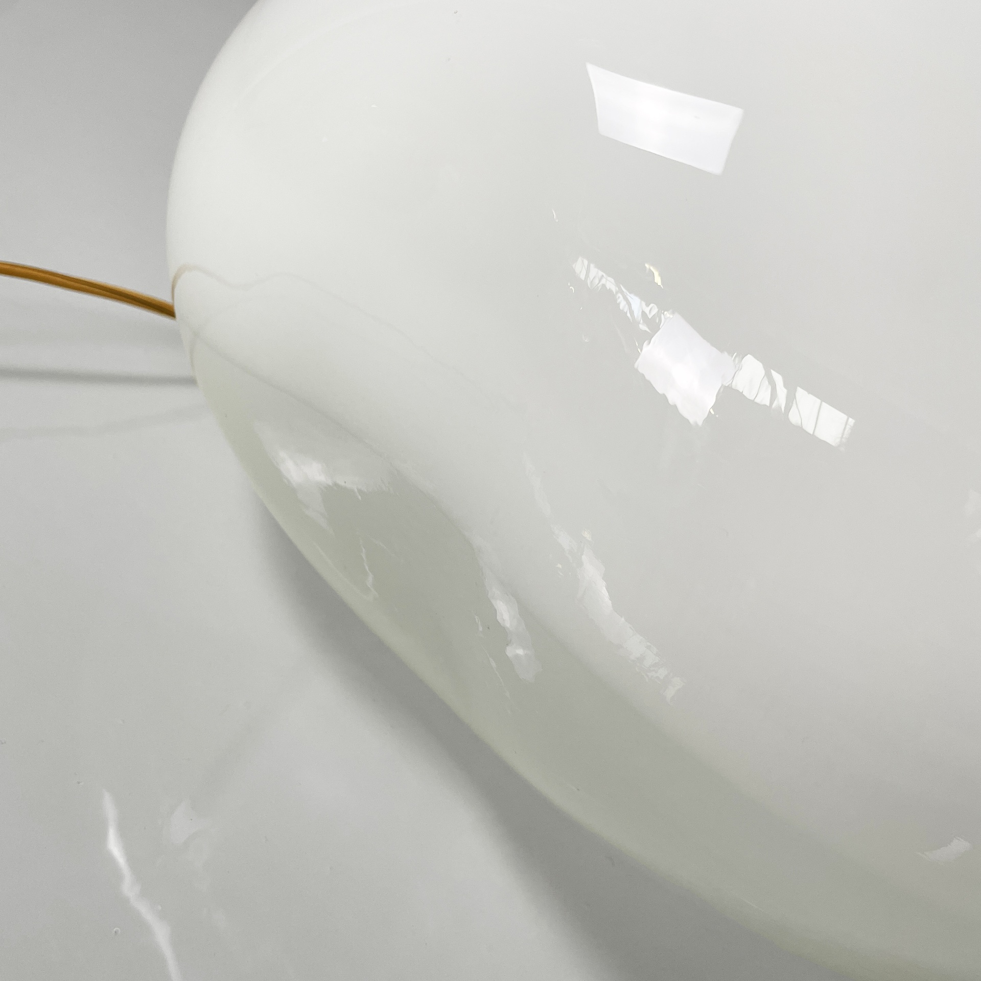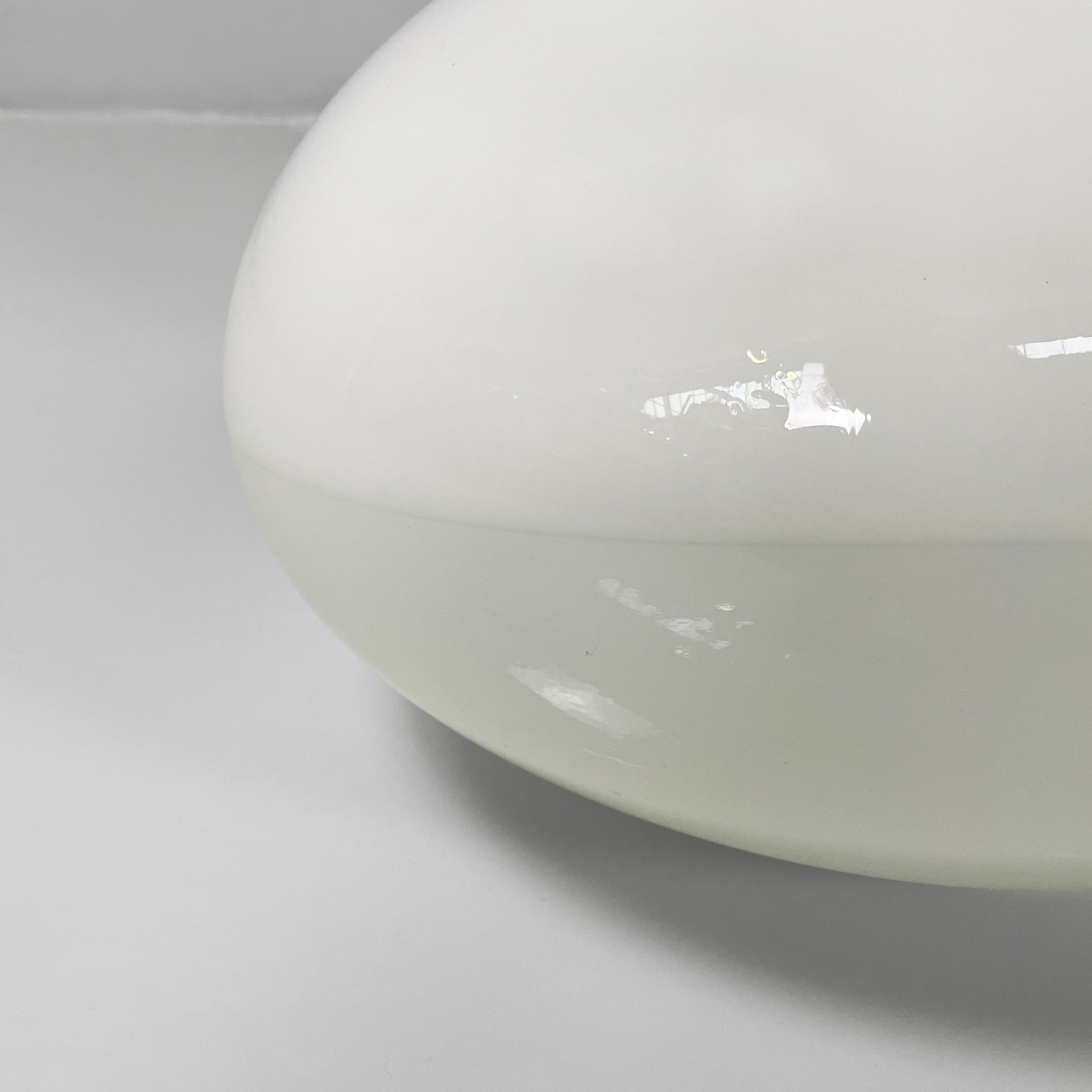 Lampada da tavolo a base ovale in vetro opalino. La forma tondeggiante presenta una leggera curvatura su un lato. Alla base è presente una fascia in vetro opalino decorativa. Appartenente al period Space Age.