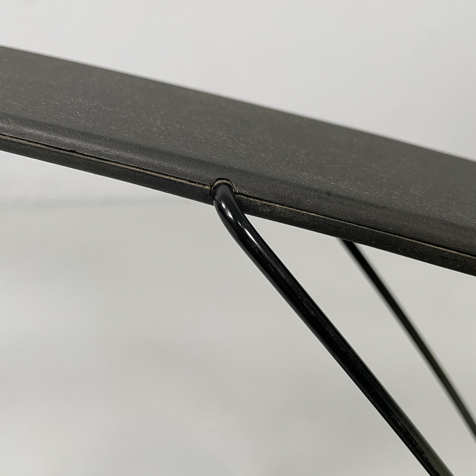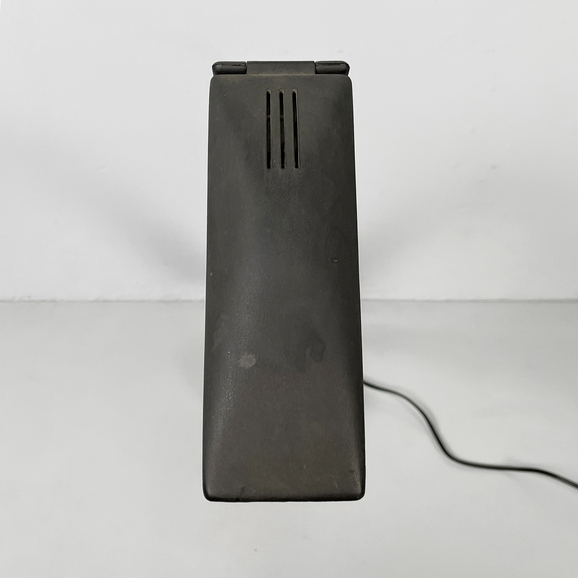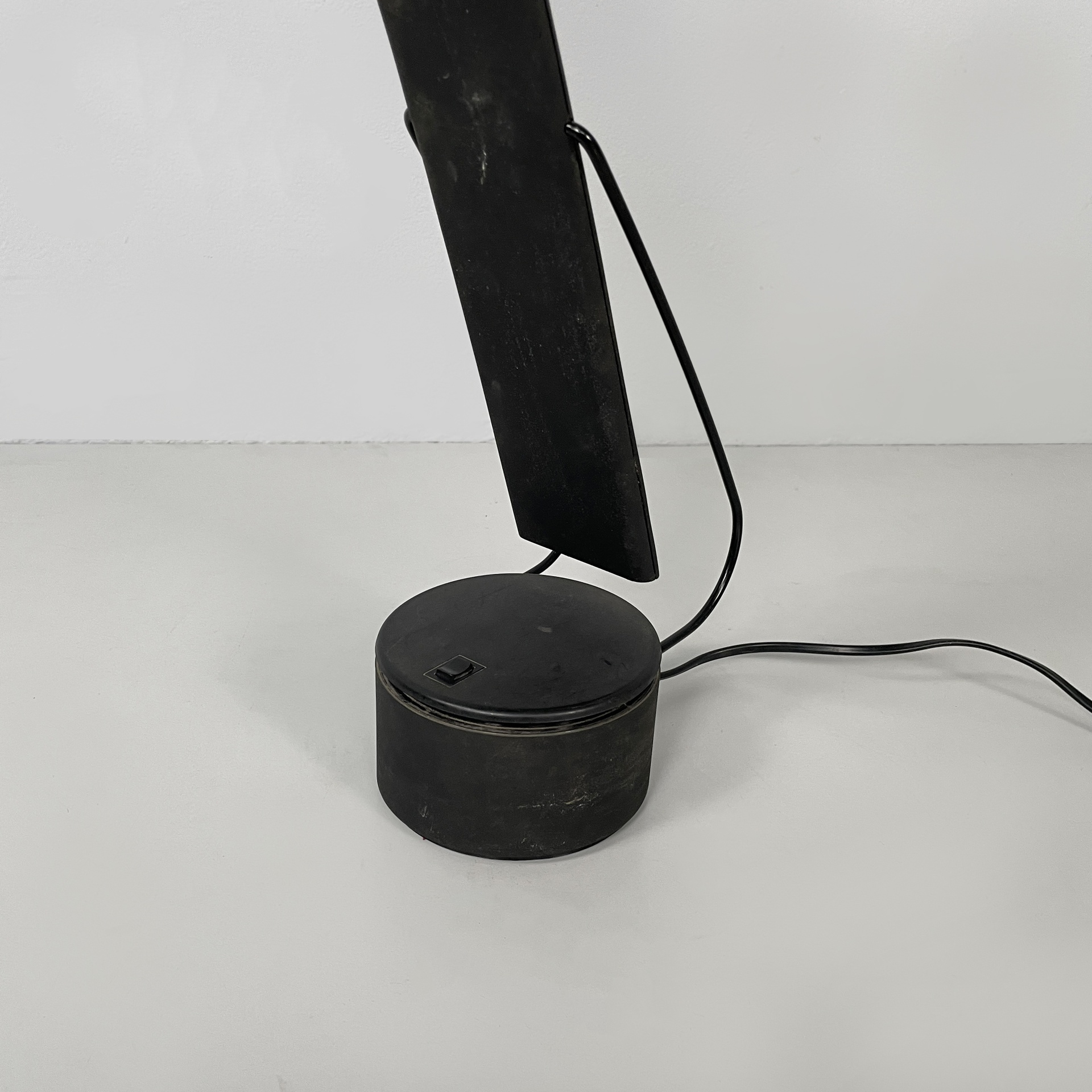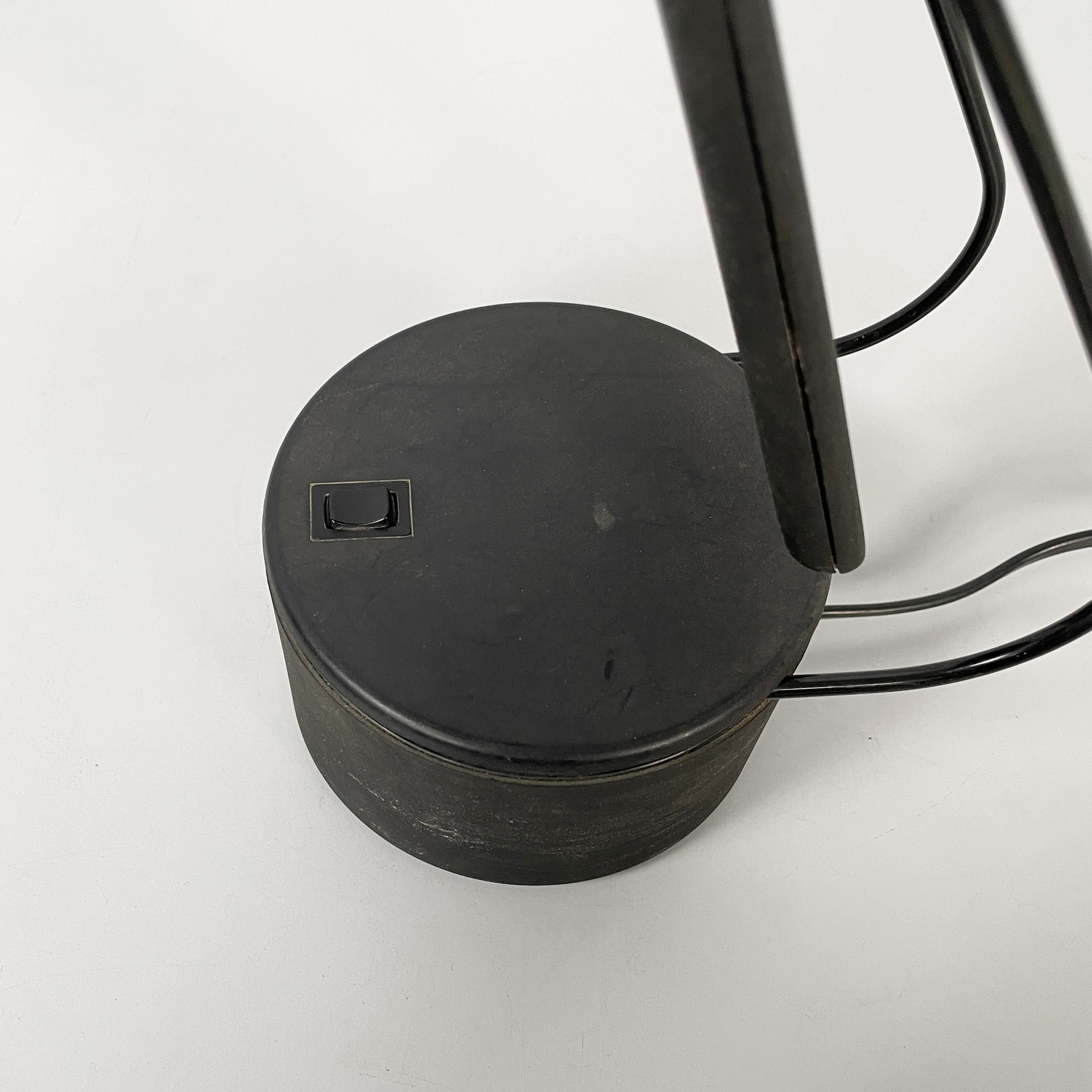 Lampada da tavolo orientabile modello Dove in metallo nero e plastica nera-grigio scuro. Il diffusore e la struttura a braccio sono composti da due listelli in plastica sottili, sostenuti da due tondini di metallo. La base tonda in plastica nera presenta l’interruttore. La lampada ha due gradi di intensità luminosa. La lampada presenta lampadina alogena.