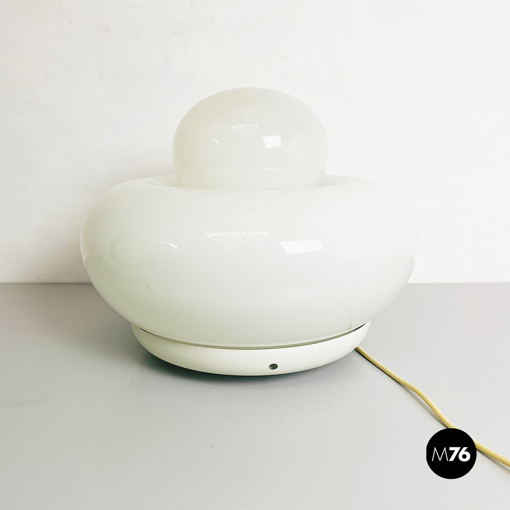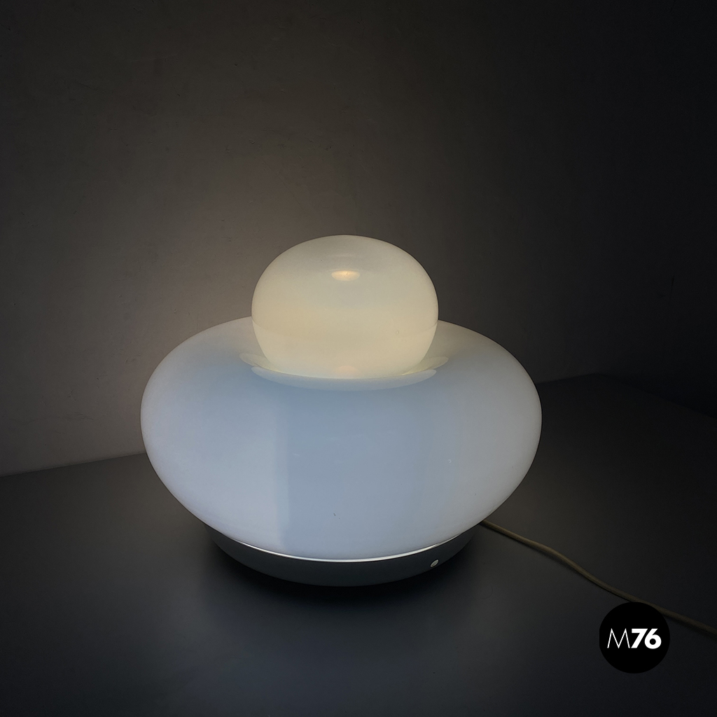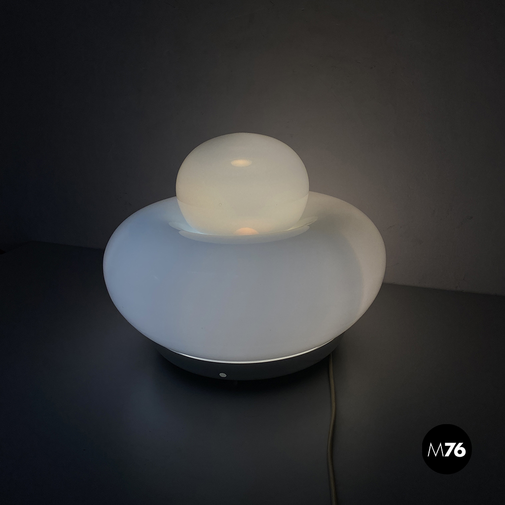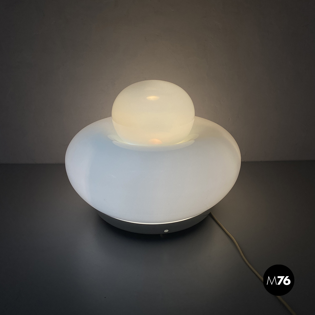 Lampada da tavolo modello Elettra in vetro bianco arrotondato supportato da una base in metallo e una sfera superiore più piccola.