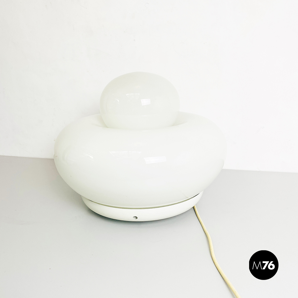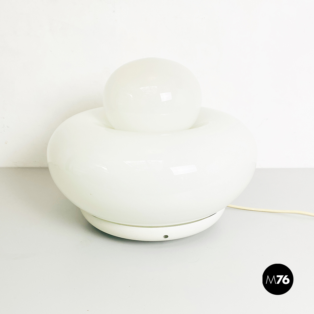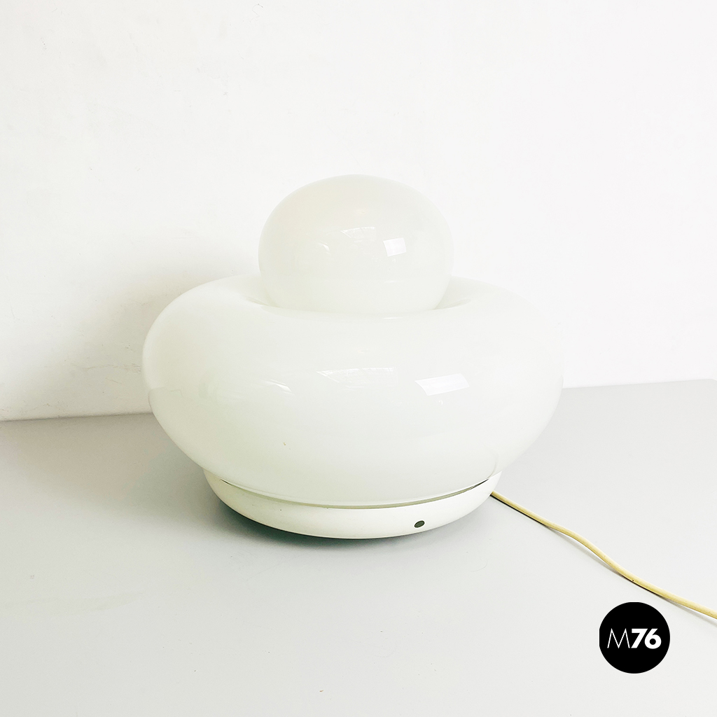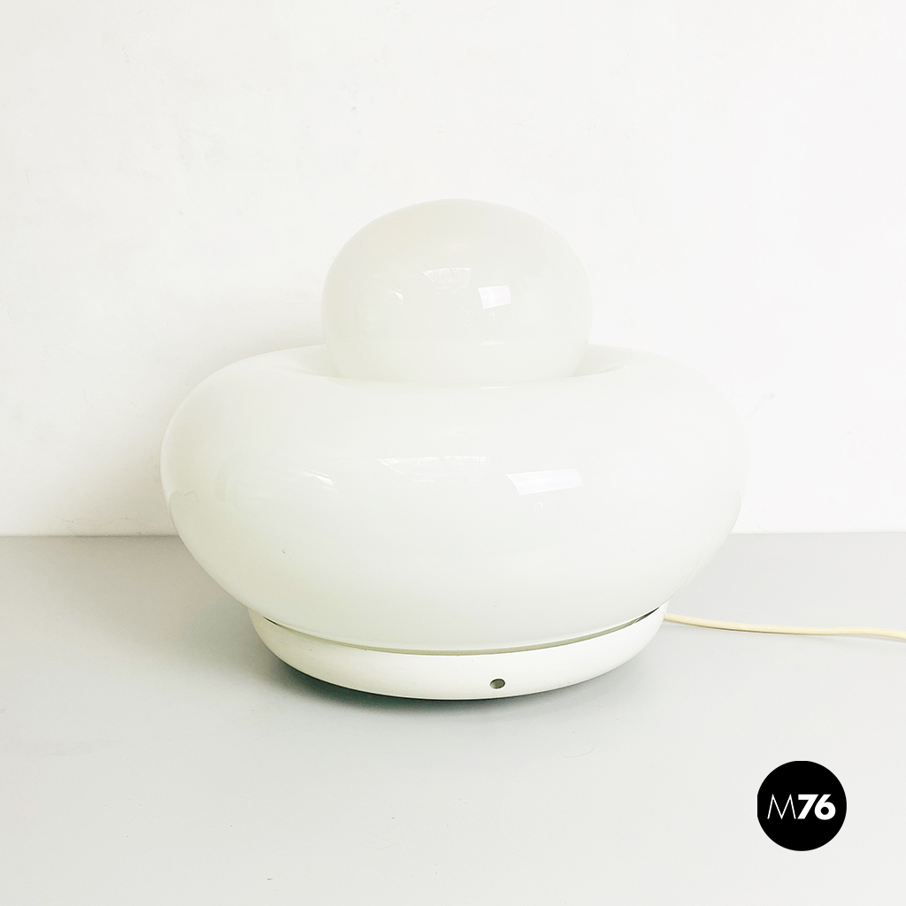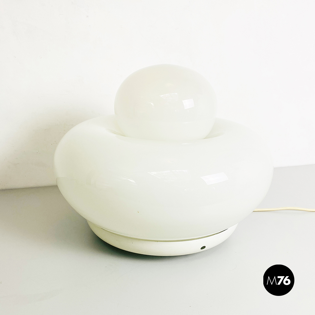 Lampada da tavolo modello Elettra in vetro bianco arrotondato supportato da una base in metallo e una sfera superiore più piccola.