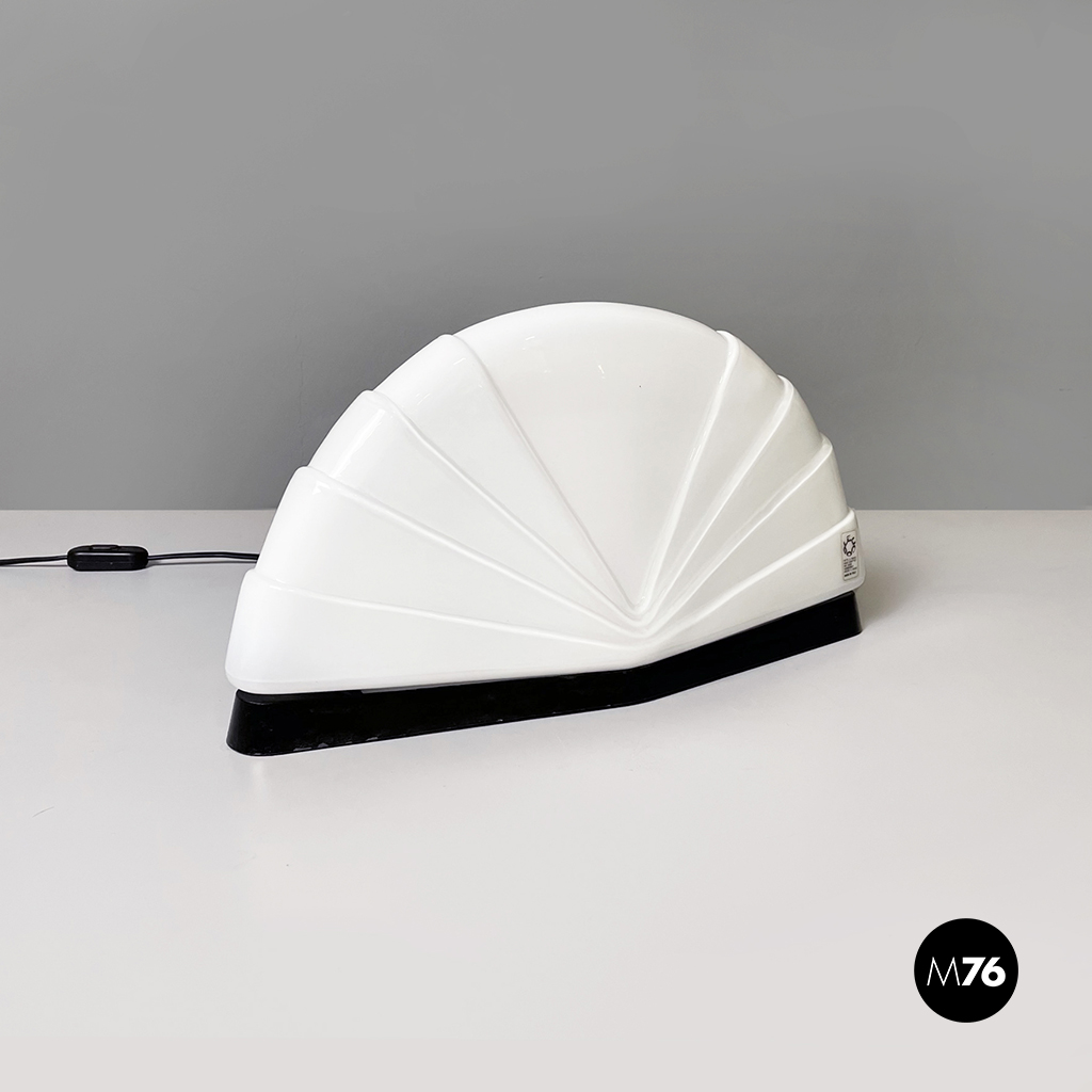 Lampada da tavolo modello Flores con diffusore a forma di ventaglio in vetro opalino, fatto a mano. La base a rombo è in metallo verniciato nero.