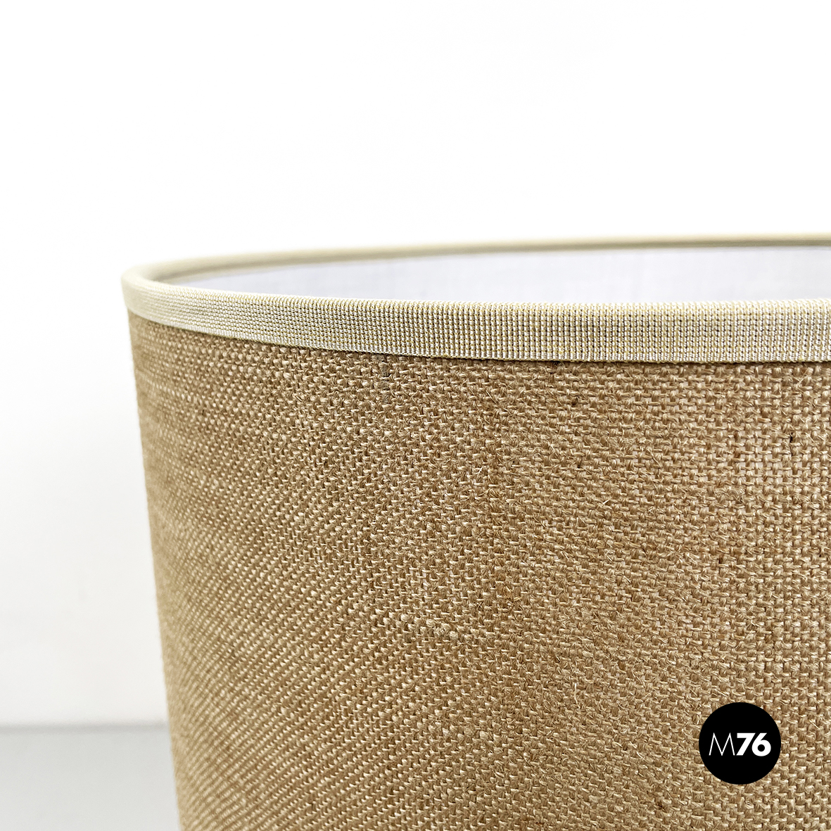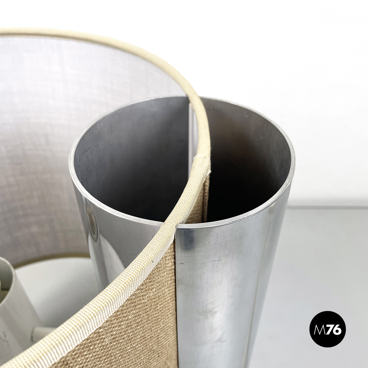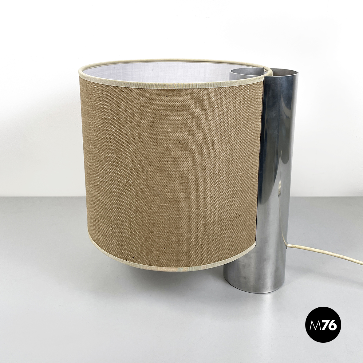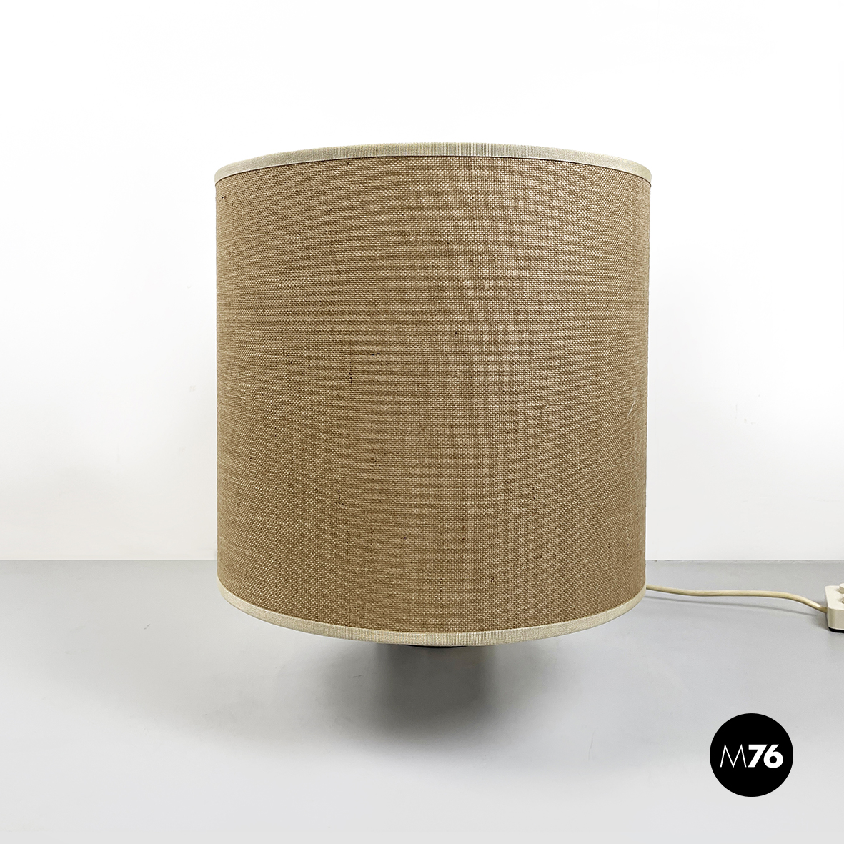 Lampada da tavolo modello Fluette con doppia lampadina e paralume cilindrico in tessuto beige con passamaneria sui profili. La struttura cilindrica in metallo è posizionata lungo il profilo. Presenta un interruttore con doppio pulsante, infatti le due lampadine hanno accensione indipendente.