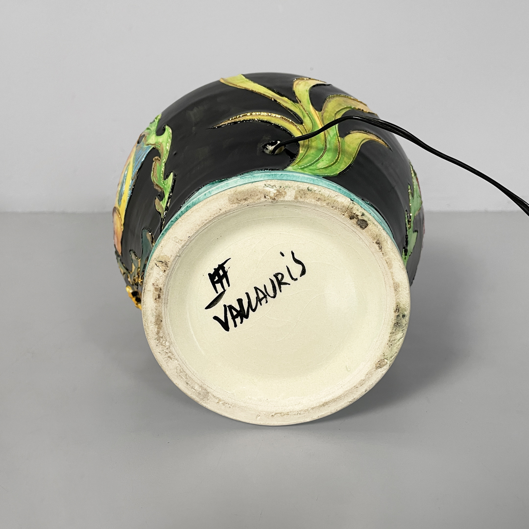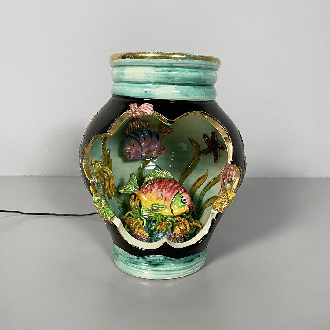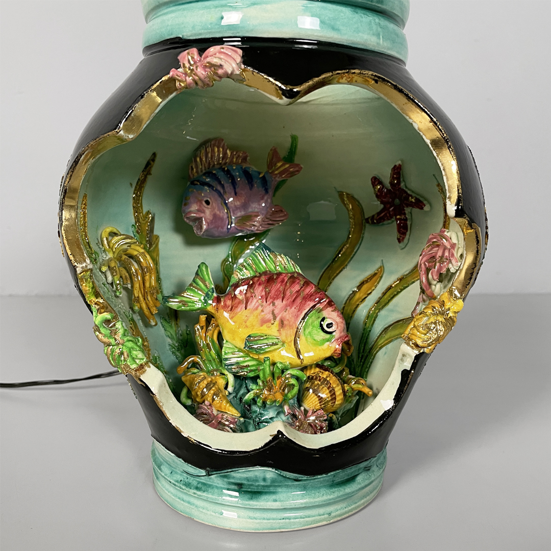 Lampada da tavolo interamente in ceramica smaltata. Il corpo panciuto presenta un’ampia apertura frontale a forma di cornice ondulata. La decorazione interna rappresenta una scena sottomarina tridimensionale molto colorata, con due pesci, alghe, coralli e piccole conchiglie modellate in rilievo. Dominano tonalità vivaci come verde, turchese, rosa, giallo e viola; l’esterno è in parte nero con bordature dorate. Il collo del vaso è di colore azzurro.