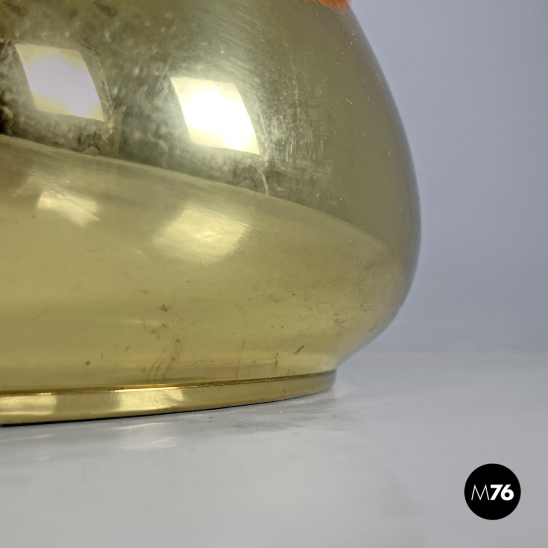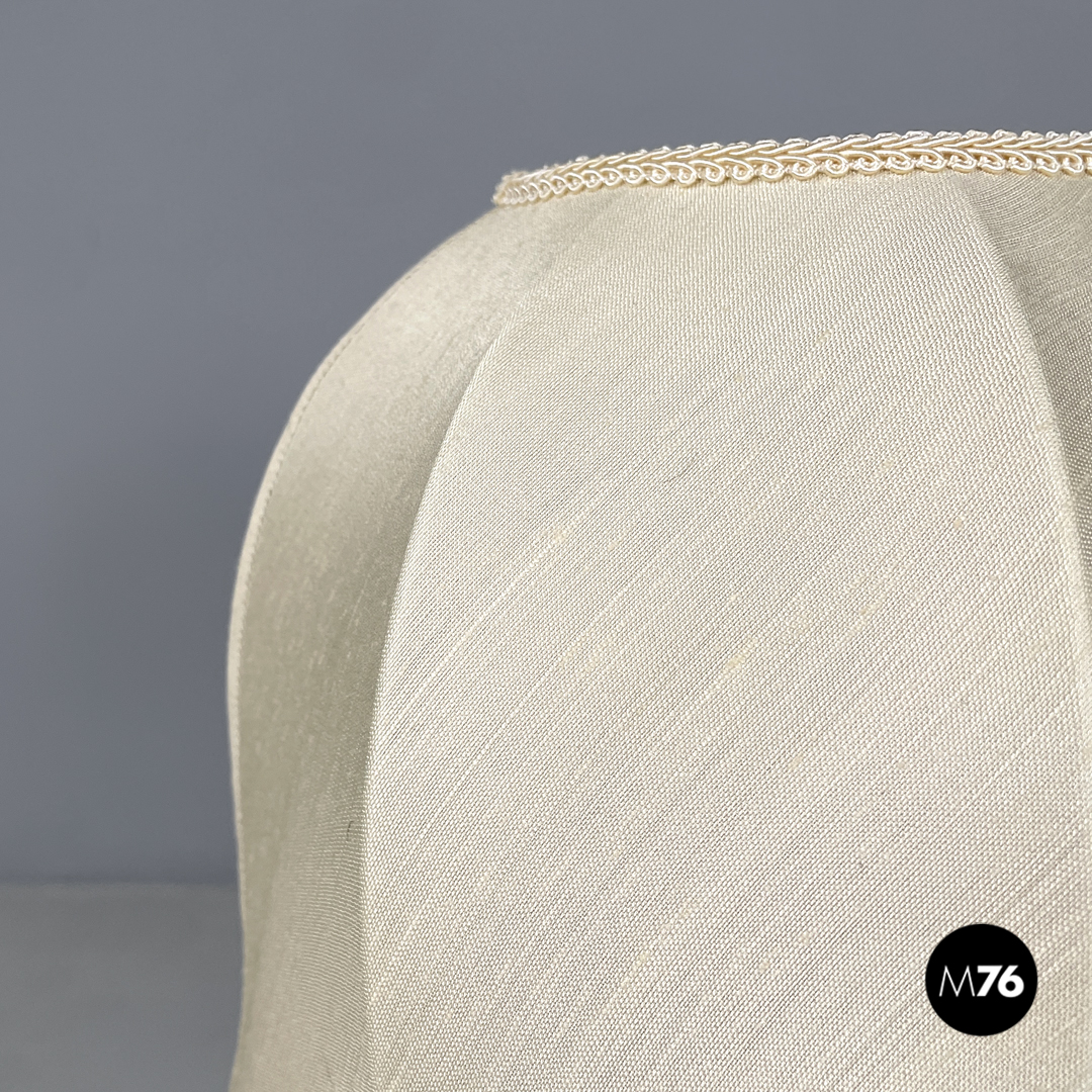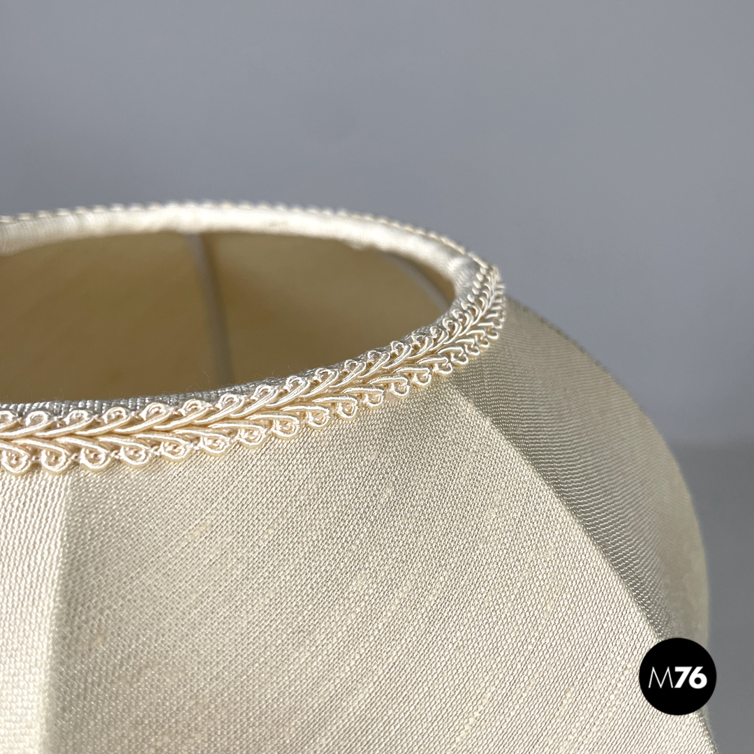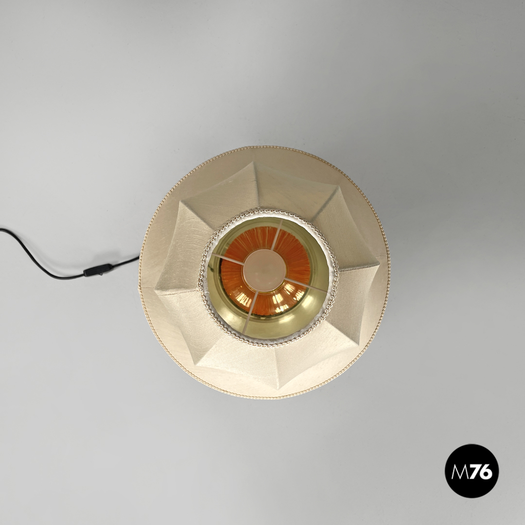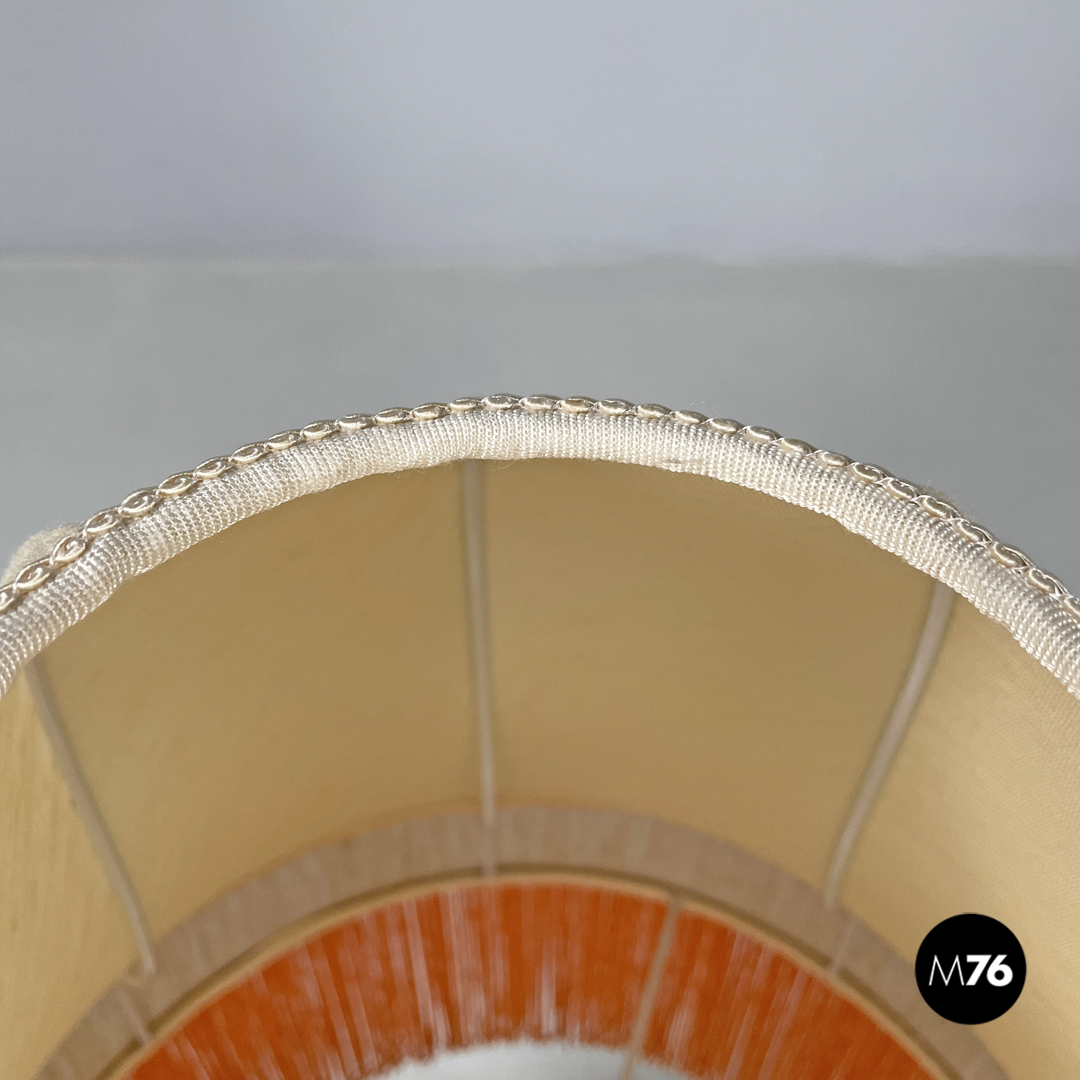 Lampada da tavolo a base tonda. Il paralume è tondo in tessuto beige, e segue forme curve sinuose che partono dalla parte alta per allargarsi al centro. Termina nella parte bassa con una fascia in tessuto marrone e frange arancioni. La base è in ottone, con cinque linee geometriche decorative. Utilizzabile come abat jour.