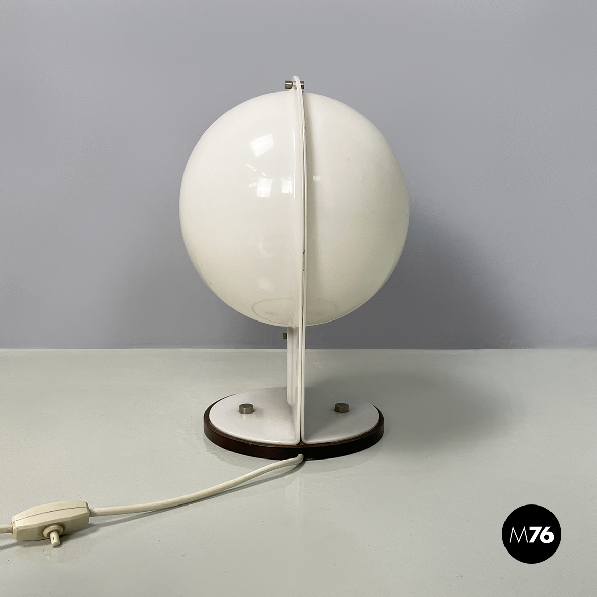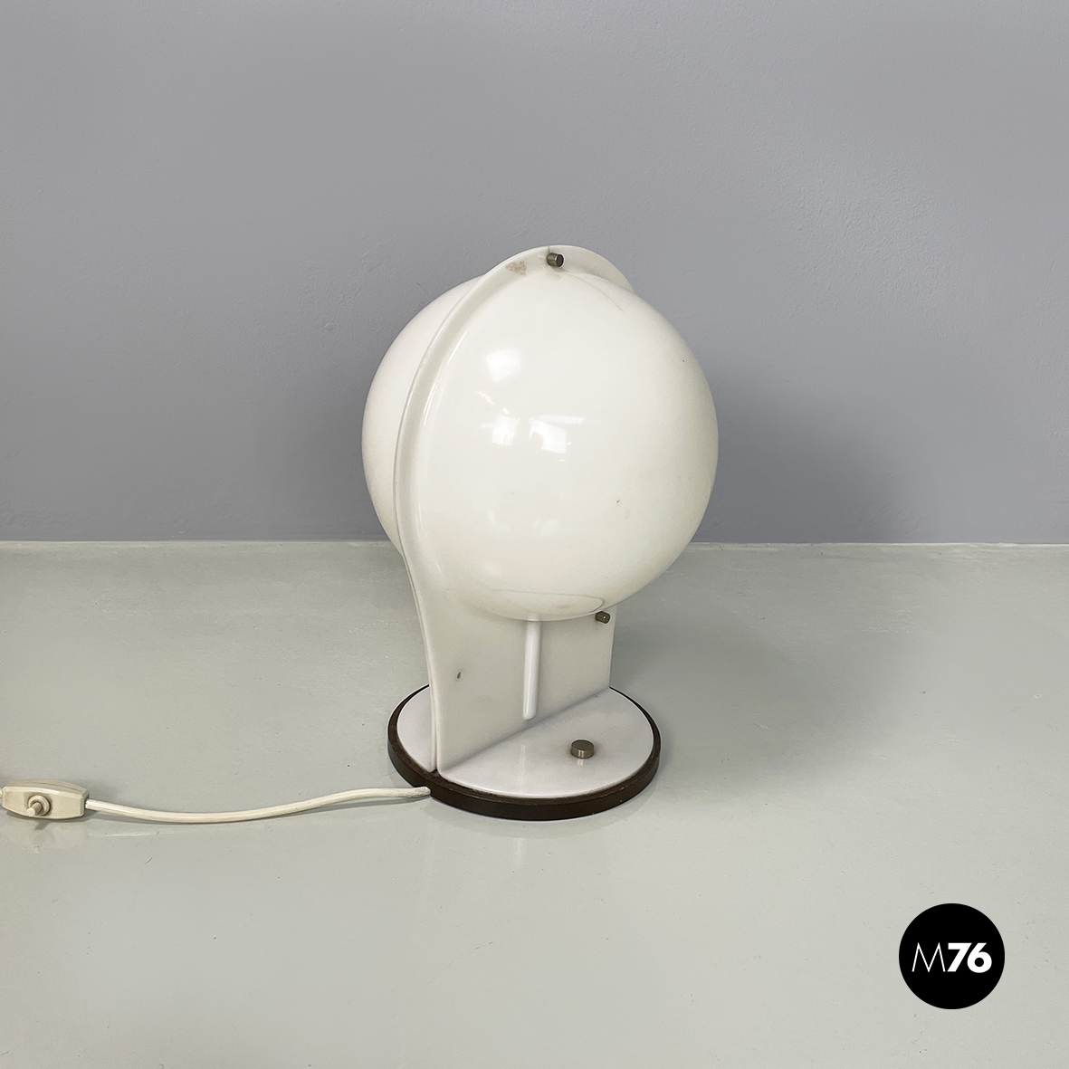 Lampada da tavolo in plastica bianca e nera. Il diffusore è composto da due lastre in plastica bianca a semisfera e unite da delle parti cilindriche in metallo. La base tonda è in plastica bianca e nera. Appartenente allo stile Space Age.