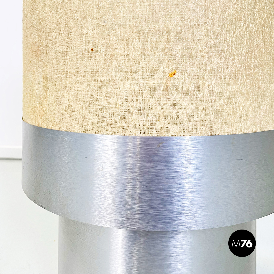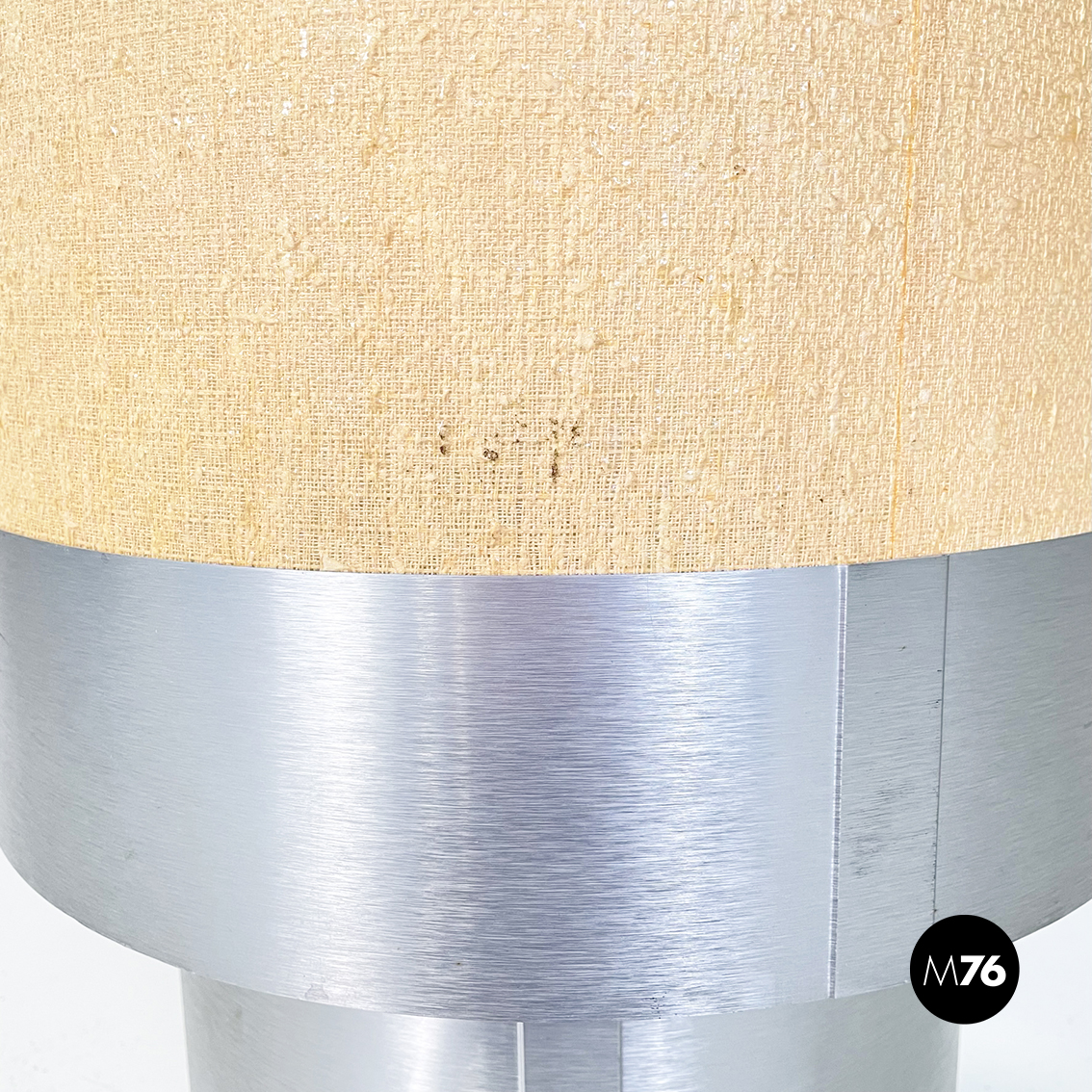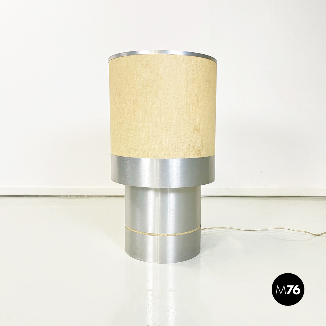 Lampada da tavolo con base tonda in alluminio spazzolato. Il paralume cilindrico è formato da un tessuto rigido beige, con inseriti in alluminio sui bordi. La base in alluminio presenta un piccolo inserto in tessuto beige.