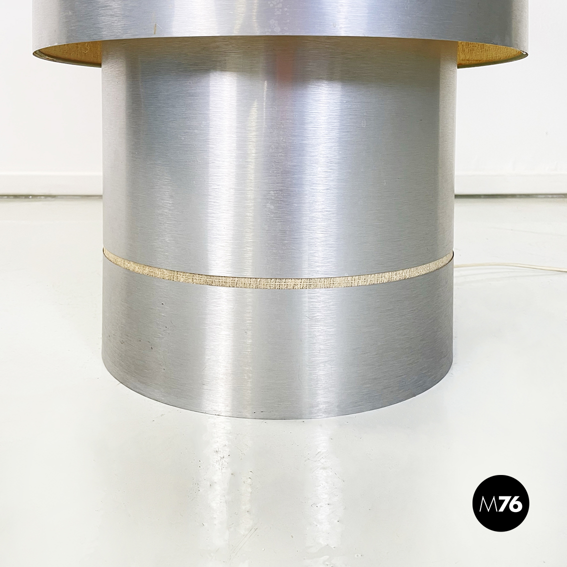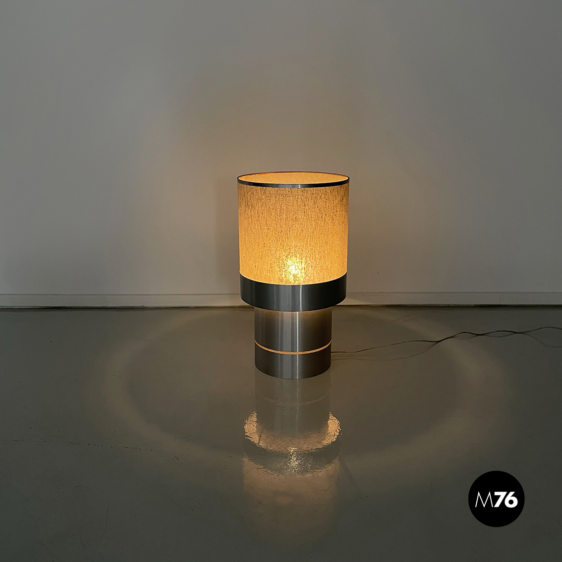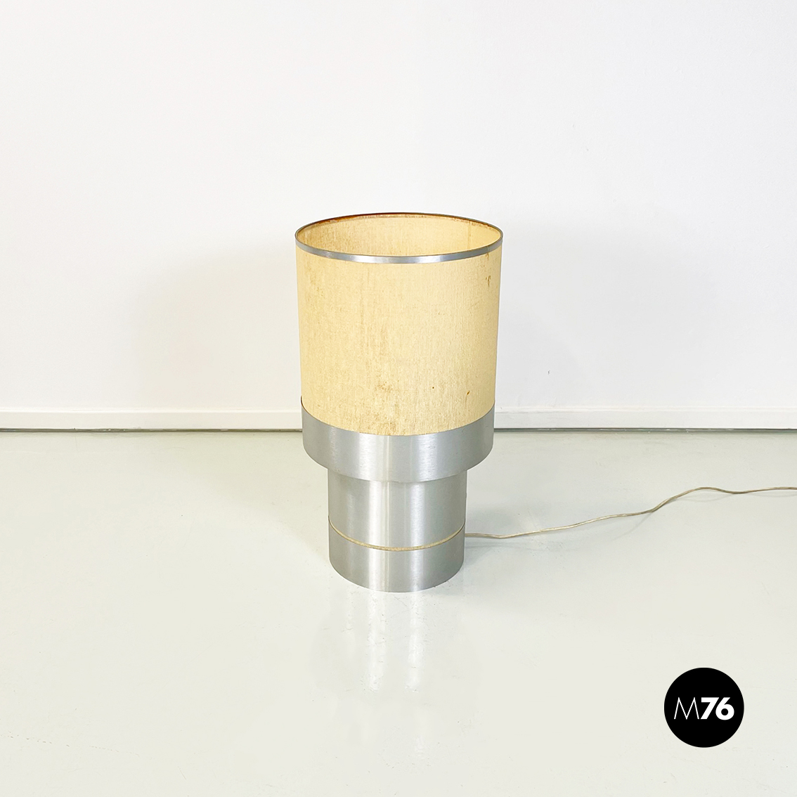 Lampada da tavolo con base tonda in alluminio spazzolato. Il paralume cilindrico è formato da un tessuto rigido beige, con inseriti in alluminio sui bordi. La base in alluminio presenta un piccolo inserto in tessuto beige.