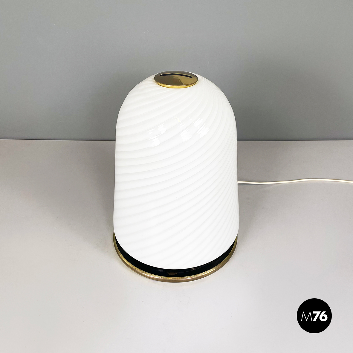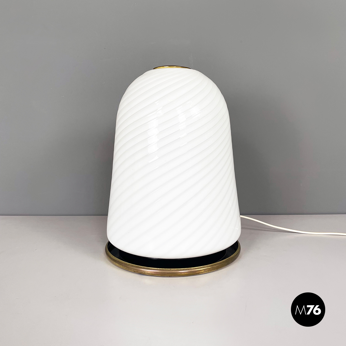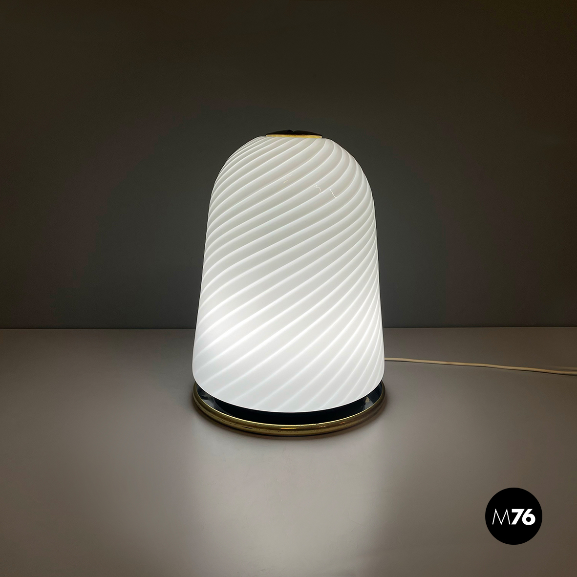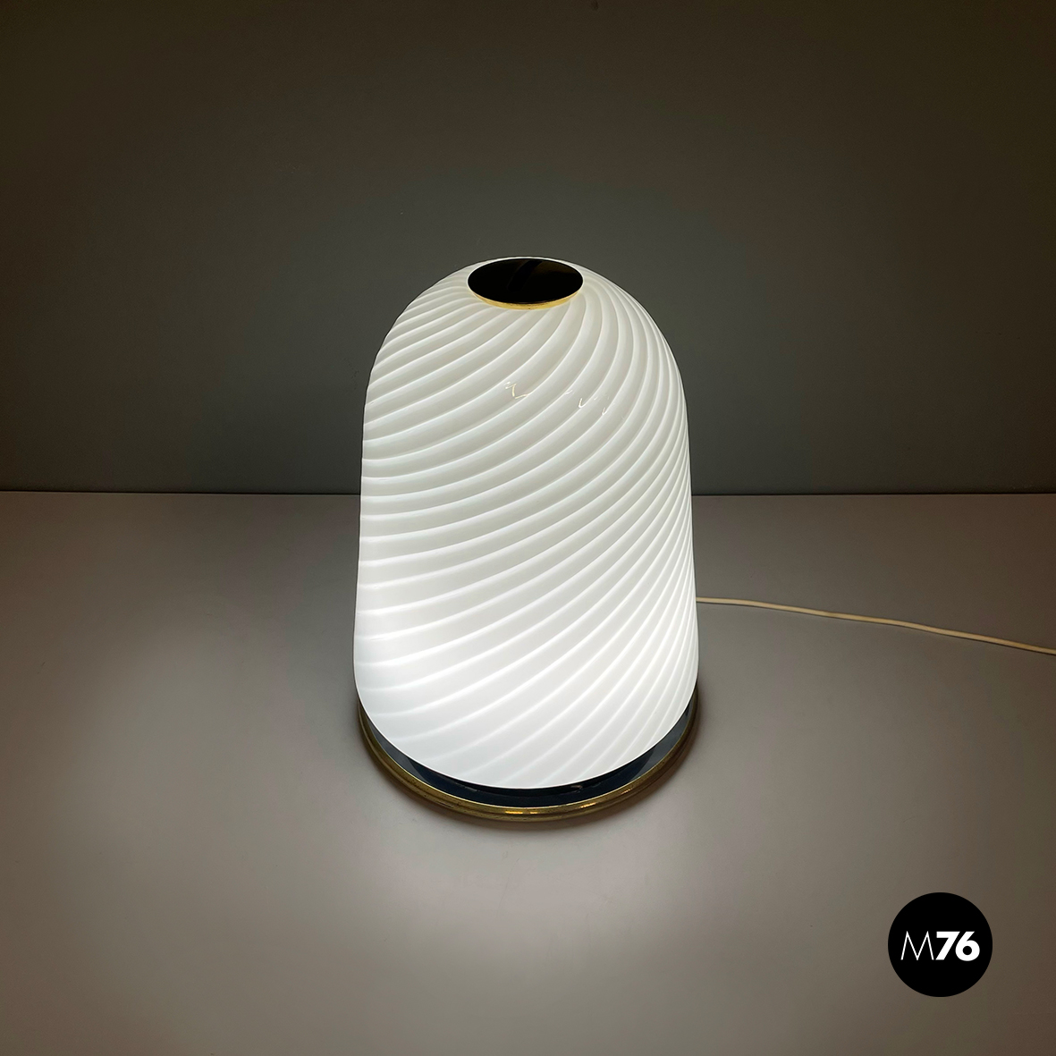 Lampada da tavolo con diffusore a campana in vetro opalino di Murano, caratterizzato da un vortice. Nella parte superiore è presente un dettaglio tondo in ottone. La base tonda è in ottone e in metallo verniciato nero. Finemente lavorata a mano.