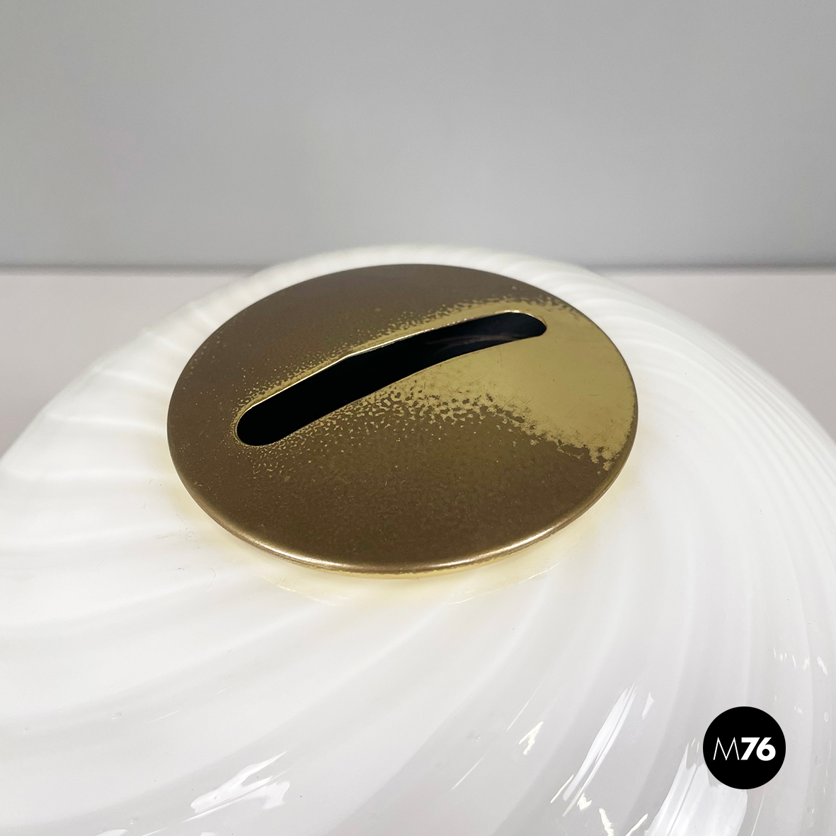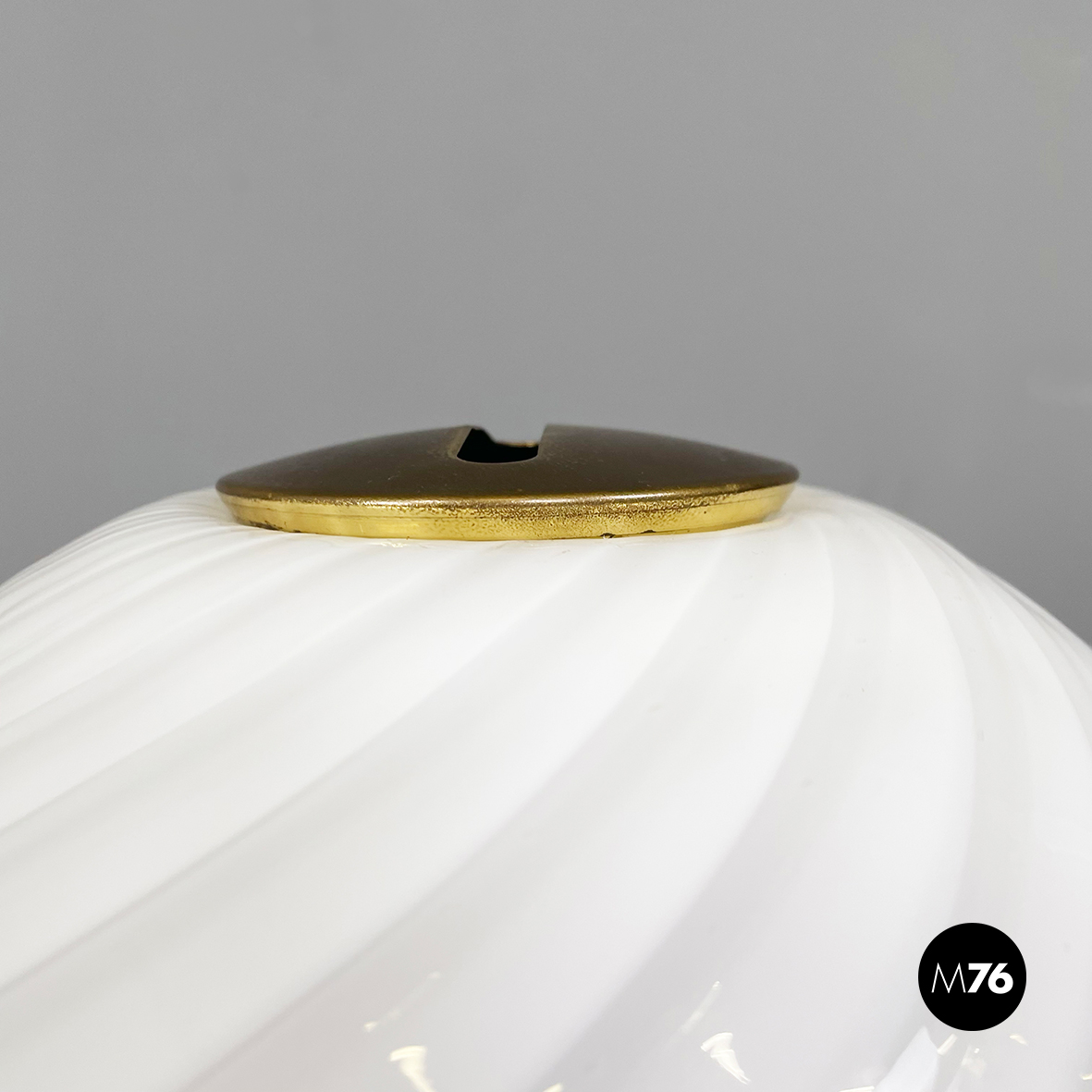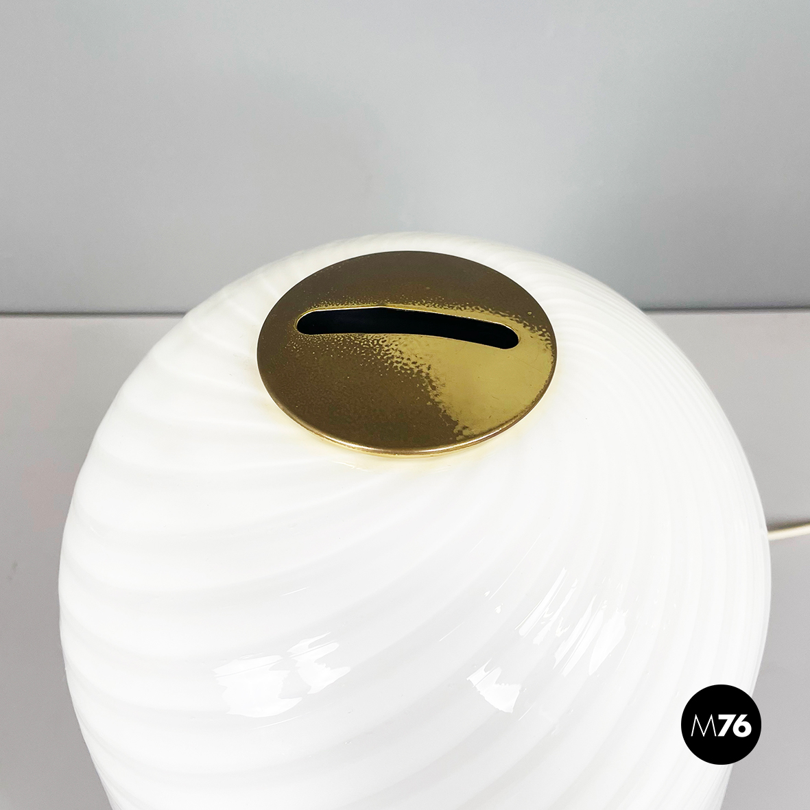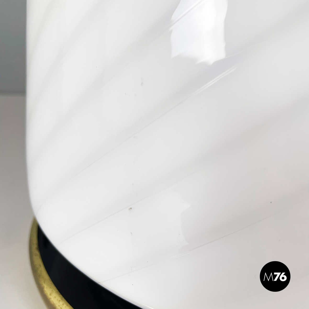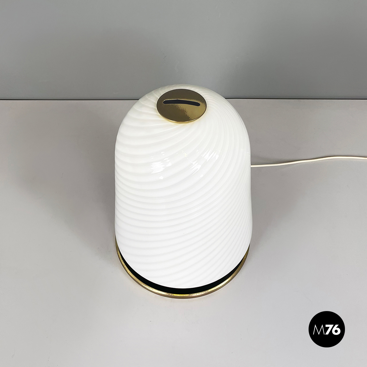 Lampada da tavolo con diffusore a campana in vetro opalino di Murano, caratterizzato da un vortice. Nella parte superiore è presente un dettaglio tondo in ottone. La base tonda è in ottone e in metallo verniciato nero. Finemente lavorata a mano.