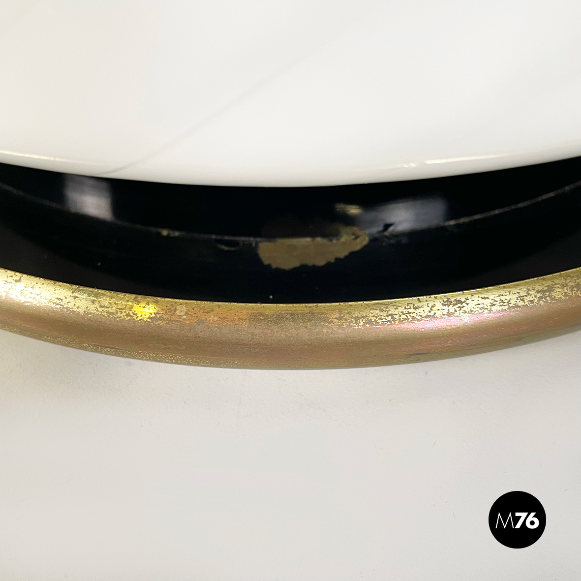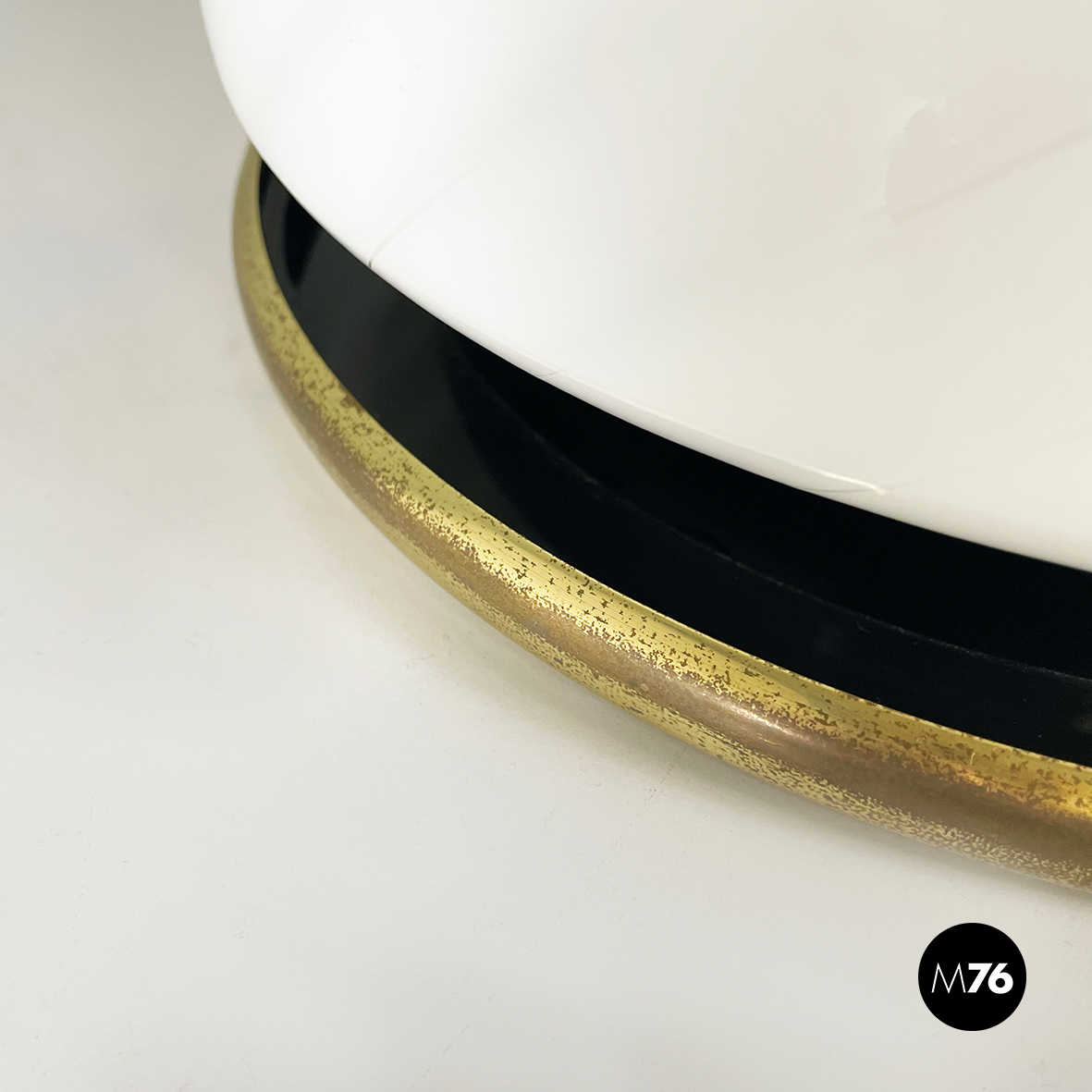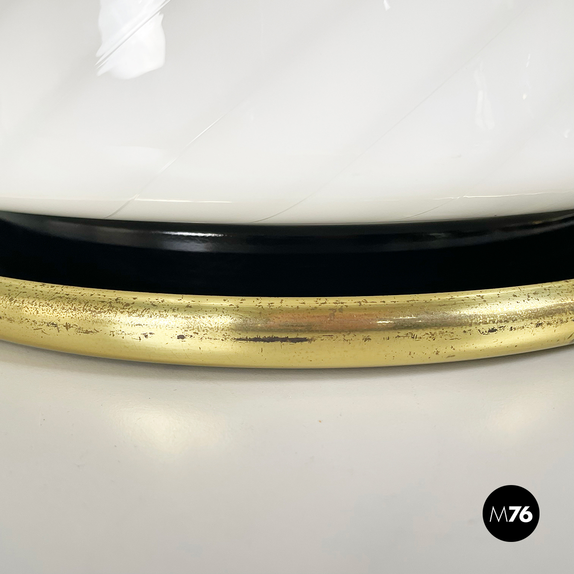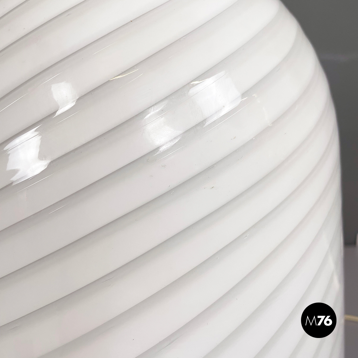 Lampada da tavolo con diffusore a campana in vetro opalino di Murano, caratterizzato da un vortice. Nella parte superiore è presente un dettaglio tondo in ottone. La base tonda è in ottone e in metallo verniciato nero. Finemente lavorata a mano.