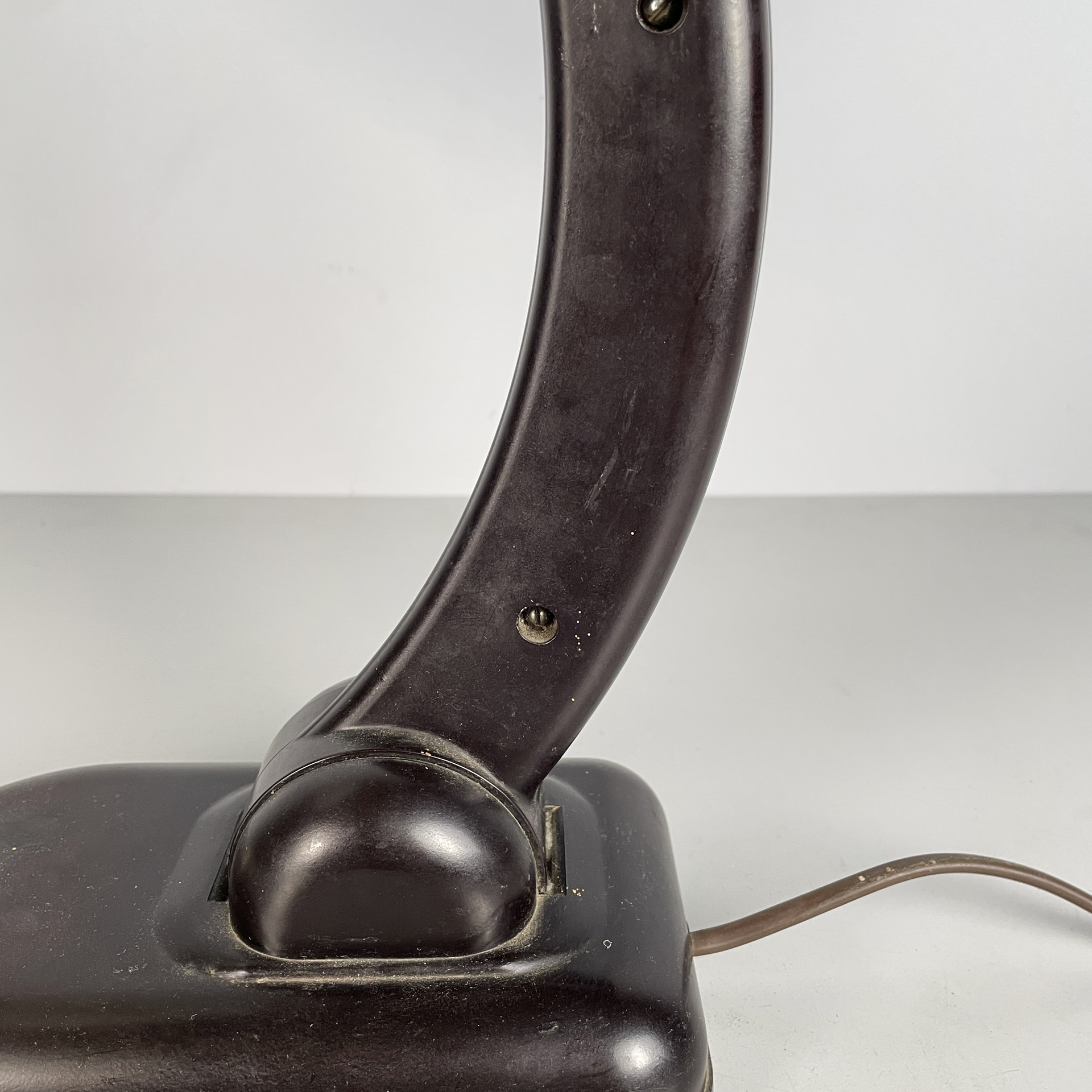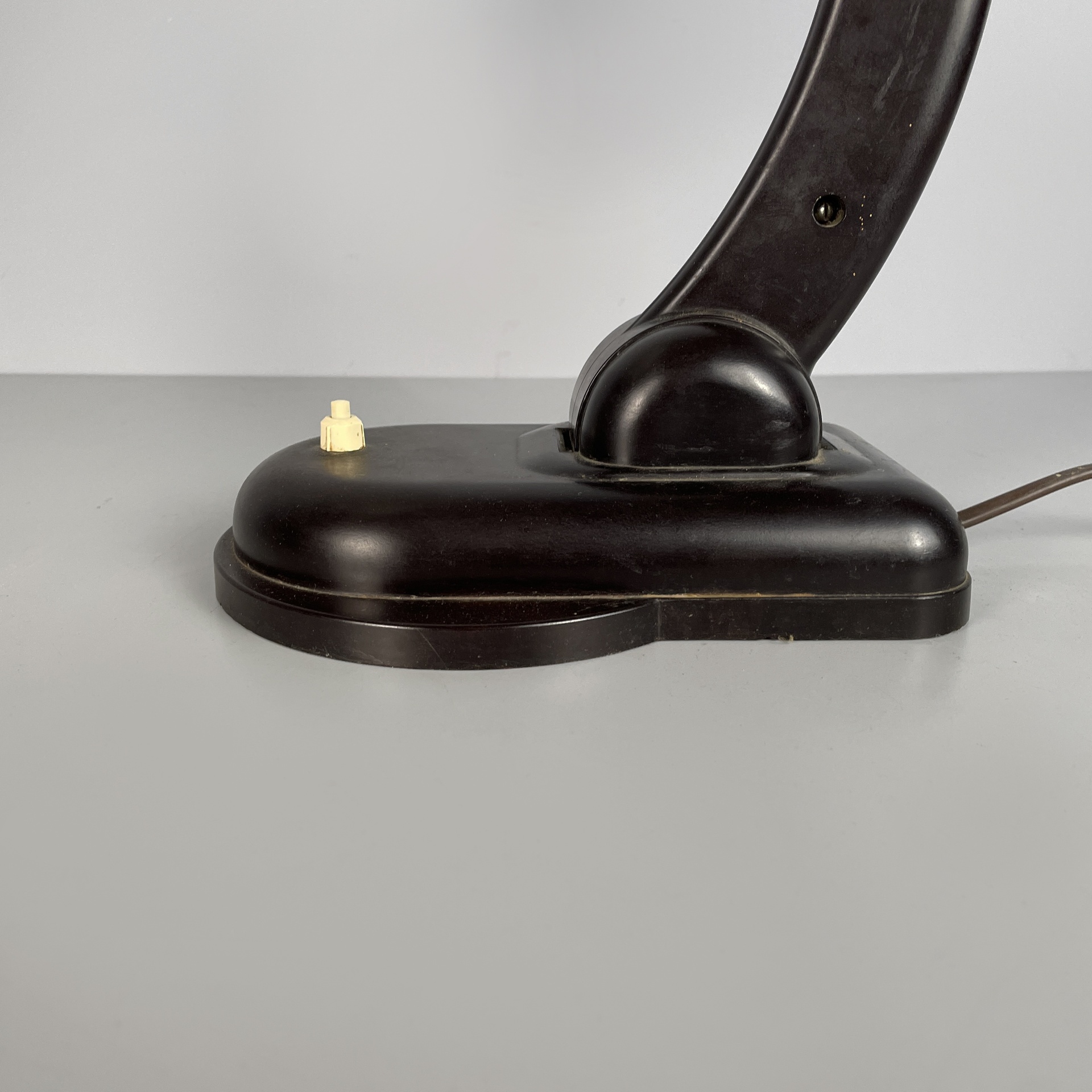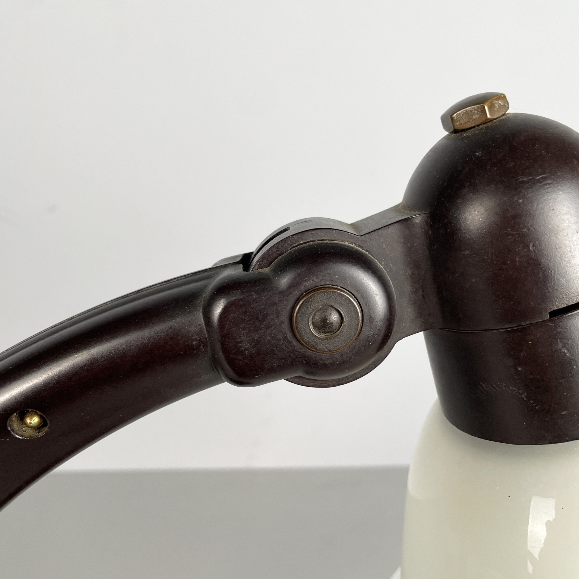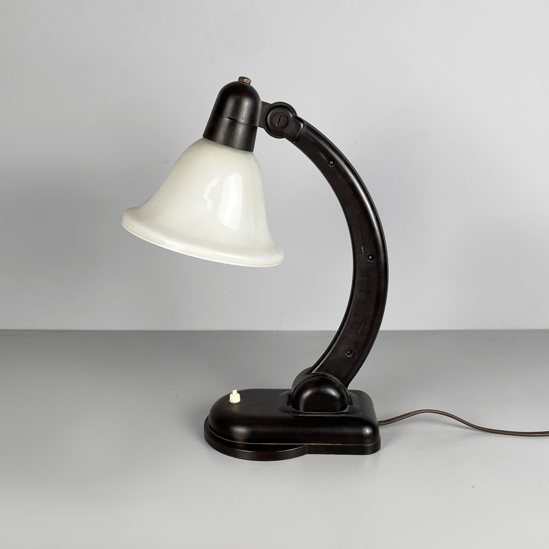 Lampada da tavolo con diffusore orientabile a base tonda in vetro opalino. La struttura, anche essa orientabile, e la base sono in bachelite marrone scuro. Alla base è presente l’interruttore bianco.