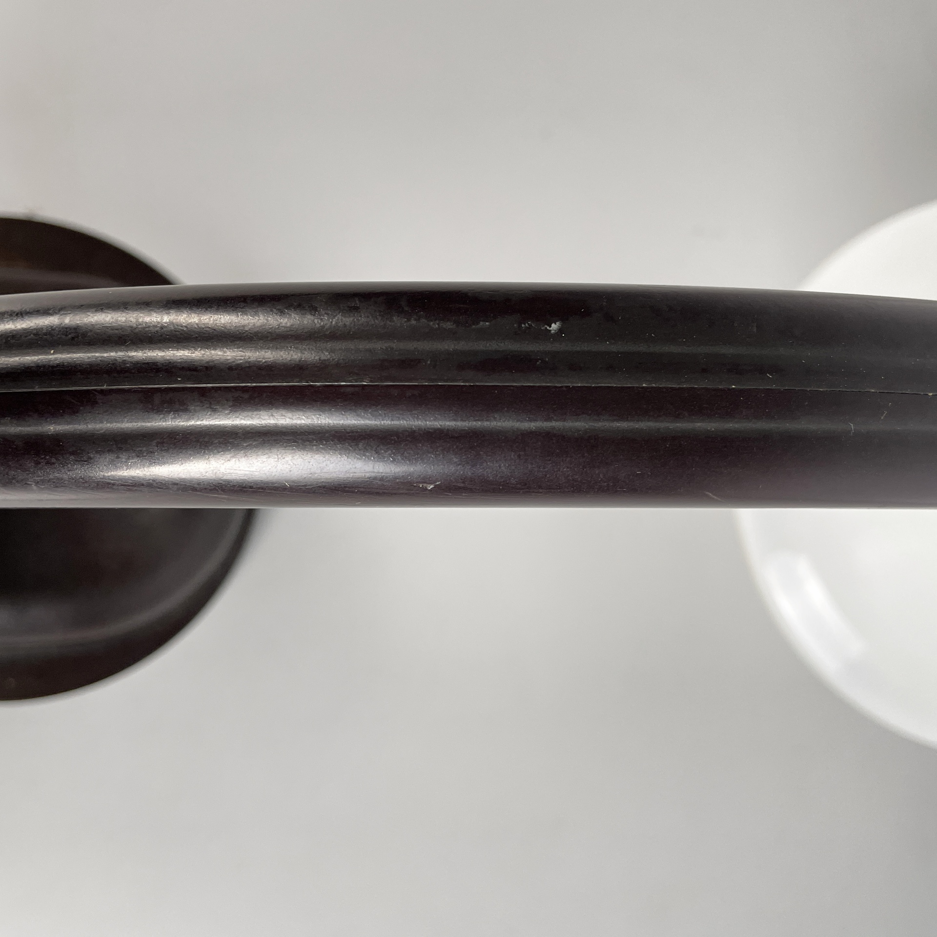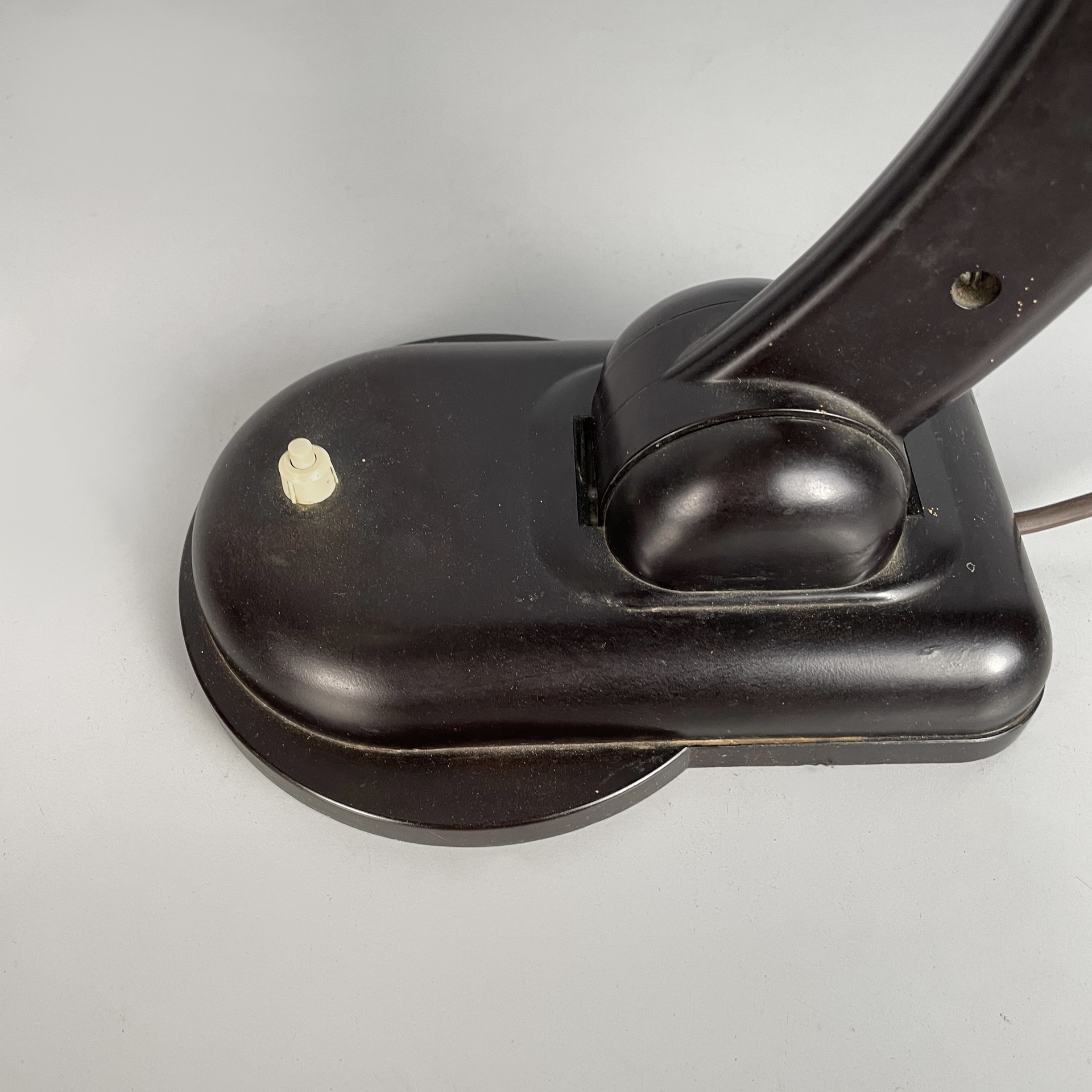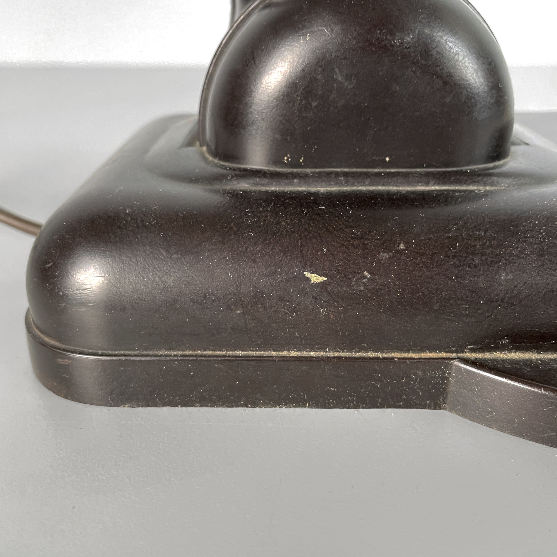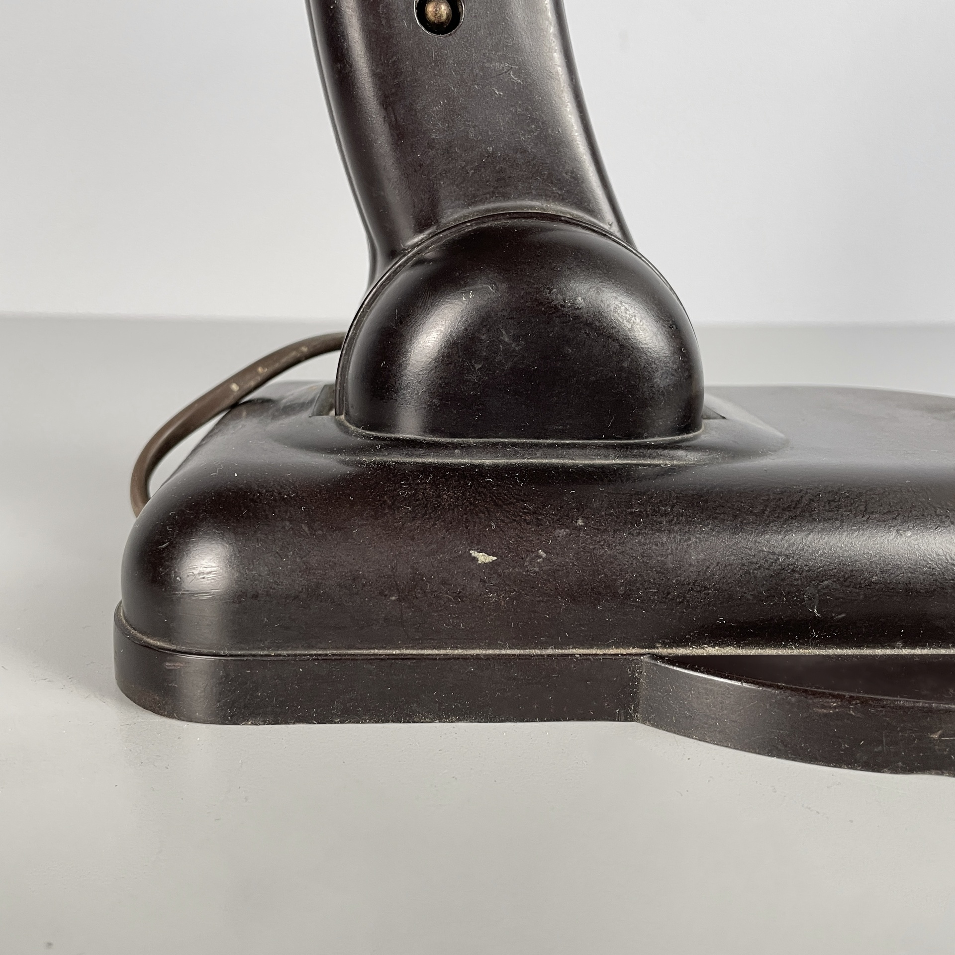Lampada da tavolo con diffusore orientabile a base tonda in vetro opalino. La struttura, anche essa orientabile, e la base sono in bachelite marrone scuro. Alla base è presente l’interruttore bianco.
