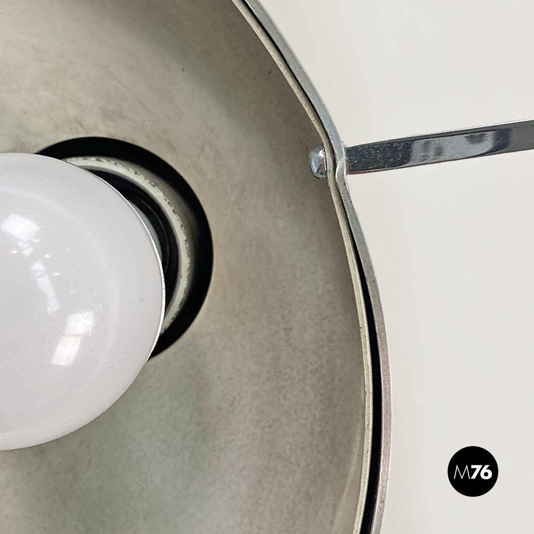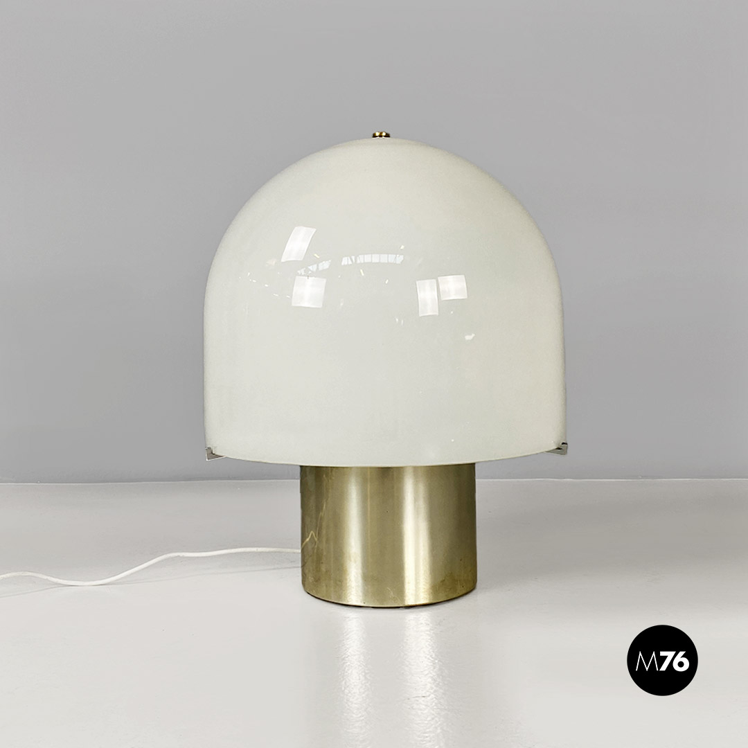 Lampada da tavolo con base cilindrica in acciaio cromato e paralume a forma di cupola in vetro opalino lucido.
