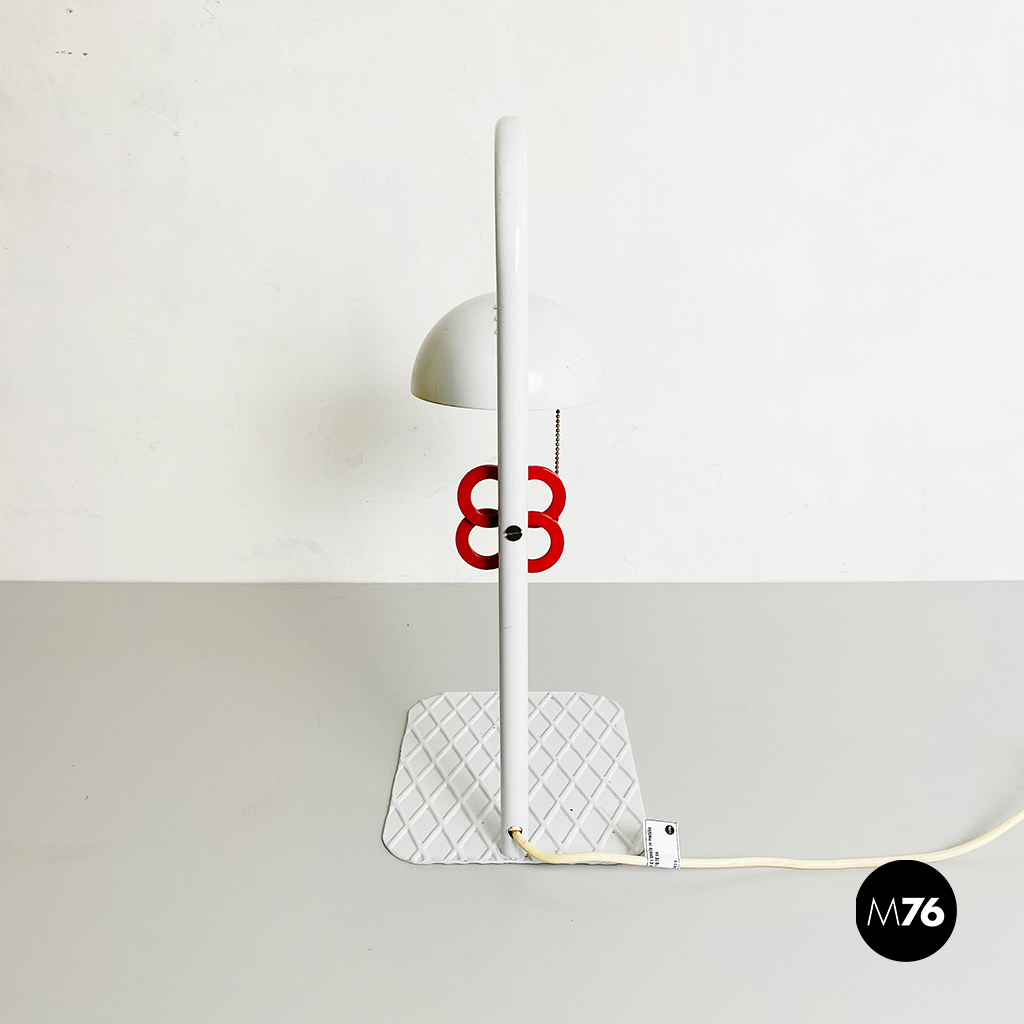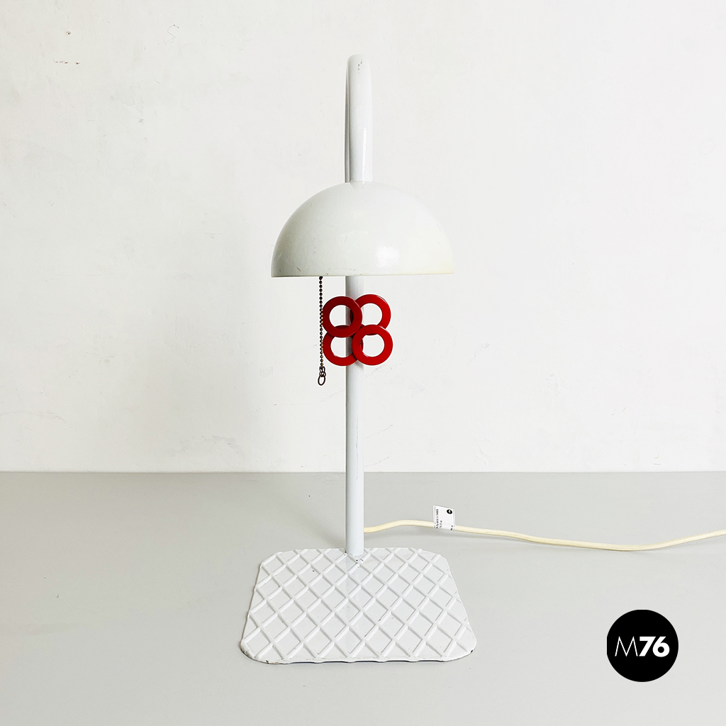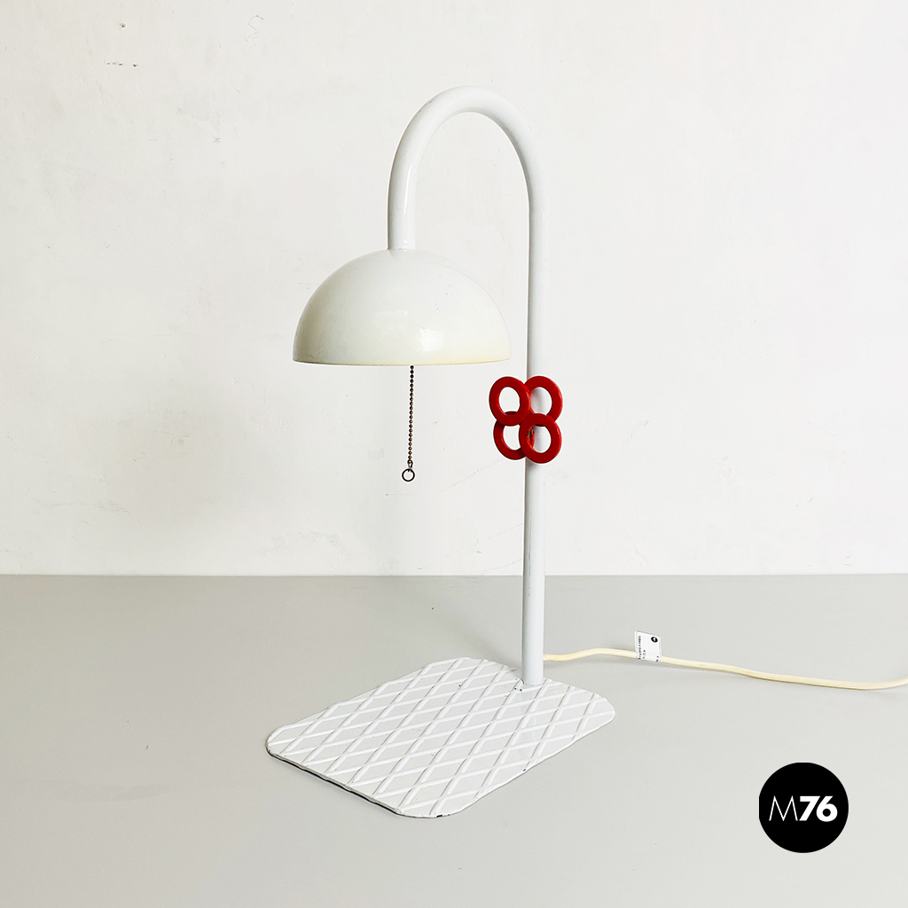 Lampada da tavolo in metallo bianco, con manopola rossa sull’impugnatura, base piatta in metallo con motivo a rombi e paralume bianco con chiusura in metallo traforato rosso. Interruttore a catena.