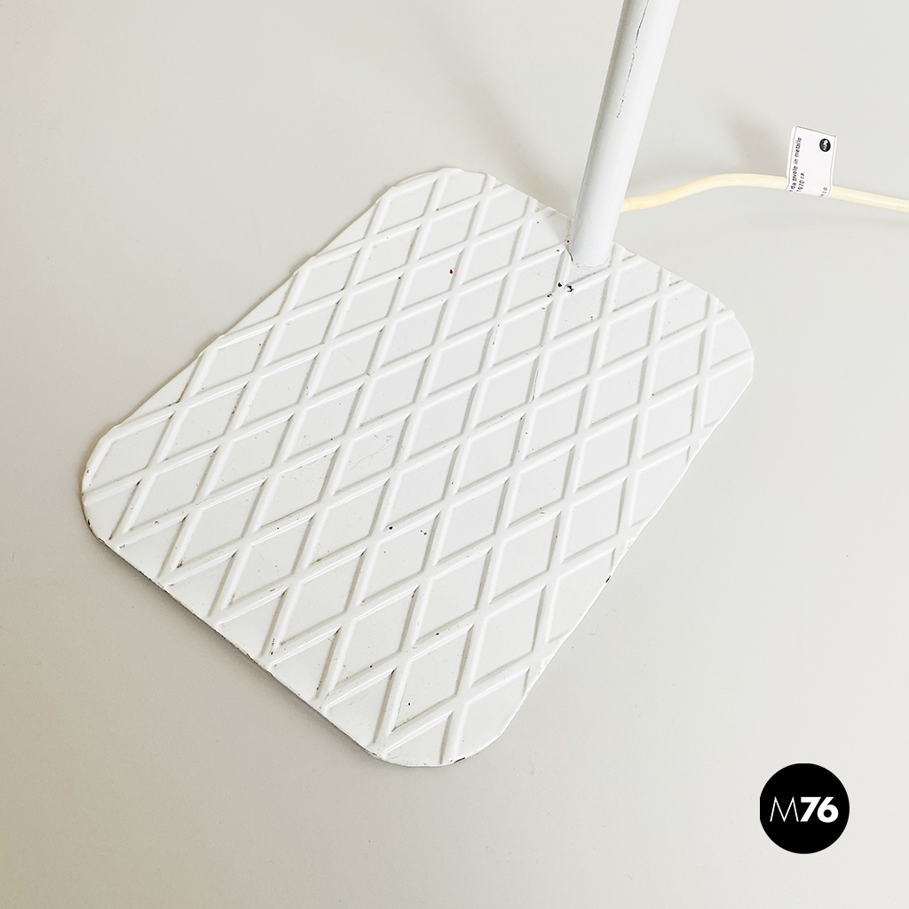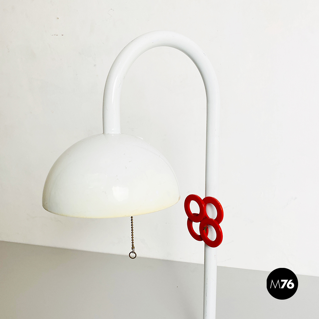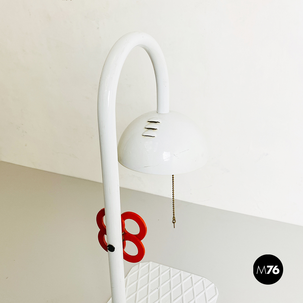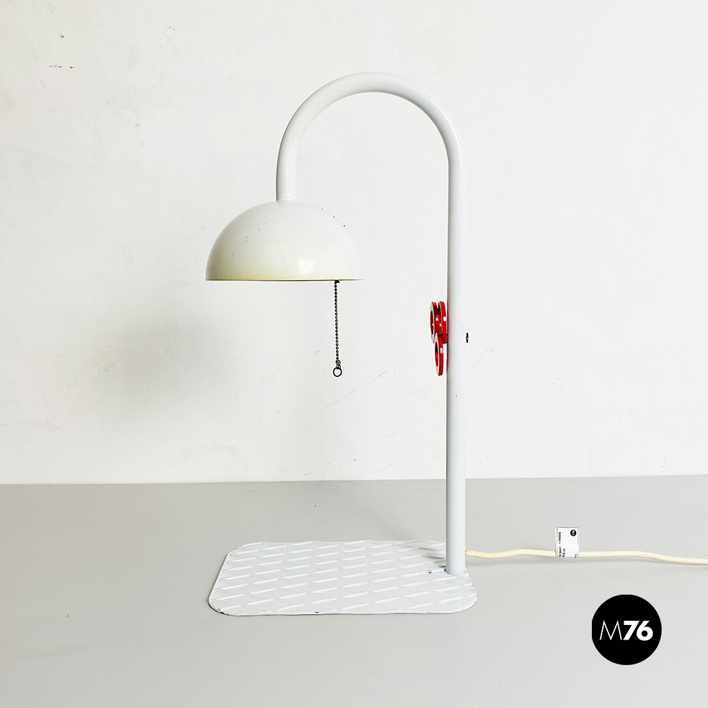 Lampada da tavolo in metallo bianco, con manopola rossa sull’impugnatura, base piatta in metallo con motivo a rombi e paralume bianco con chiusura in metallo traforato rosso. Interruttore a catena.