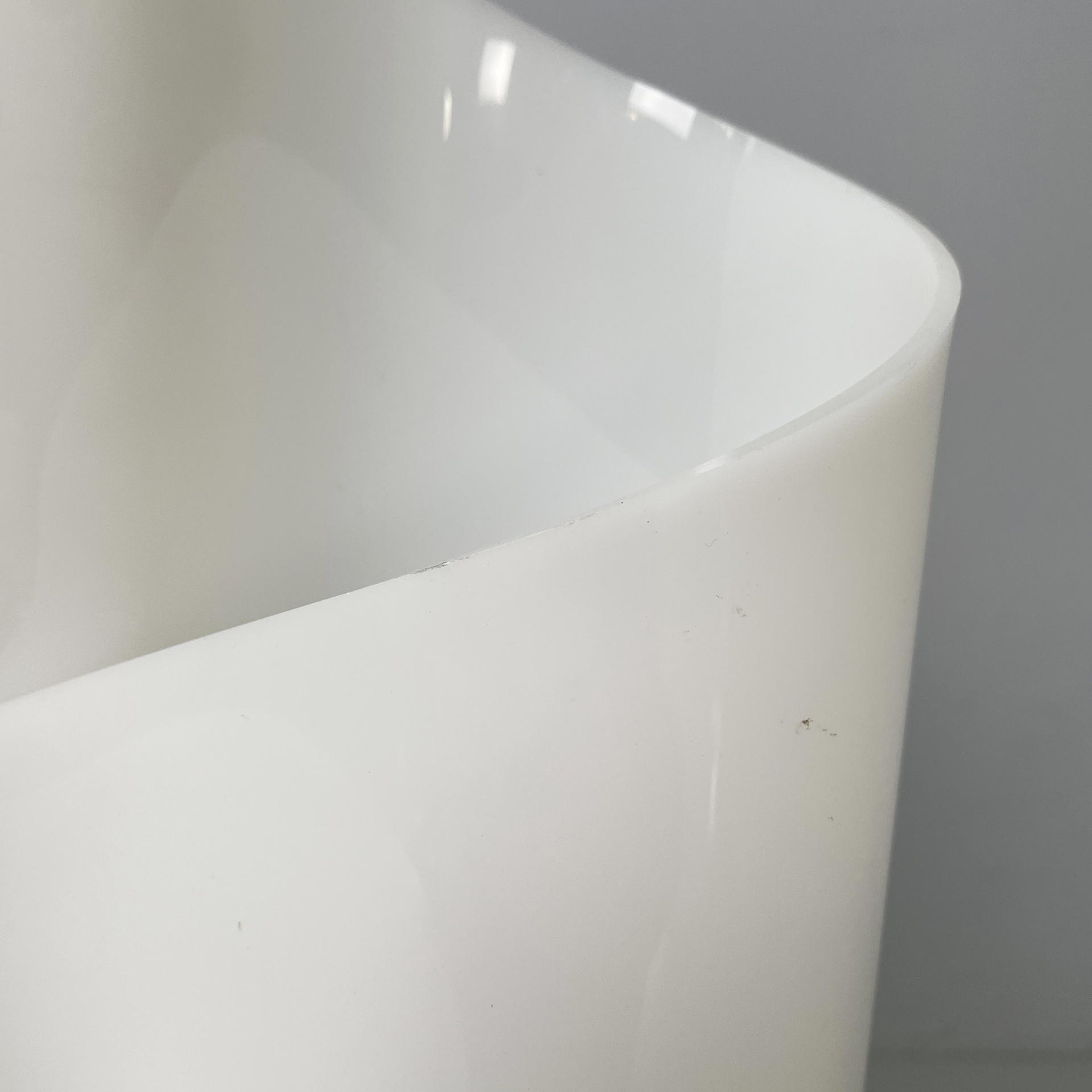 Lampada da tavolo modello Mezza Chimera con diffusore in lamina di plexiglass opalino curvato. La lampada presenta tre lampadine. Base in plastica nera e bianca.