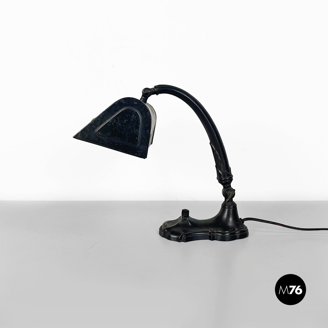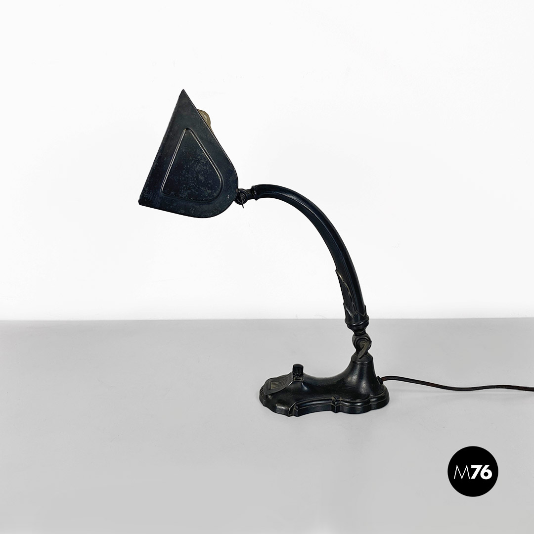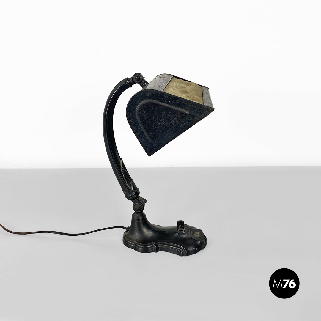 Lampada da tavolo ministeriale, in metallo nero e con paralume in metallo e tessuto, con interruttore in bachelite originale.