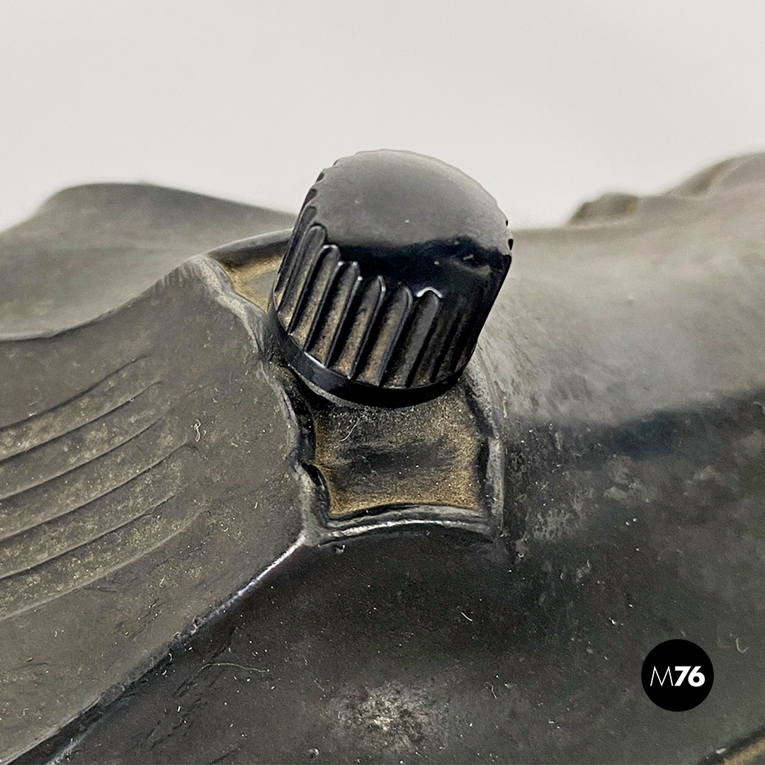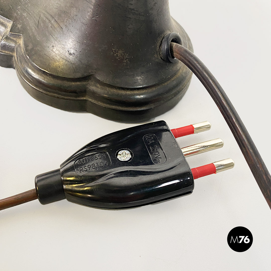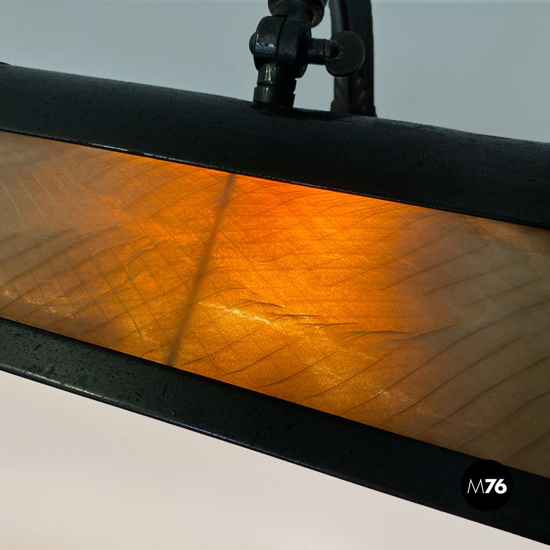 Lampada da tavolo ministeriale, in metallo nero e con paralume in metallo e tessuto, con interruttore in bachelite originale.
