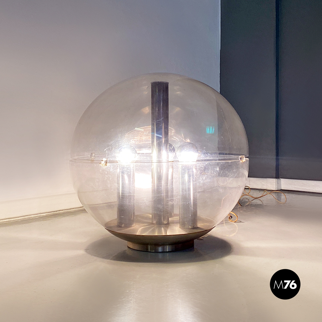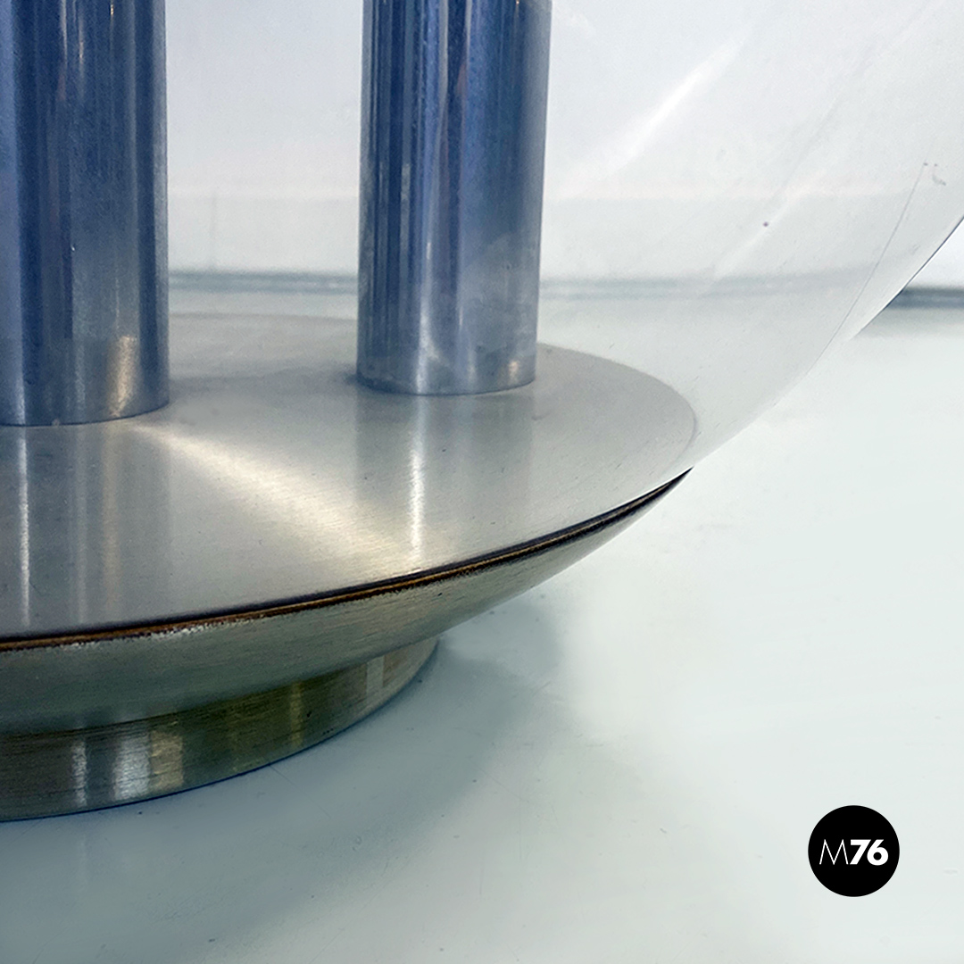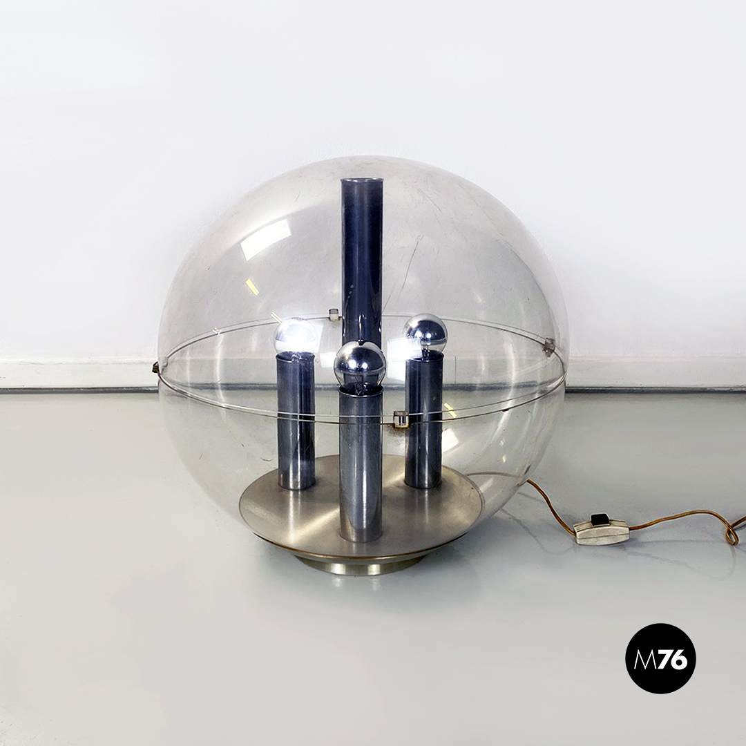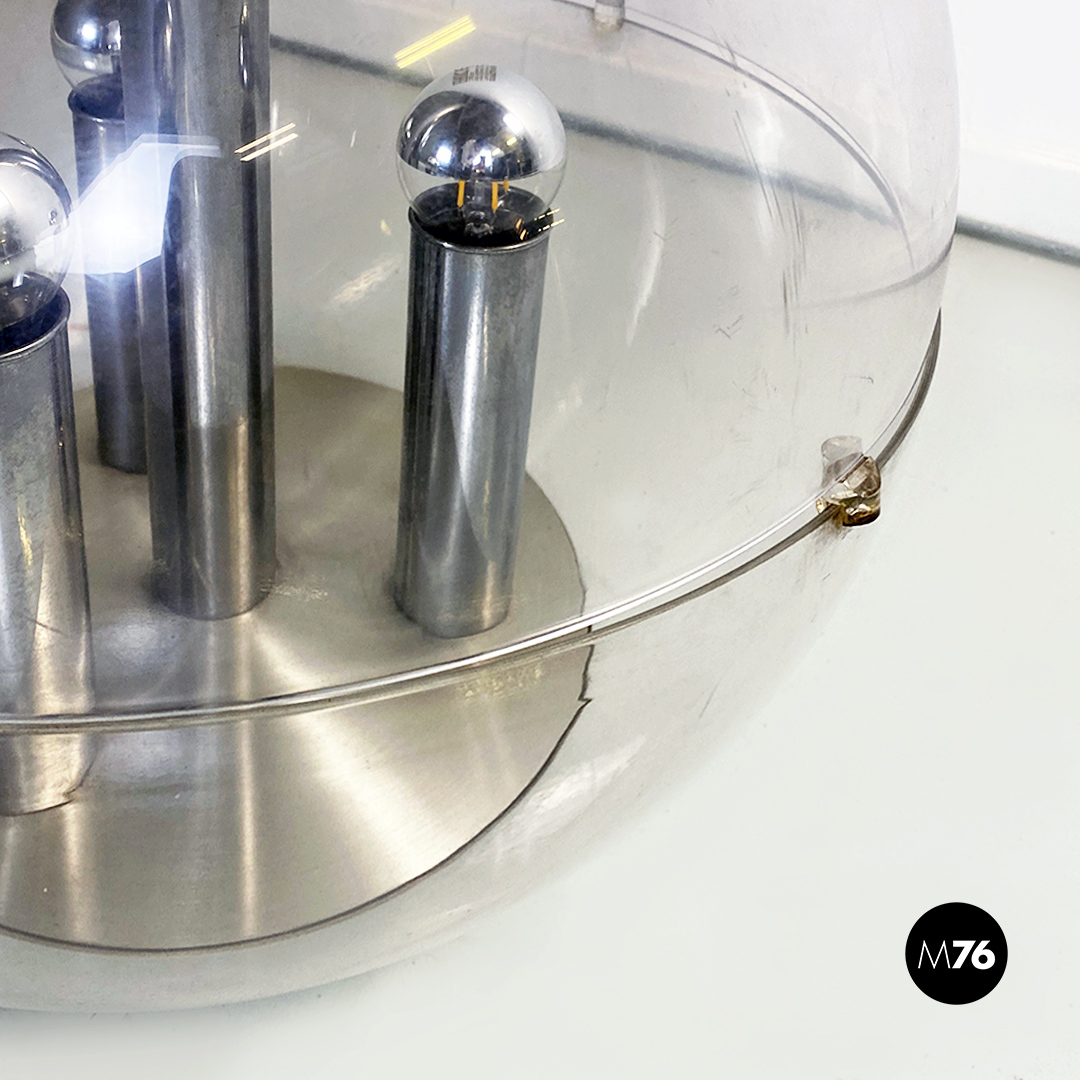 Lampada da tavolo a tre luci con base tonda in alluminio, stelo centrale interno a sezione tonda e altri tre steli di altezza inferiore sempre a sezione tonda provvisti di portalampada con attacco E27. Diffusore in plastica trasparente, con parte superiore appoggiata ad incastro su quella inferiore tramite quattro distanziatori in plexiglass.