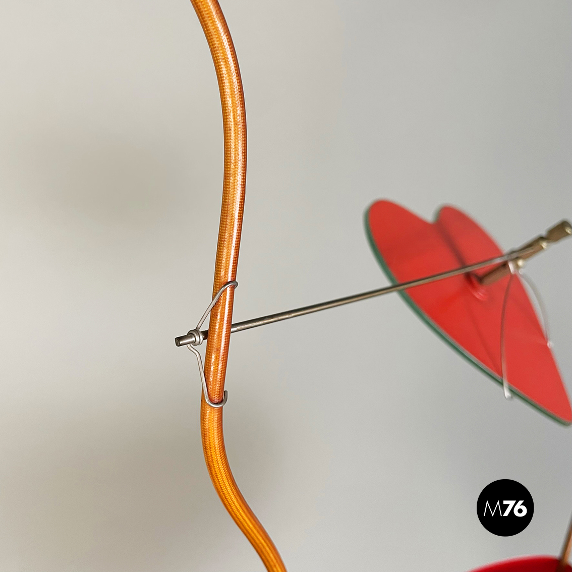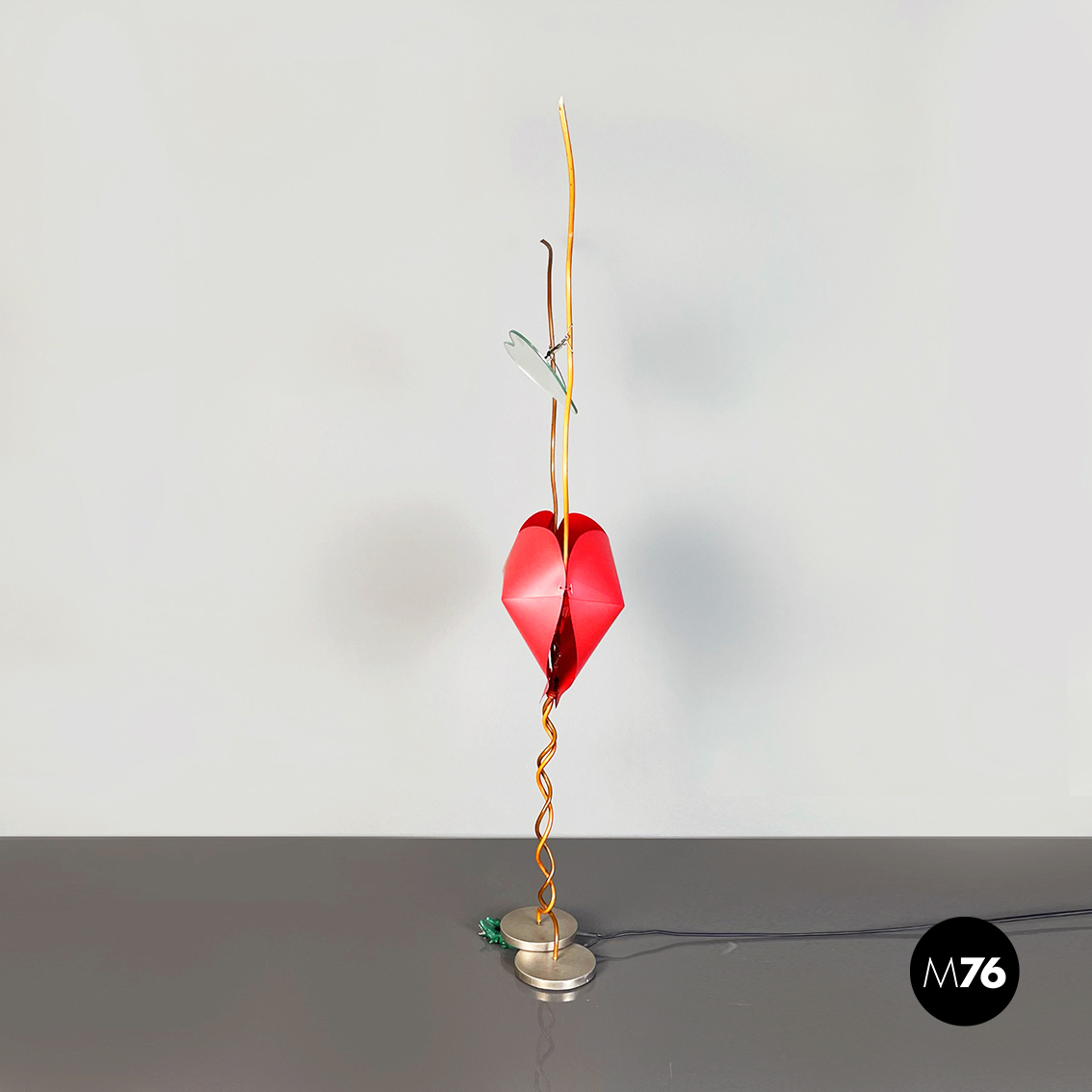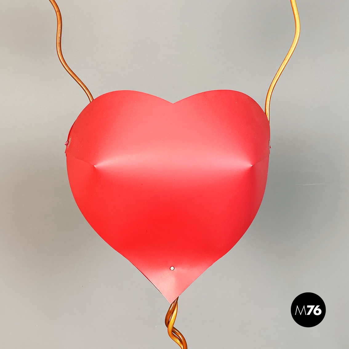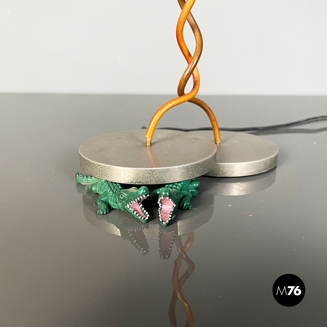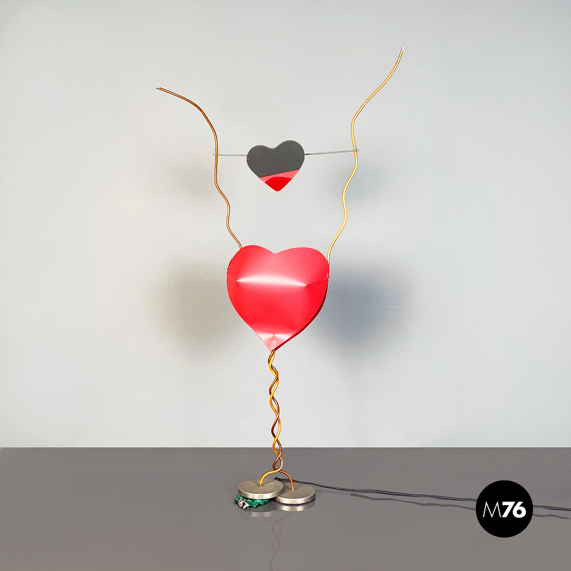 Lampada da tavolo modello One From The Heart con diffusore a forma di cuore in plastica. Sopra il diffusore è presente uno specchio a forma di cuore sospeso e orientabile, con il quale è possibile creare effetti di luce speciali. La struttura centrale è composta da due tubolari arancioni che si intrecciano. La base è composta da due tondi in metallo e sotto uno dei due sono presenti due coccodrilli con la bocca aperta.