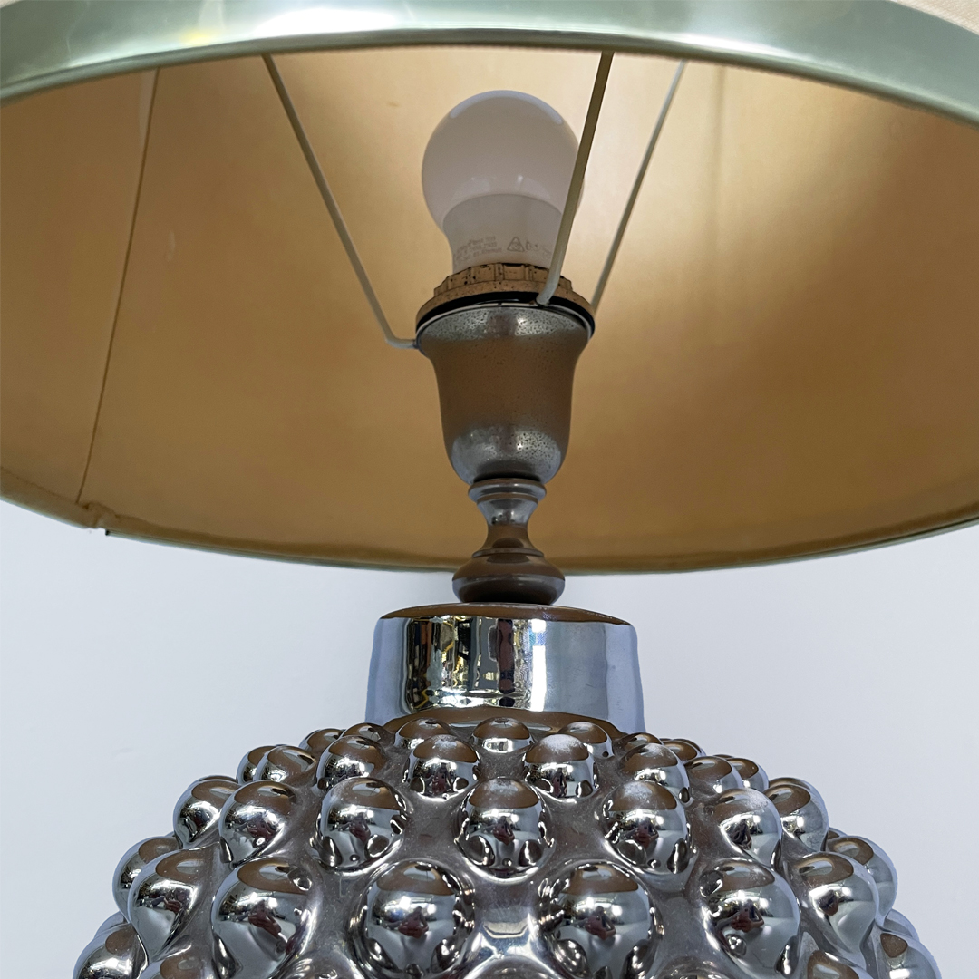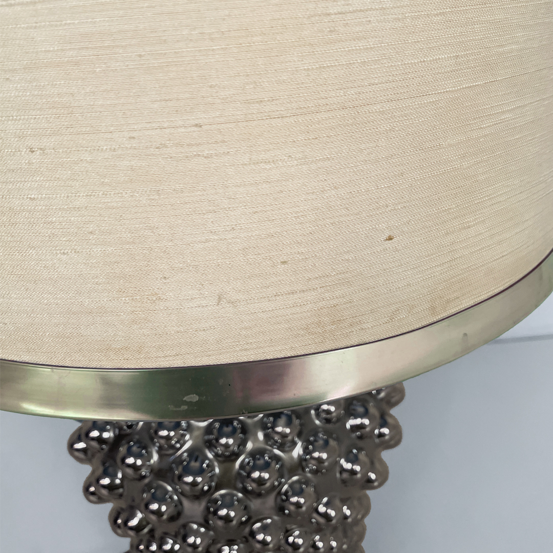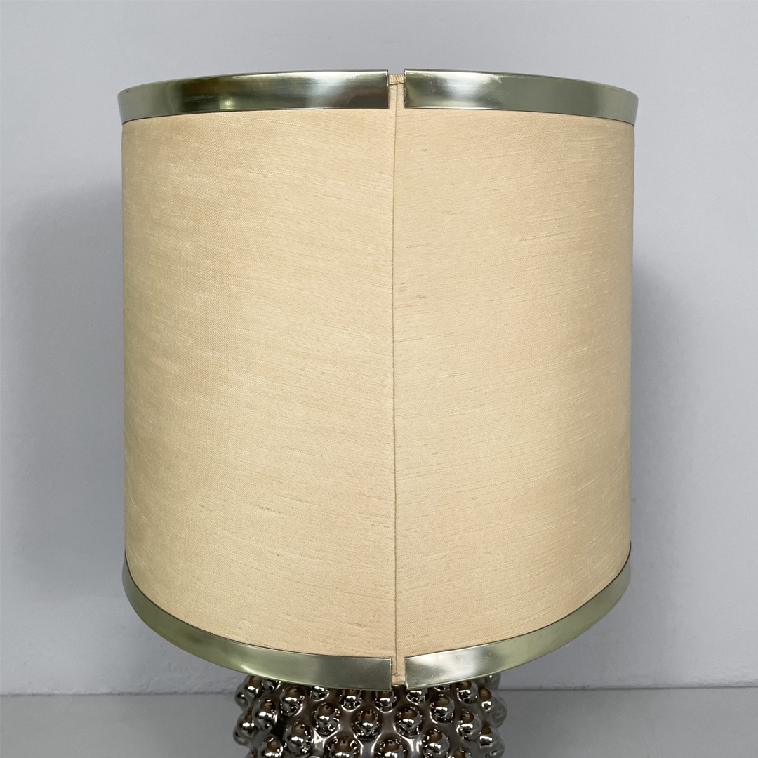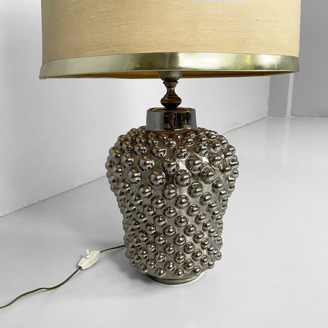 La base, più stretta alla base e si allarga verso l’alto, è in ceramica galvanizzata di colore argento.