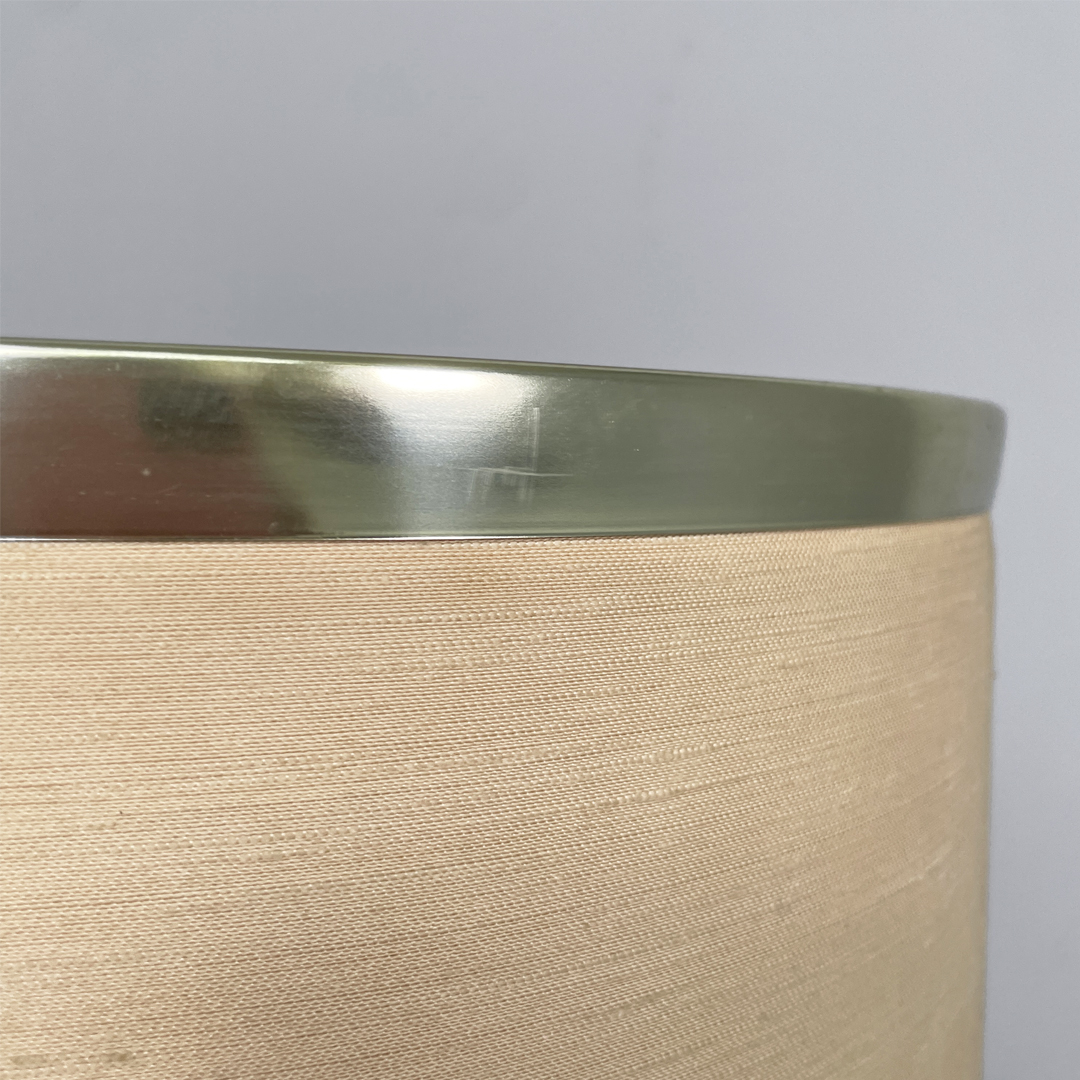 Lampada da tavolo a base tonda in ceramica. Il paralume è in tessuto beige con due fasce in metallo.