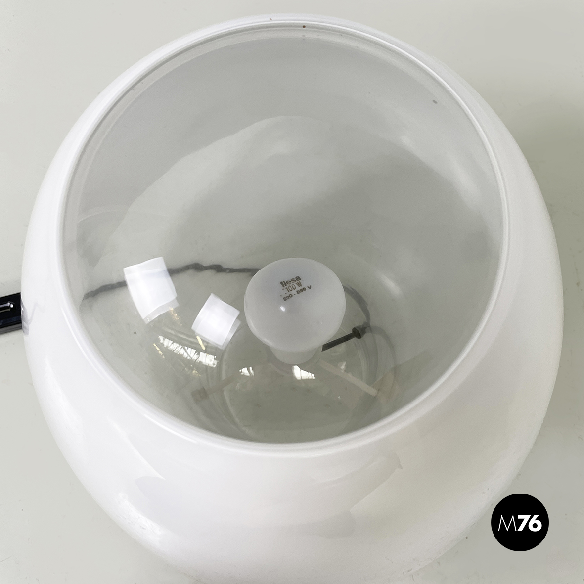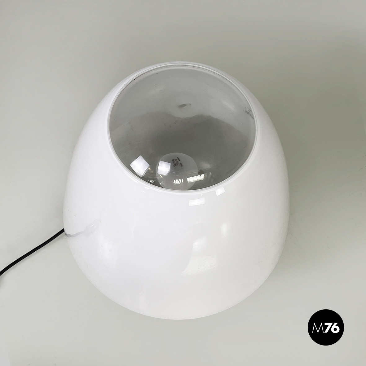 Lampada da tavolo modello Polluce interamente in vetro di Murano. Il paralume a base tonda in vetro opalino è orientabile, infatti è solo appoggiato alla struttura a forma di lampadina in veto trasparente. La fonte luminosa è posizionata all’interno della struttura.
