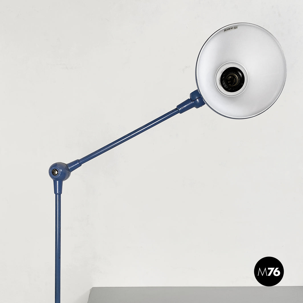 Lampada da tavolo regolabile con morsetto, in metallo verniciato blu e paralume verniciato bianco all’interno, con interruttore sul paralume.