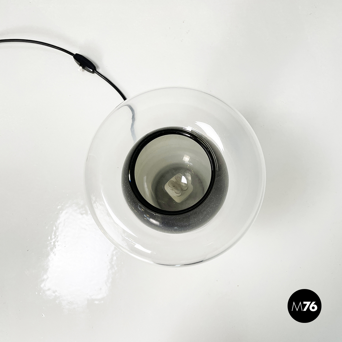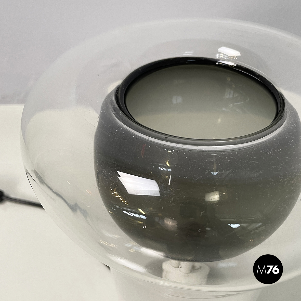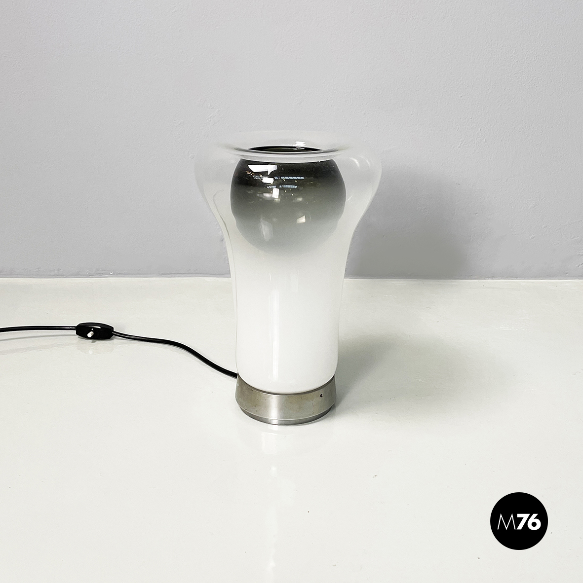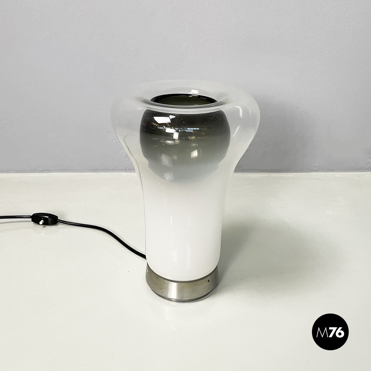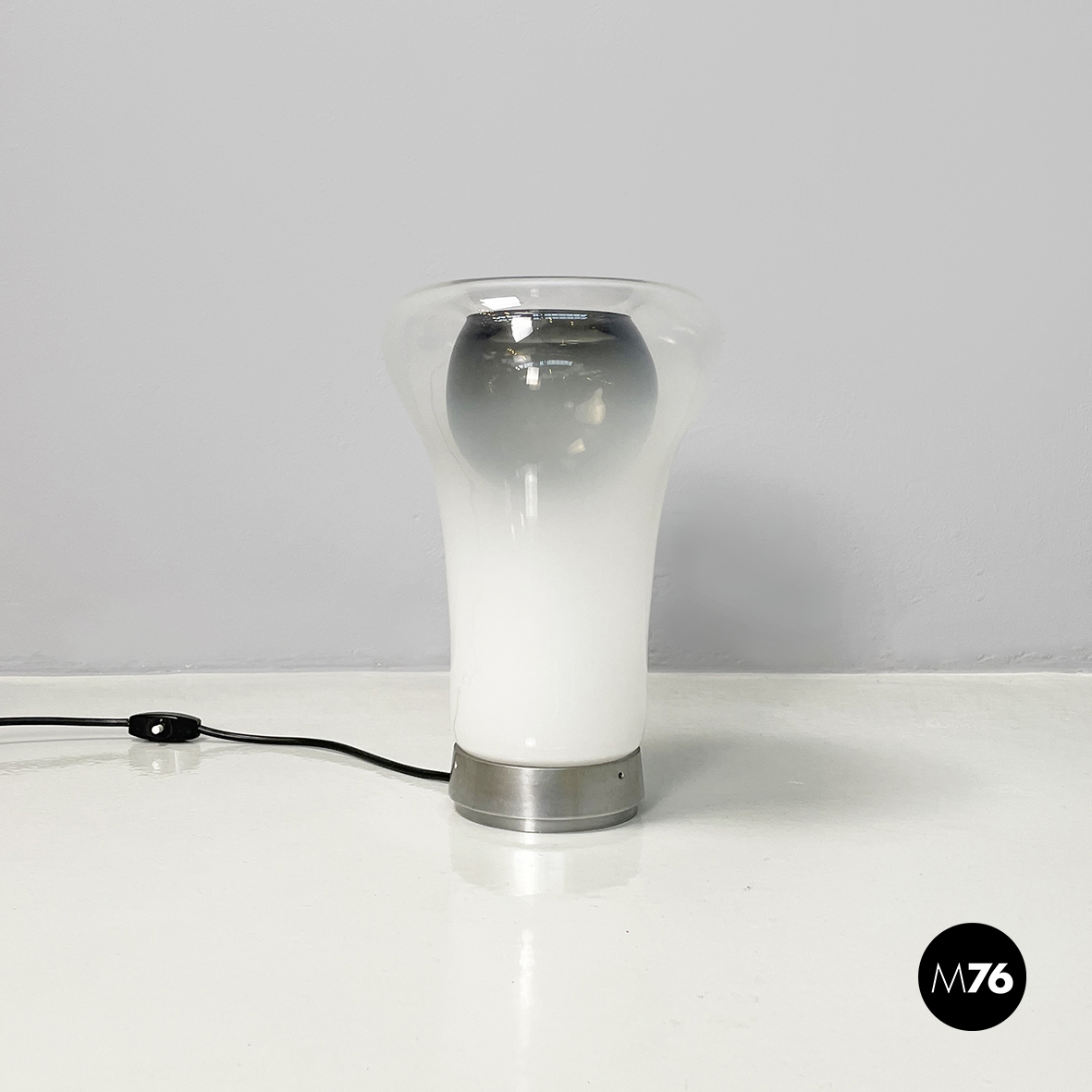 Lampada da tavolo modello Saffo con base tonda in metallo. Il diffusore, lavorato a mano, è in vetro soffiato opalino che sfuma nel trasparente e in vetro soffiato nero.