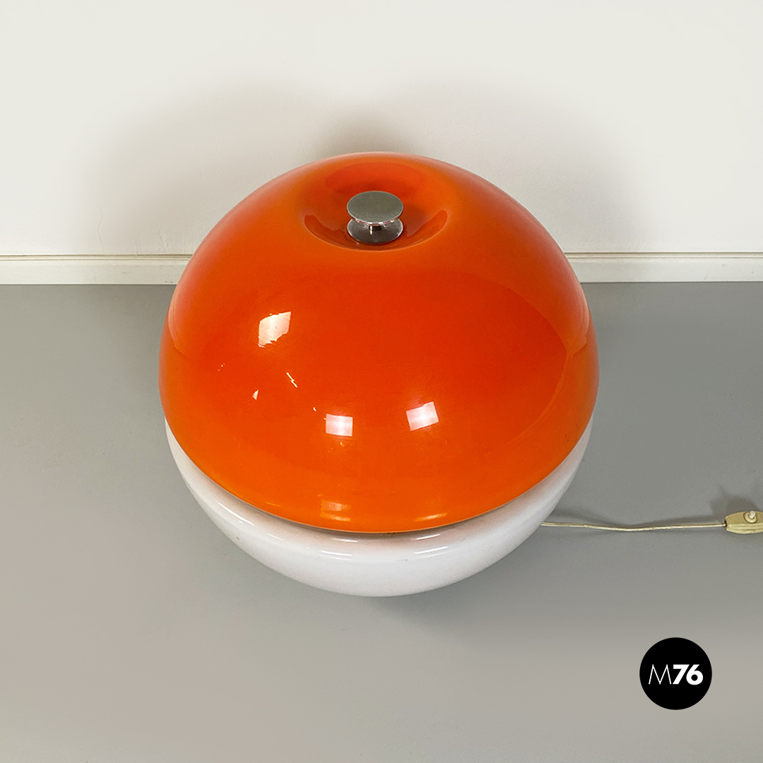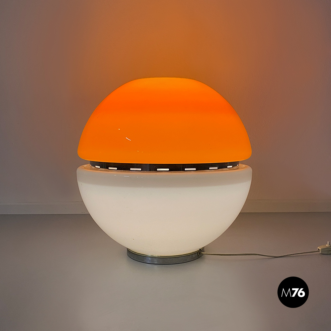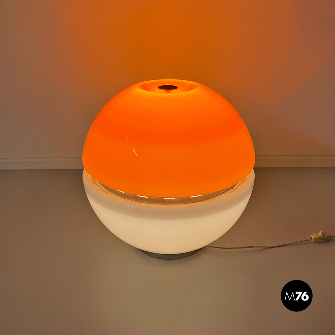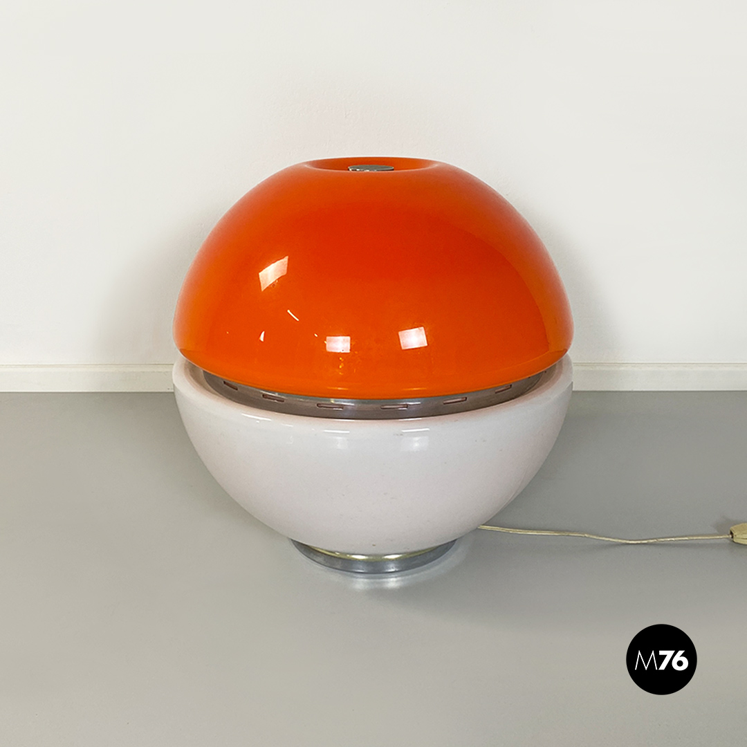 Lampada da tavolo Space Age, di forma sferica, composta da due semisfere in vetro opaline, una di colore bianco e l’altra arancione, con dettagli in acciaio cromato.