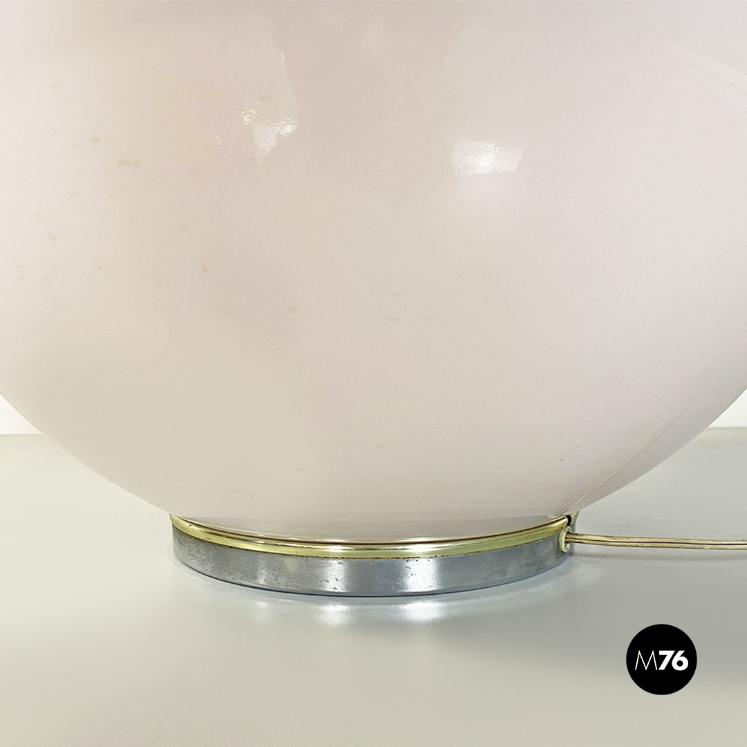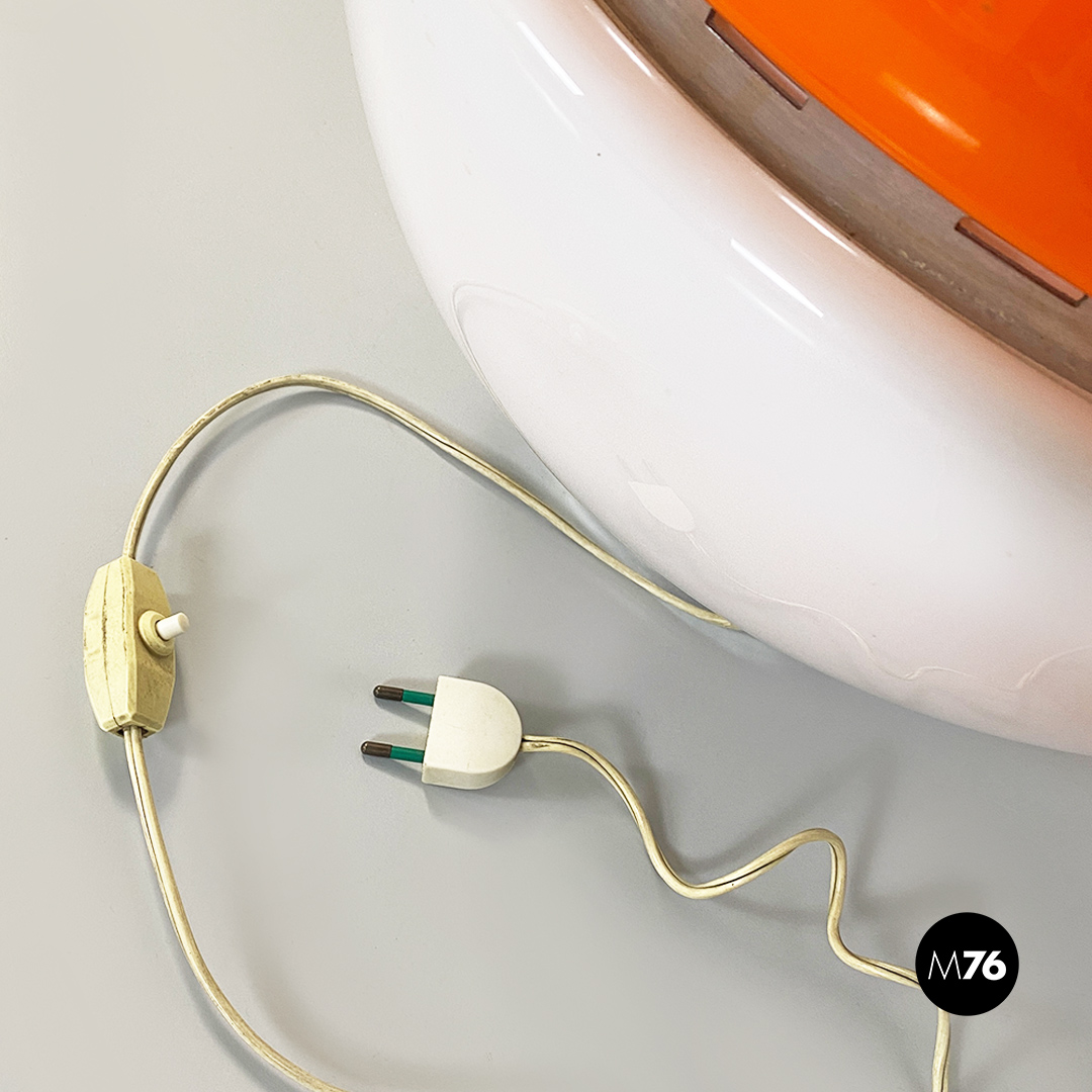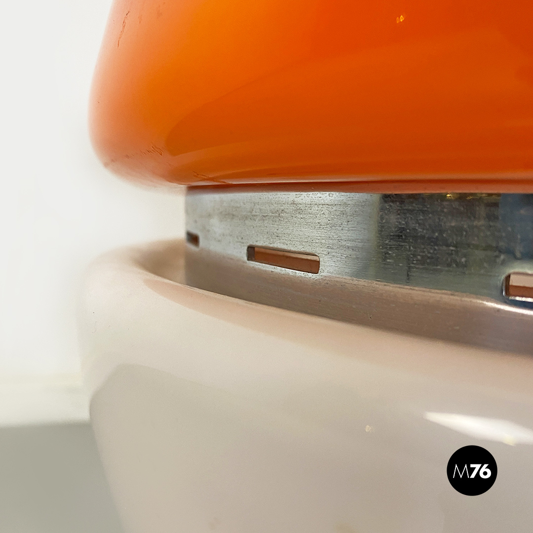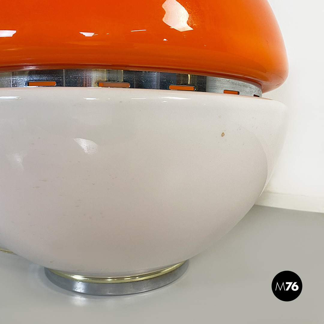 Lampada da tavolo Space Age, di forma sferica, composta da due semisfere in vetro opaline, una di colore bianco e l’altra arancione, con dettagli in acciaio cromato.