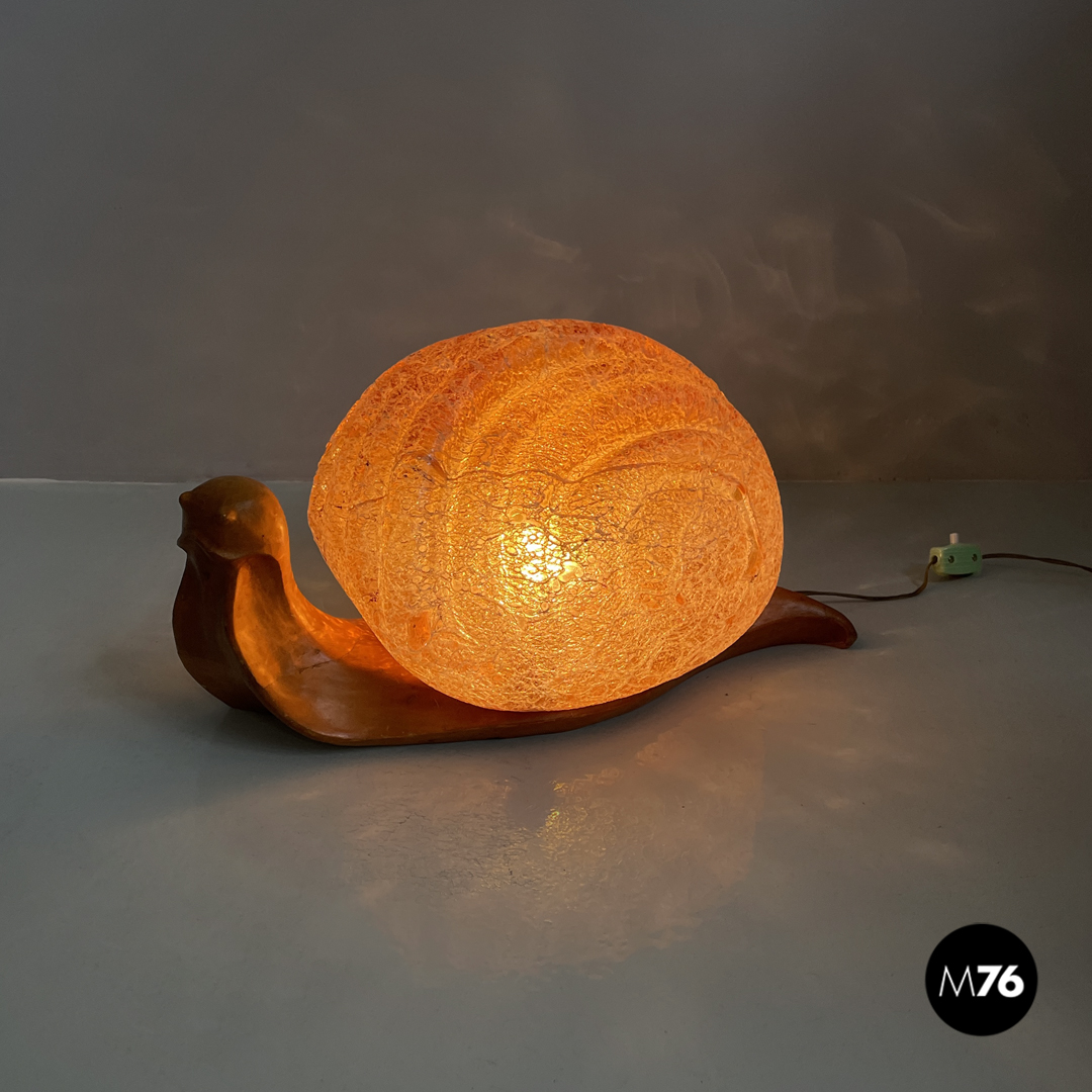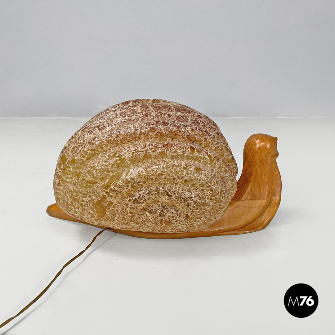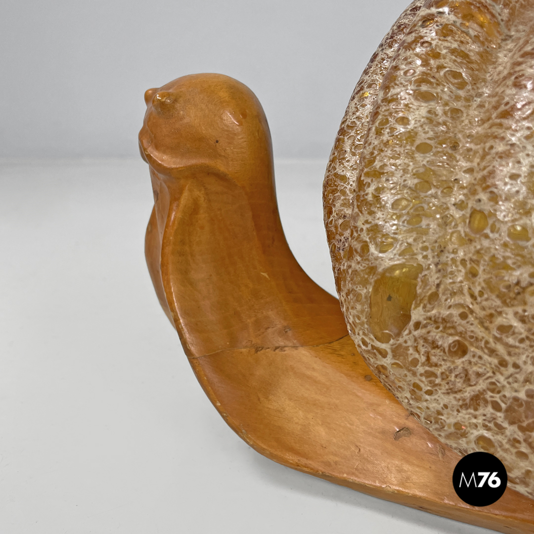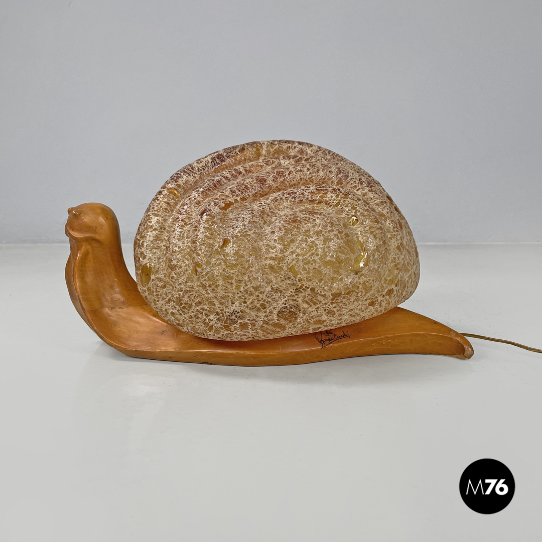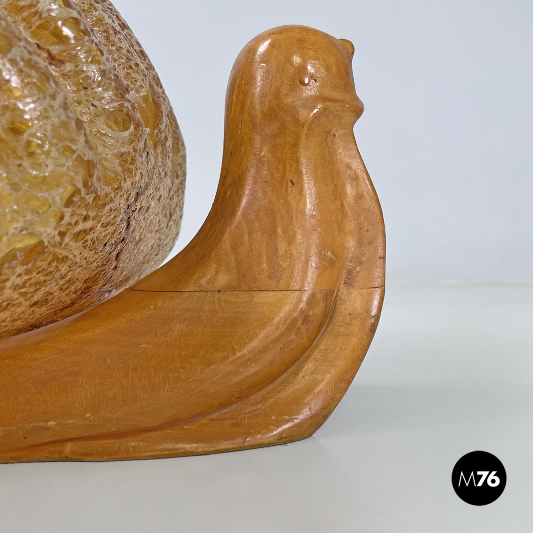 Lampada da tavolo modello Snail in legno. La lampada rappresenta una lumaca, il corpo è in legno sagomato lavorato a mano, mentre il guscio, che contiene il punto luce, è in vetro di Murano pulegoso sui toni caldi del marrone chiaro e dell’arancione.