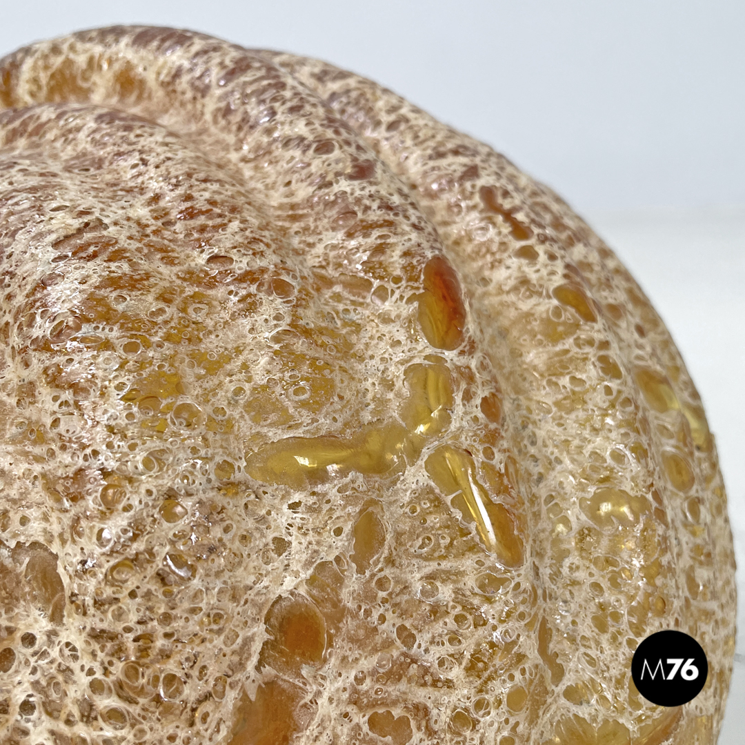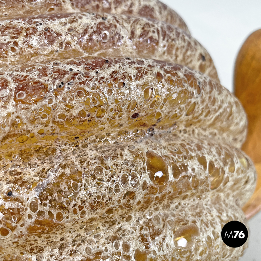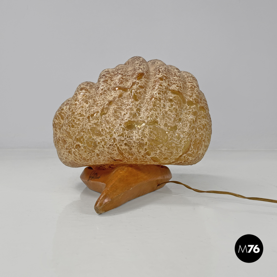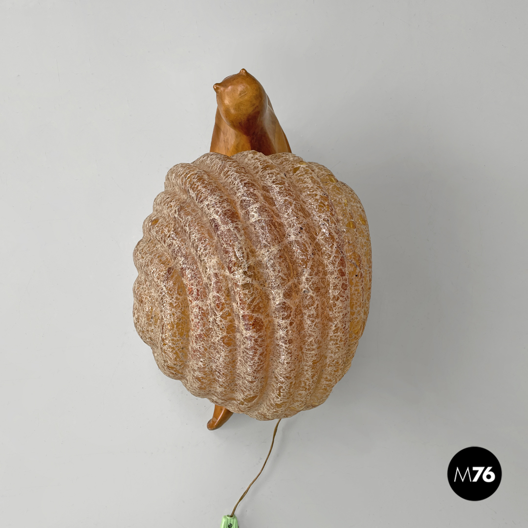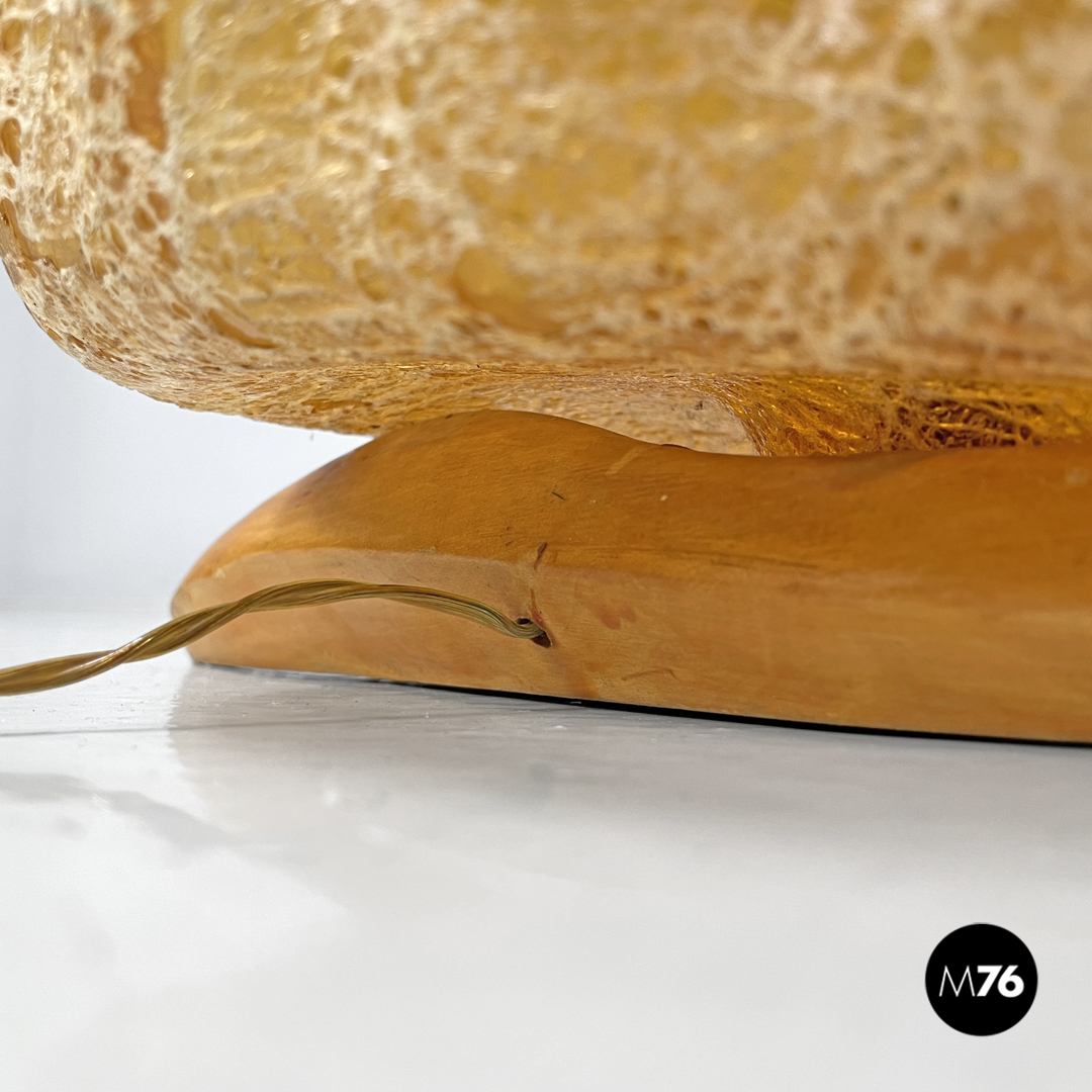 Lampada da tavolo modello Snail in legno. La lampada rappresenta una lumaca, il corpo è in legno sagomato lavorato a mano, mentre il guscio, che contiene il punto luce, è in vetro di Murano pulegoso sui toni caldi del marrone chiaro e dell’arancione.