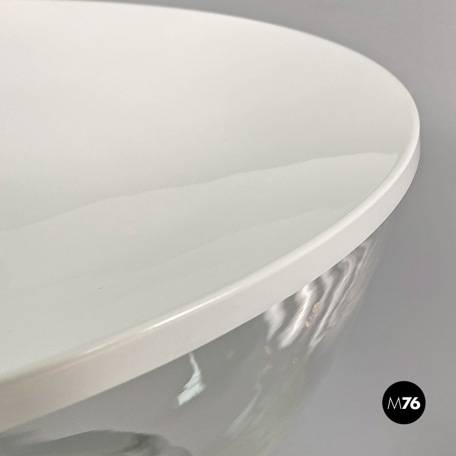 Lampada da tavolo modello Taccia a luce indiretta e riflessa, con riflettore in metallo verniciato color bianco lucido e diffusore orientabile in vetro trasparente soffiato. Il diffusore si regge su un corpo sagomato in alluminio di colore nero, con base in acciaio lucidato, nichelato e zapponato.