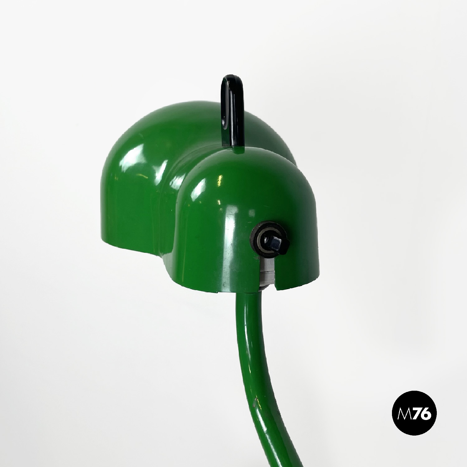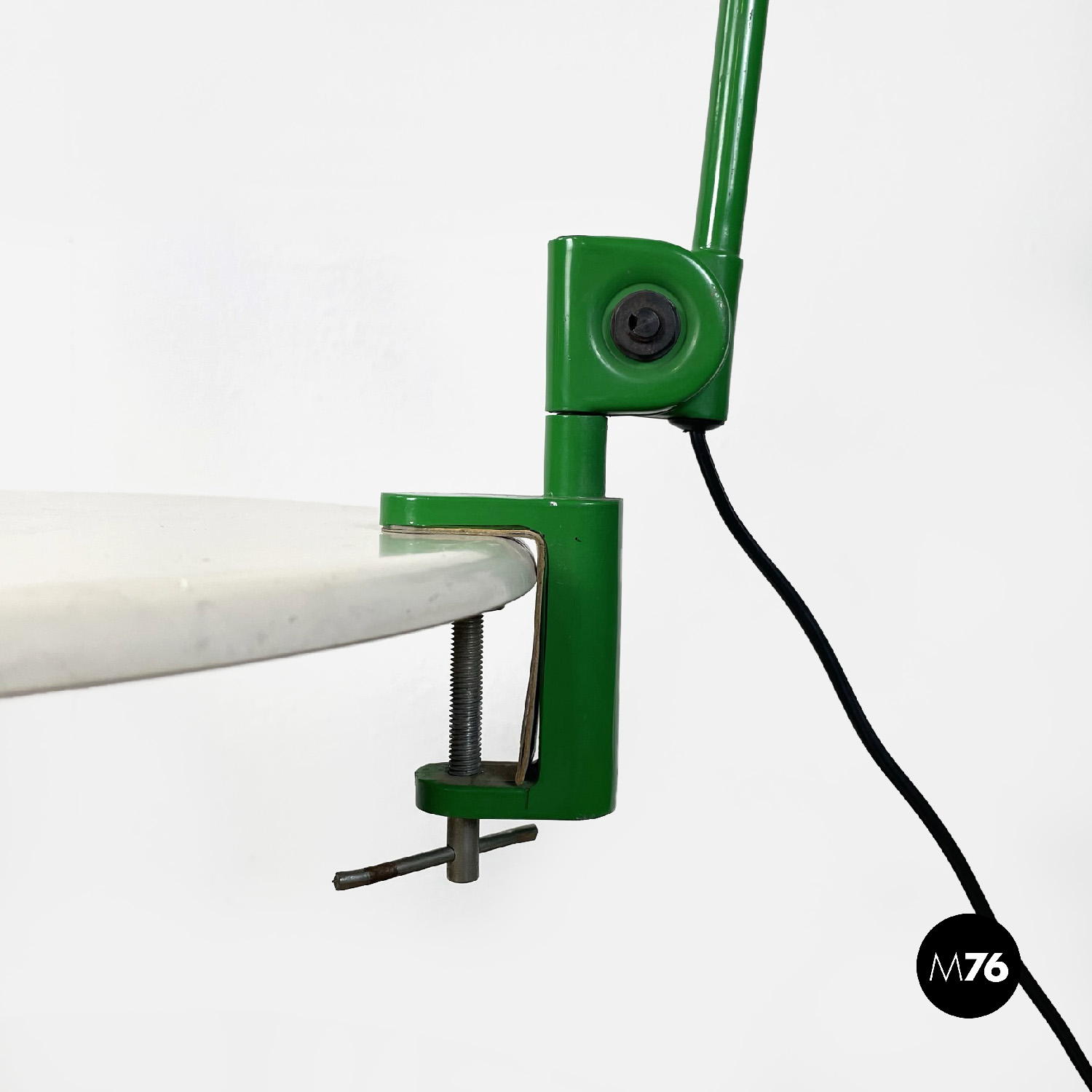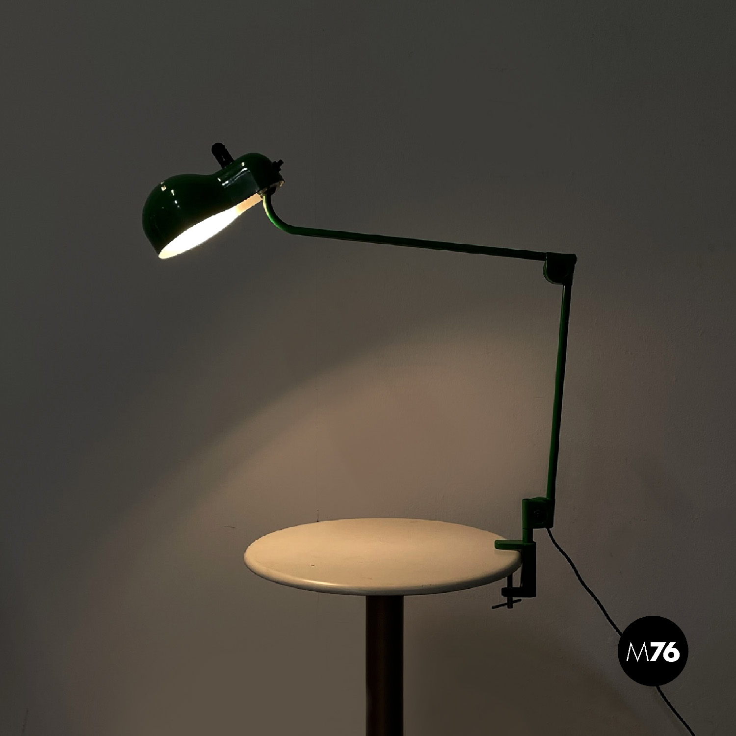 Lampada da tavolo modello Topo con morsetto. La struttura è regolabile, il paralume ha una maniglia in plastica nera per direzionarlo. La lampada è in metallo verniciato verde con finitura lucida, presenta dettagli in plastica nera.