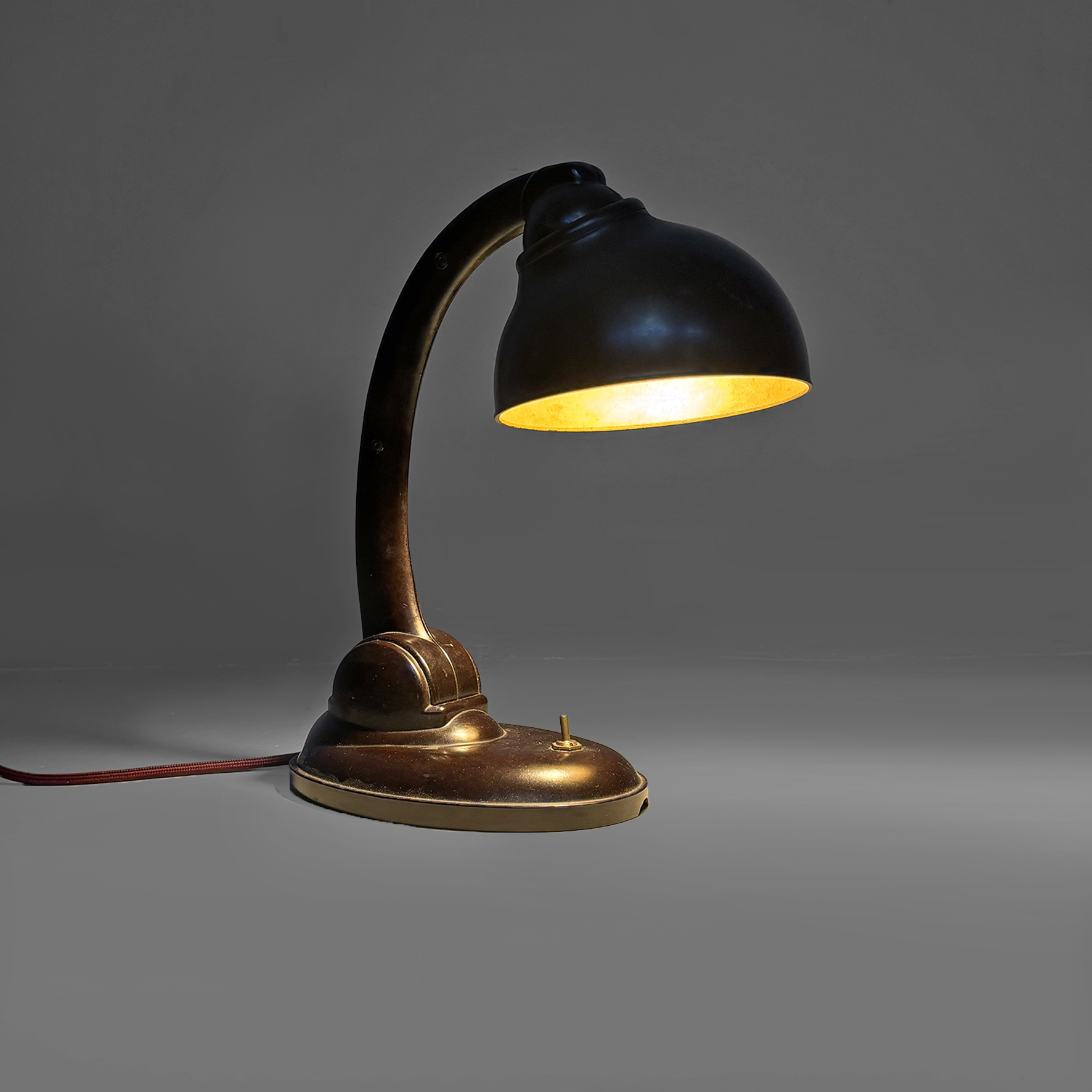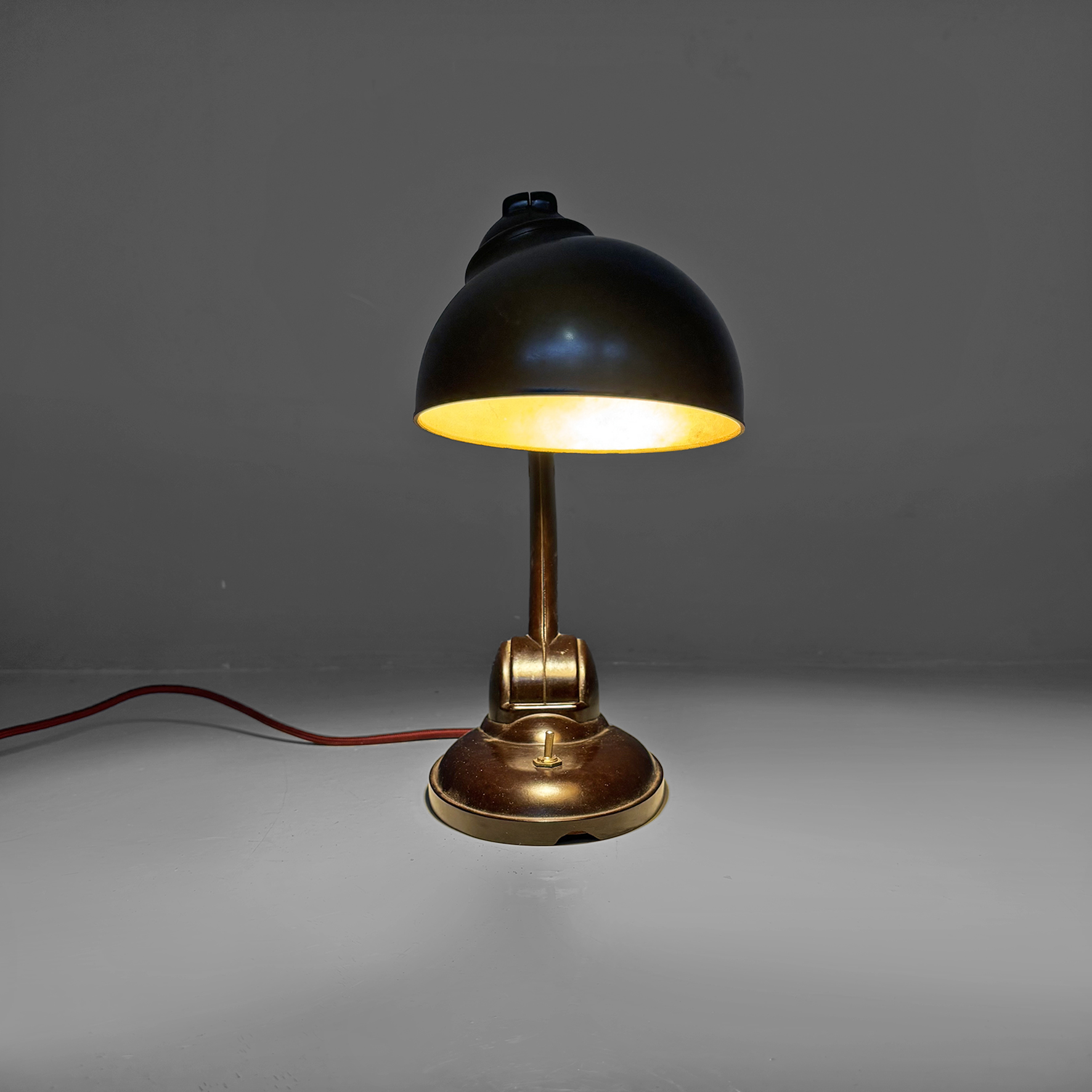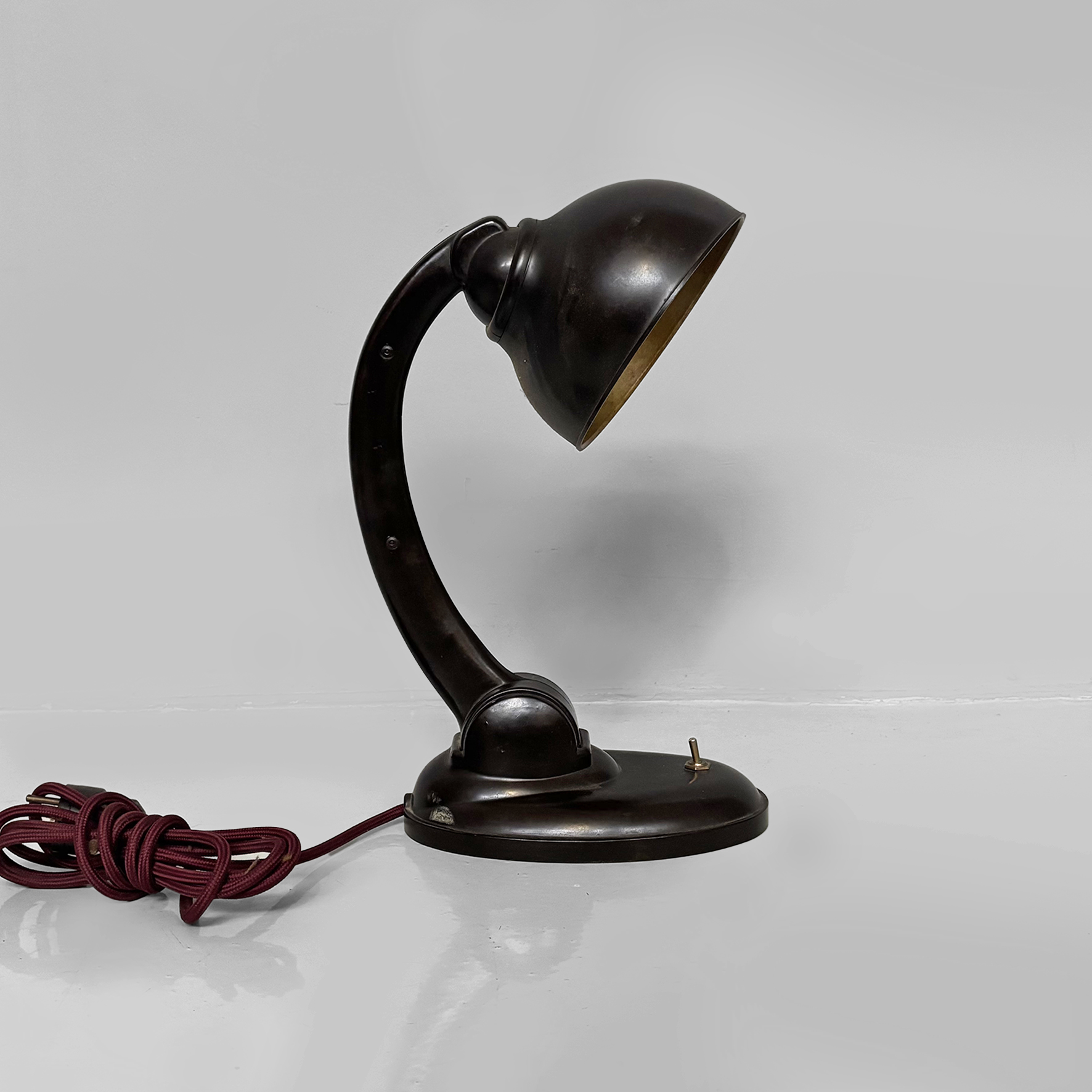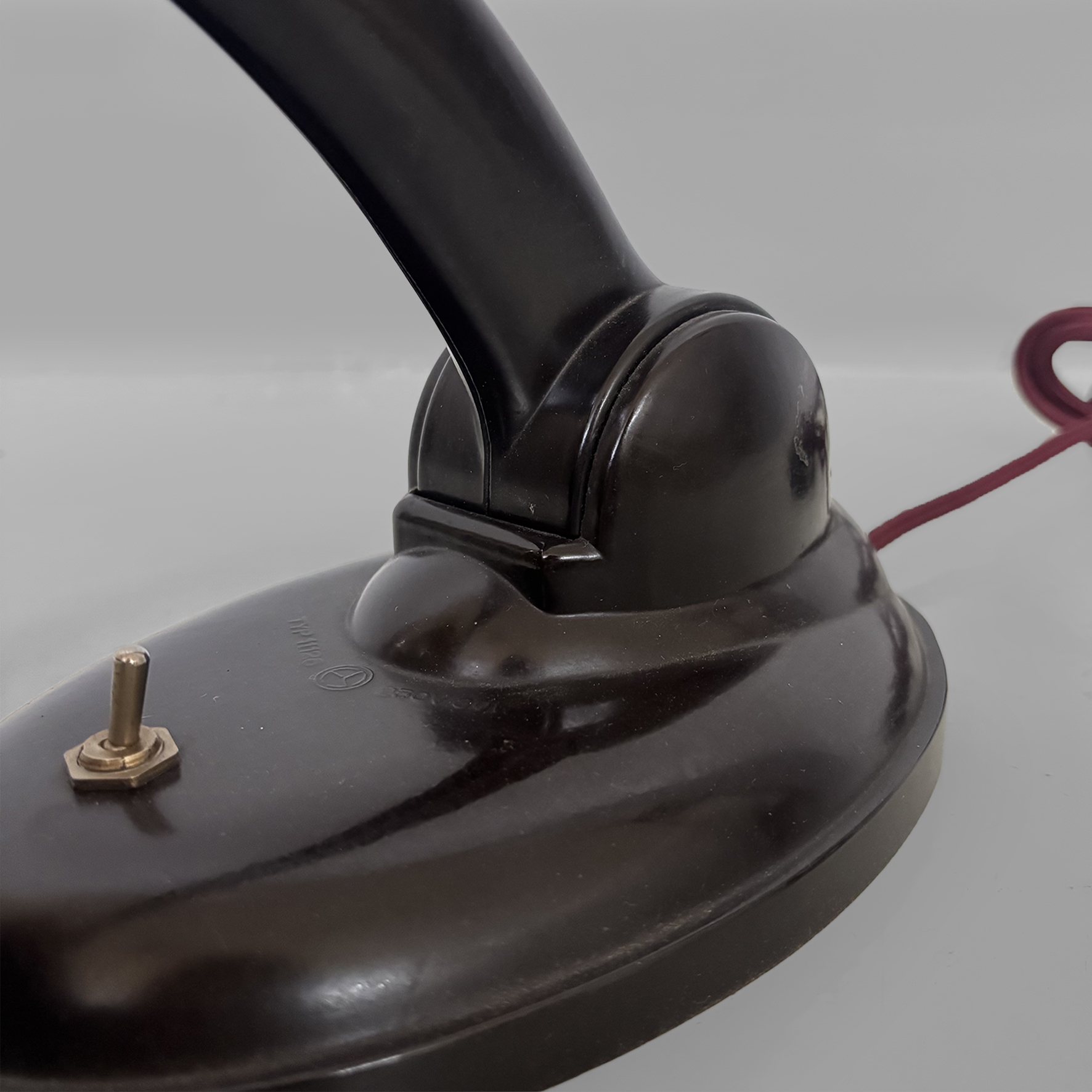 Lampada da tavolo modello Type 11126 interamente in bachelite marrone scuro. Presenta un braccio arcuato regolabile in altezza che collega il paralume direzionabile di forma tonda con la base, dotata di un piccolo interruttore a levetta in metallo. Il cavo è rivestito in corda rossa.