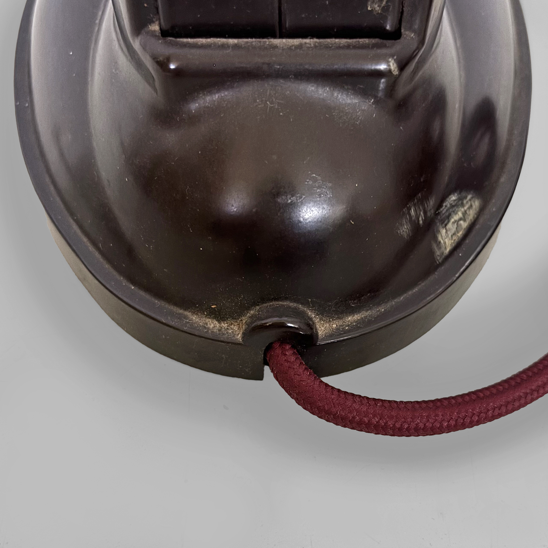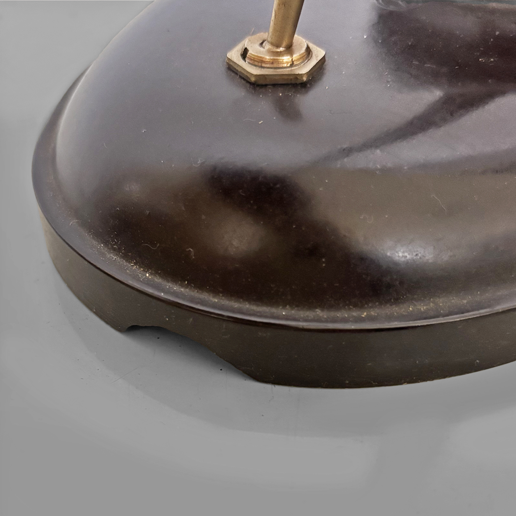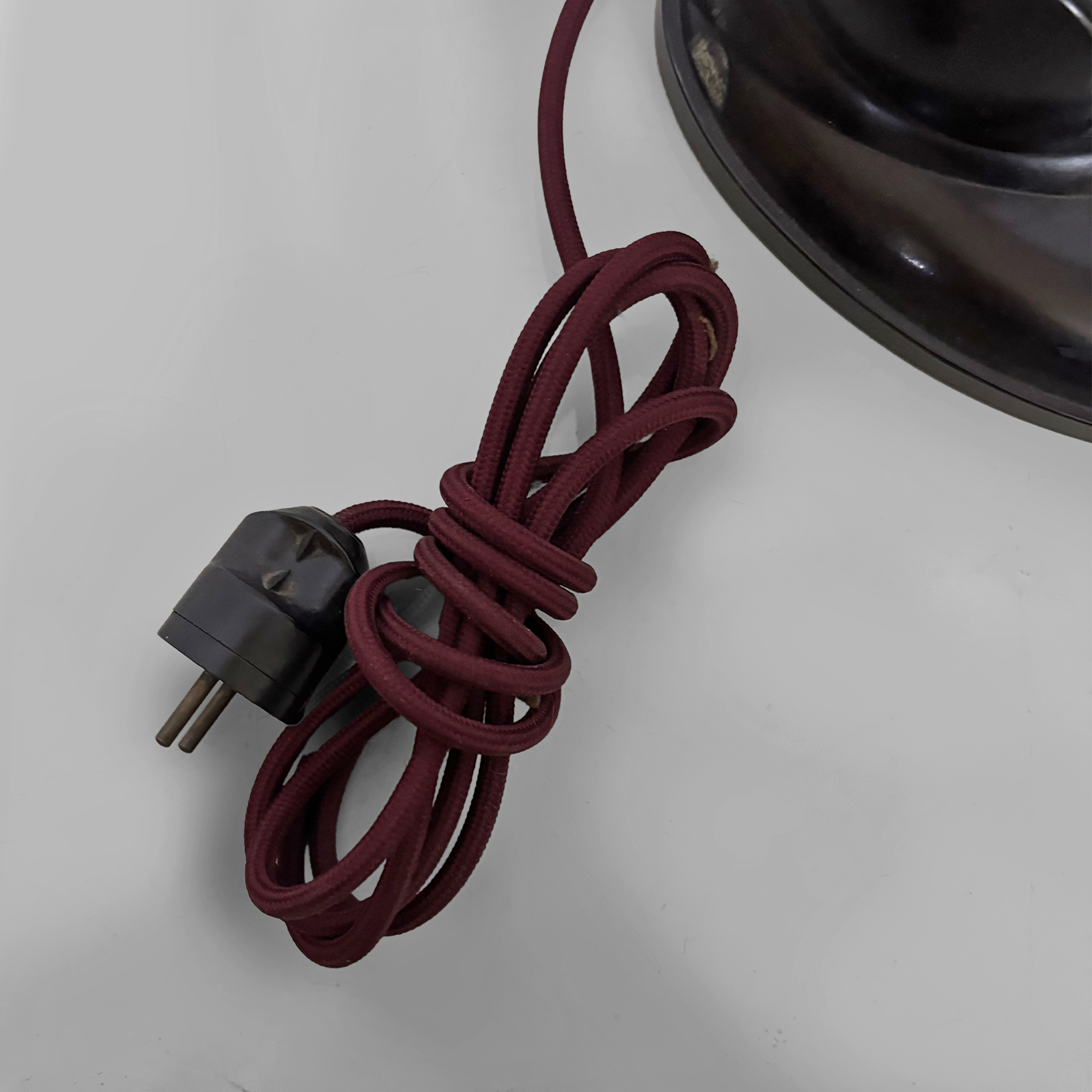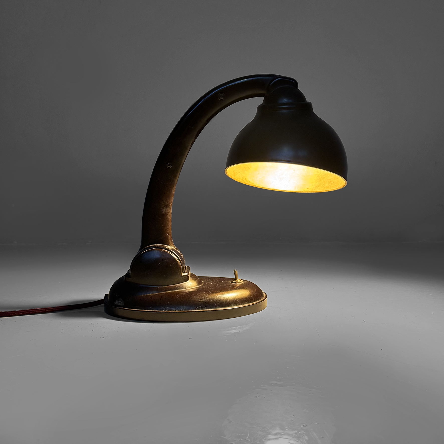 Lampada da tavolo modello Type 11126 interamente in bachelite marrone scuro. Presenta un braccio arcuato regolabile in altezza che collega il paralume direzionabile di forma tonda con la base, dotata di un piccolo interruttore a levetta in metallo. Il cavo è rivestito in corda rossa.