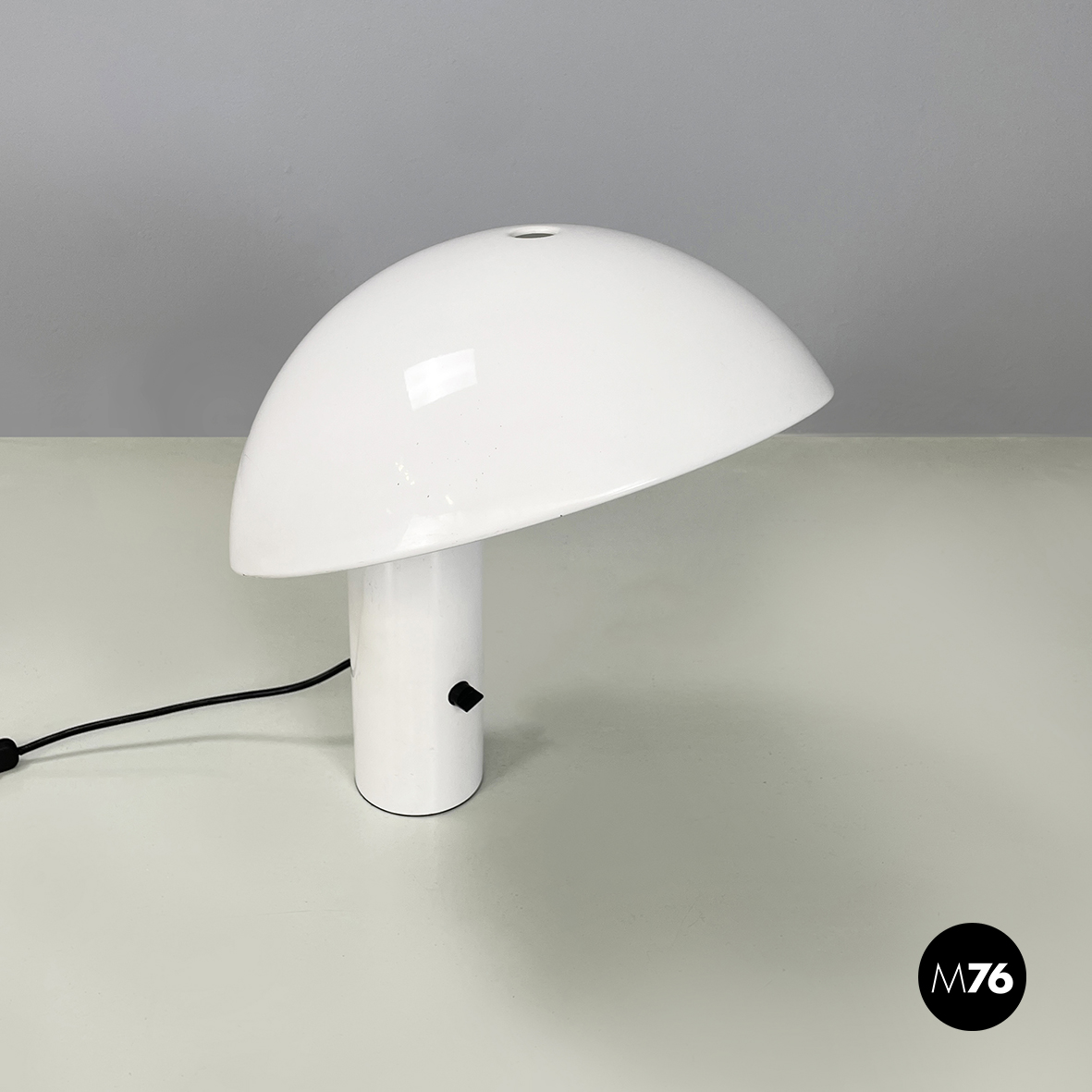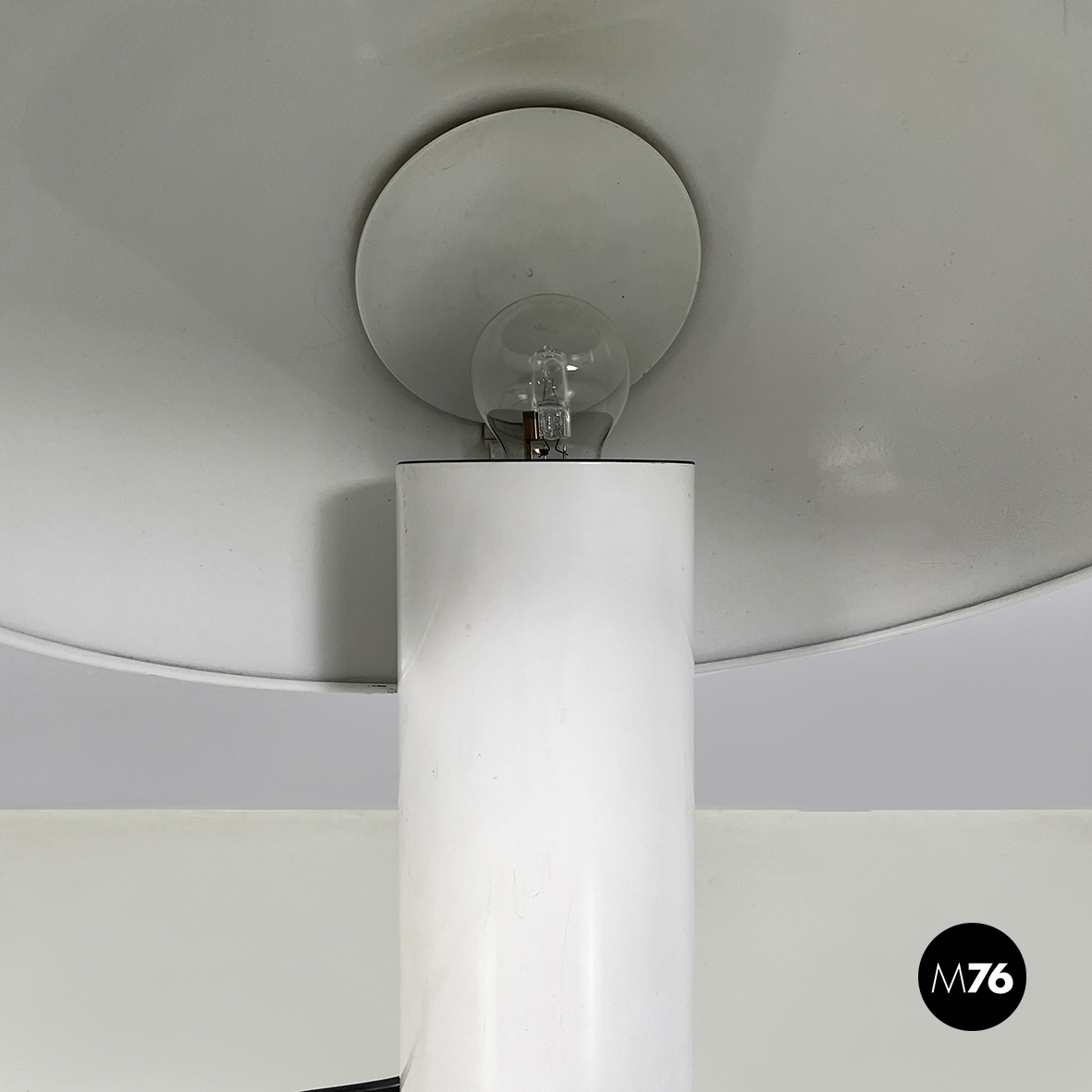 Lampada da tavolo modello Vaga interamente in metallo verniciato bianco. Il diffusore inclinato e a cupola presenta un foro nella parte superiore, infatti la luce si diffonde da sotto e da sopra. Sulla base cilindrica è presente l’interruttore nero.