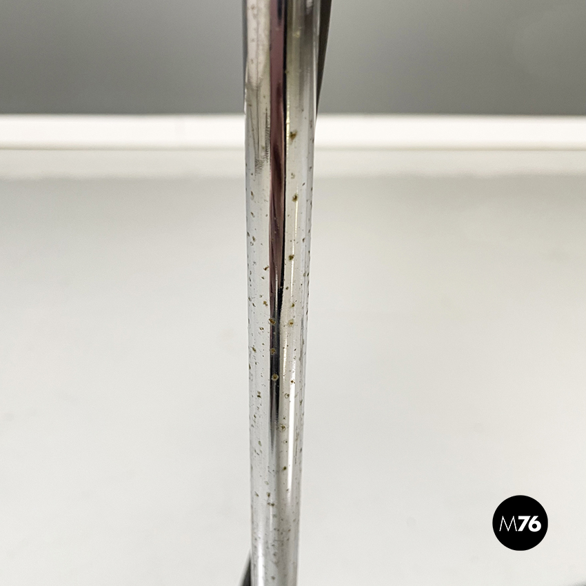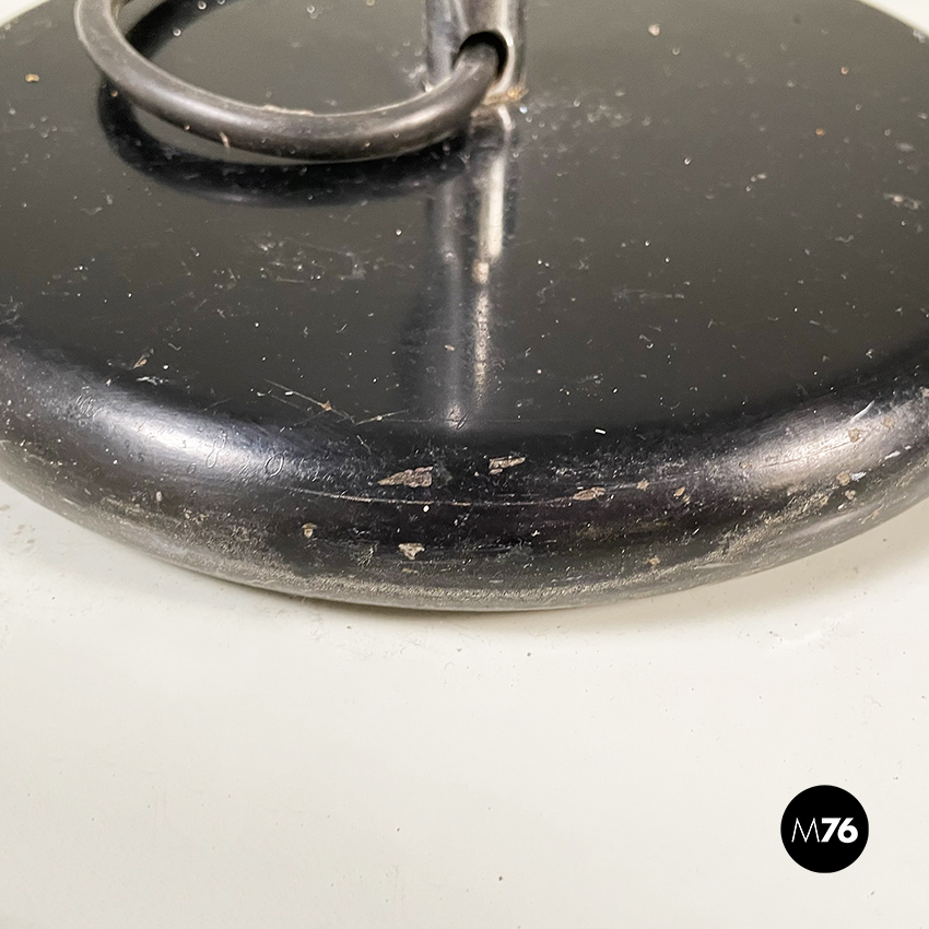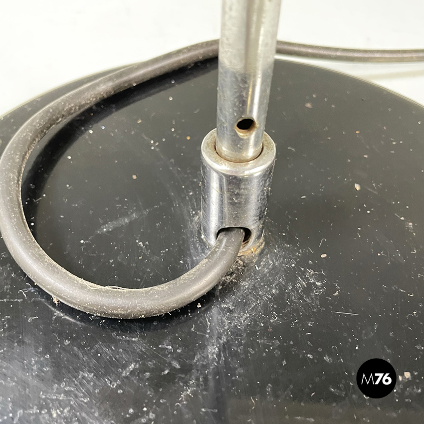 Lampada da terra modello 626 con diffusore orientabile in metallo curvato nero. Il diffusore presenta luce a alogena. La struttura centrale è in tondino di metallo cromato. Base tonda in metallo verniciato nero.