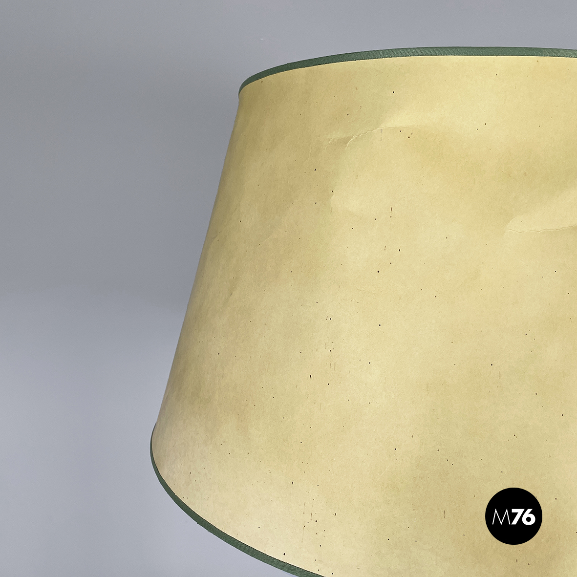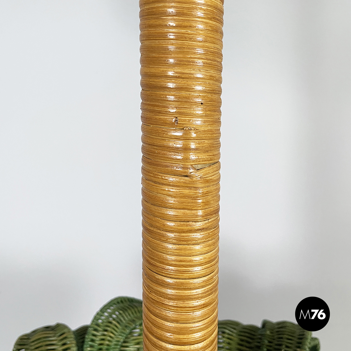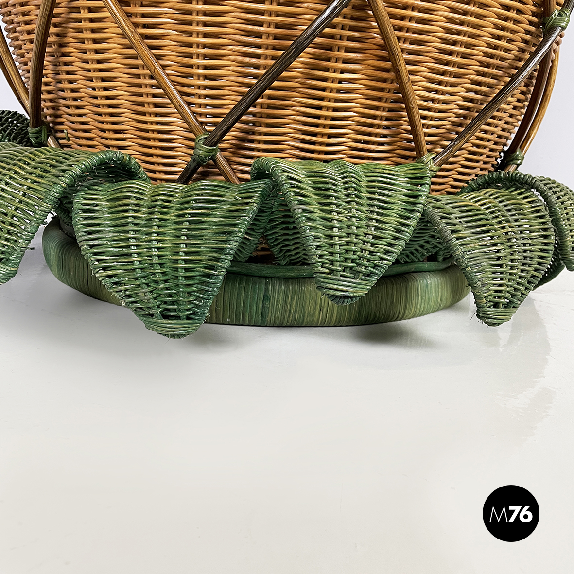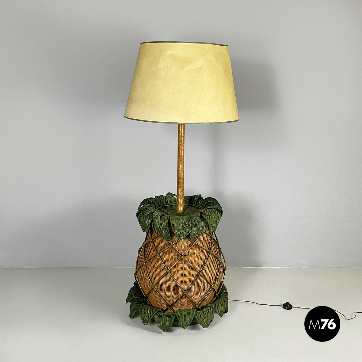 Lampada da terra con paralume a base tonda in carta beige con passamaneria in verde. La struttura è a sezione tonda è rivestiti in vimini. La base ricorda la forma di un ananas, in vimini intrecciato con alcuni dettagli in verde per le foglie e parti in rattan.