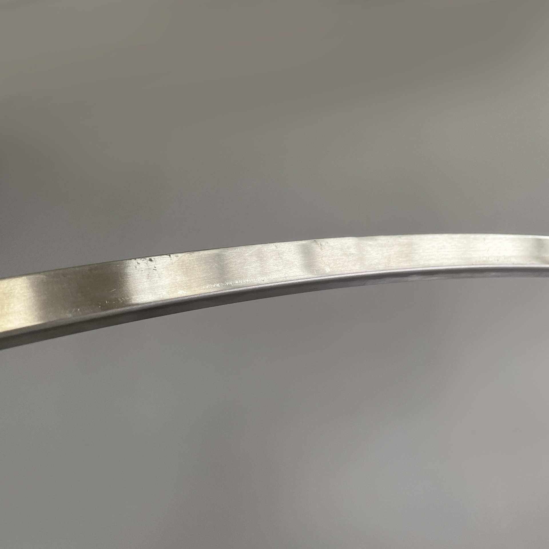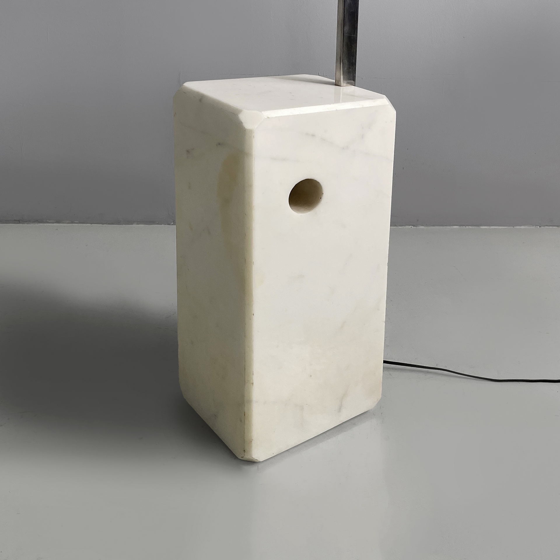 Lampada da terra modello Arco con diffusore a cupola orientabile e regolabile in altezza in alluminio. La struttura ad arco è uno stelo telescopico in acciaio inossidabile satinato. La base squadrata in marmo bianco di Carrara presenta un foro decorativo.