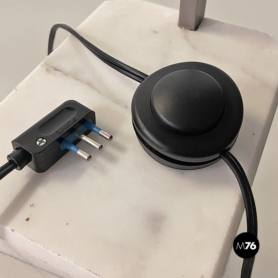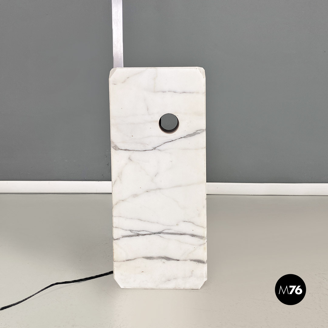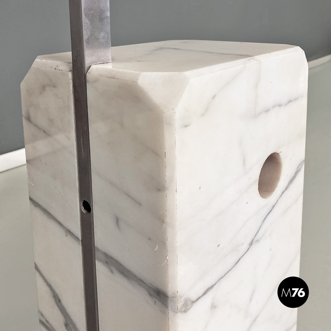 Lampada da terra modello Arco a luce diretta con base di marmo bianco di Carrara e stelo telescopico in acciaio inossidabile satinato. Riflettore orientabile e regolabile in altezza in alluminio stampato, lucidato e zapponato.