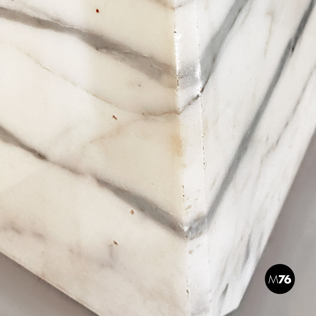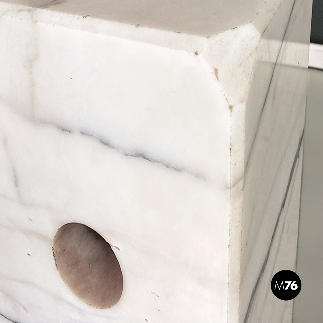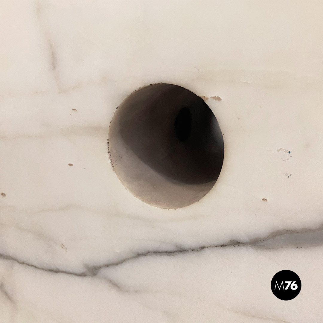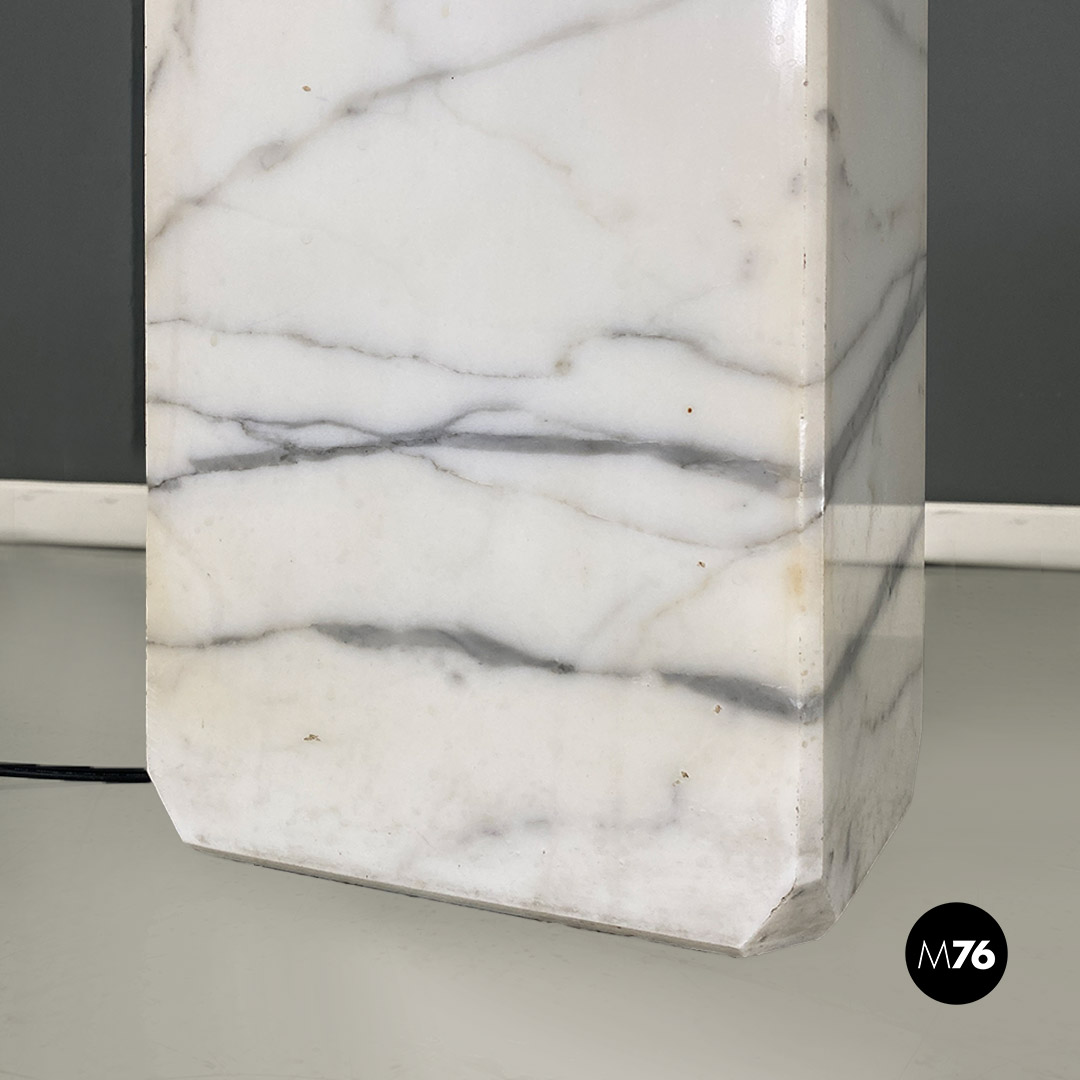 Lampada da terra modello Arco a luce diretta con base di marmo bianco di Carrara e stelo telescopico in acciaio inossidabile satinato. Riflettore orientabile e regolabile in altezza in alluminio stampato, lucidato e zapponato.