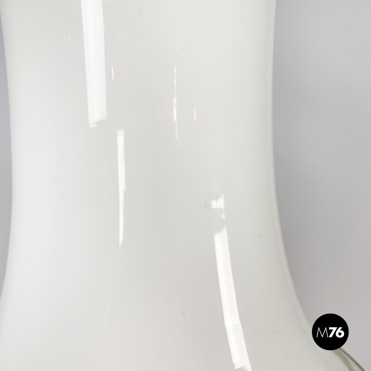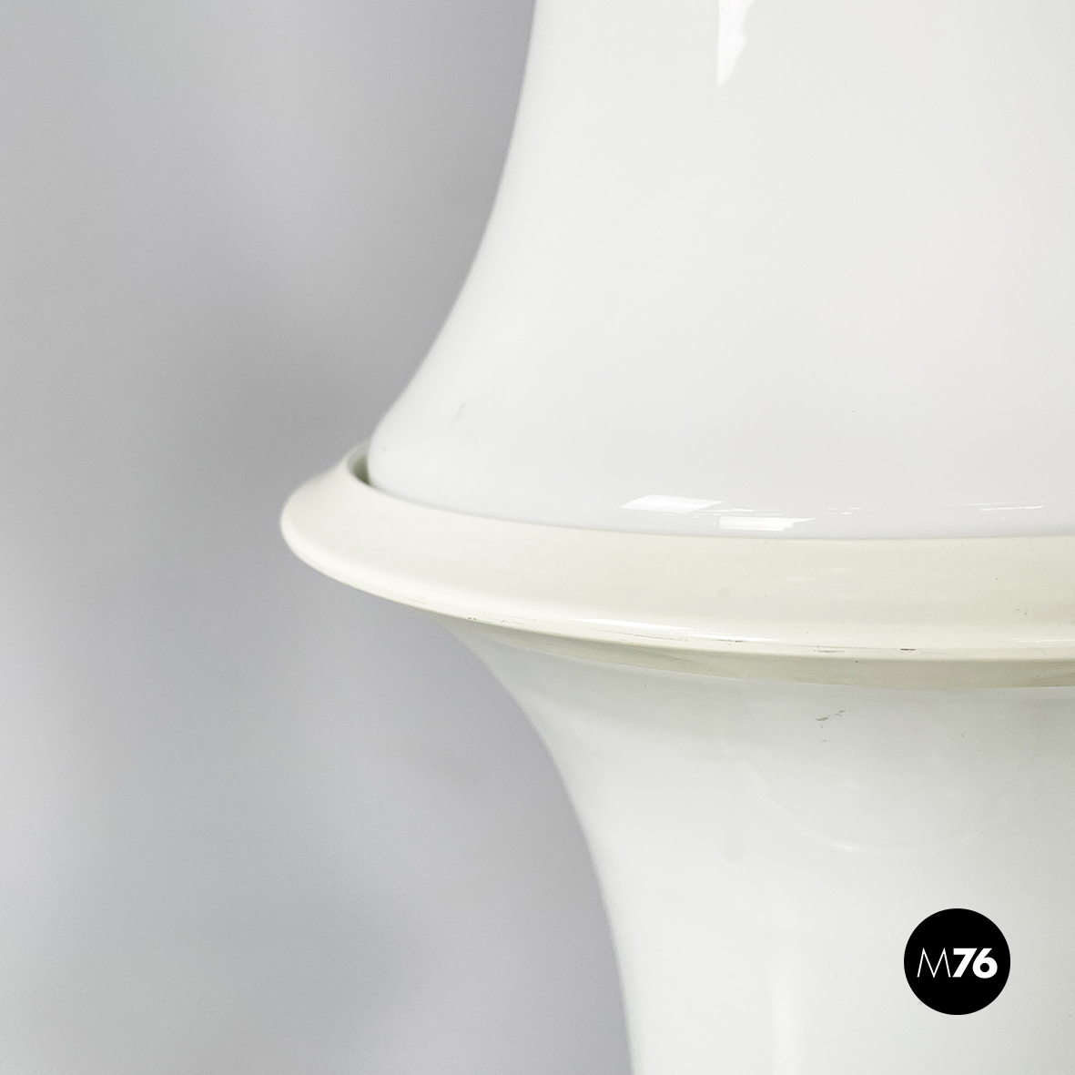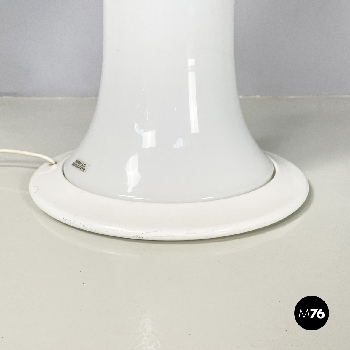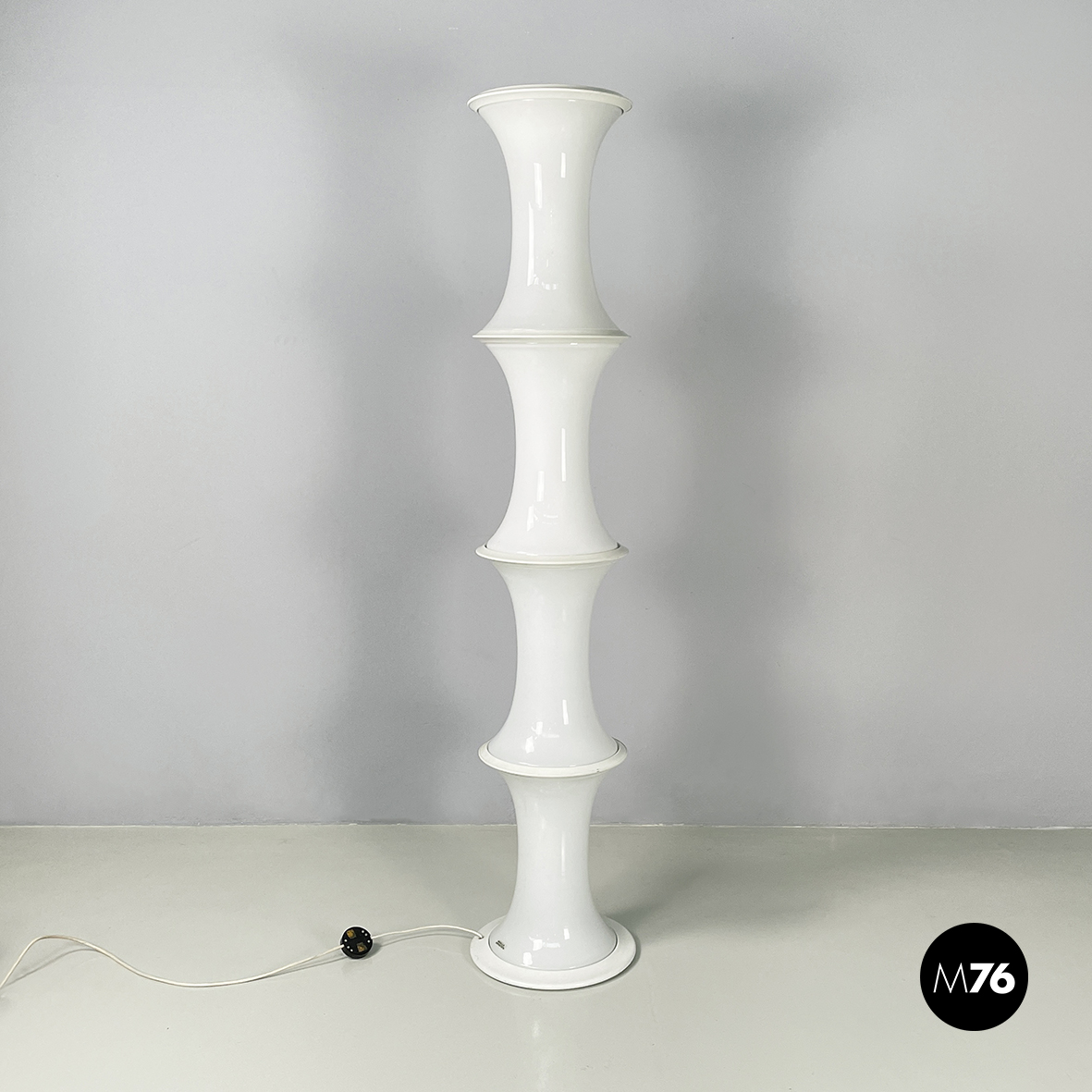 Lampada da terra modello Bamboo a base tonda. Il diffusore è composto da una serie di quattro parti in vetro opalino, leggermente più larghi agli estremi e più sottili al centro. I vetri sono divisi da parti a sezione tonda in metallo verniciato bianco.
